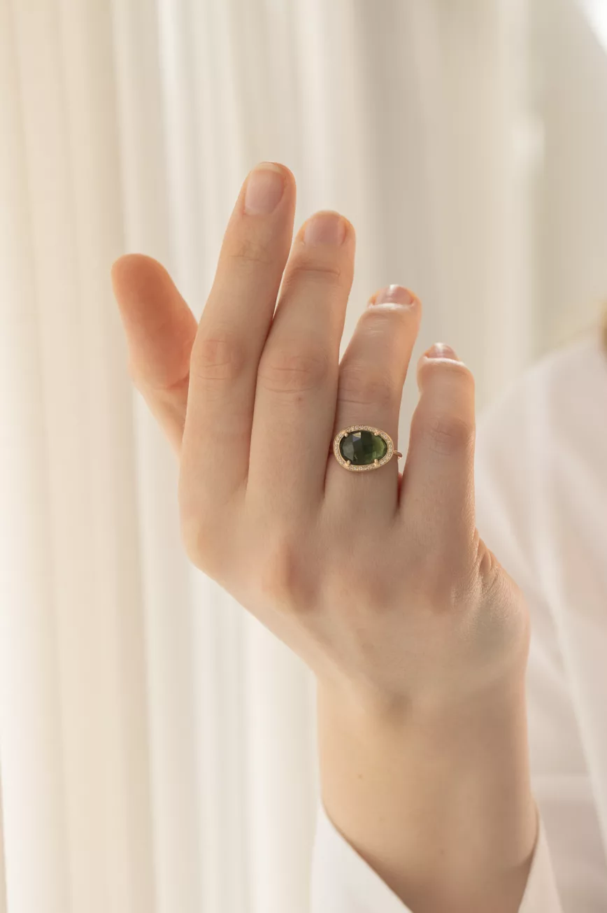 Green tourmaline moonstones & diamonds ring