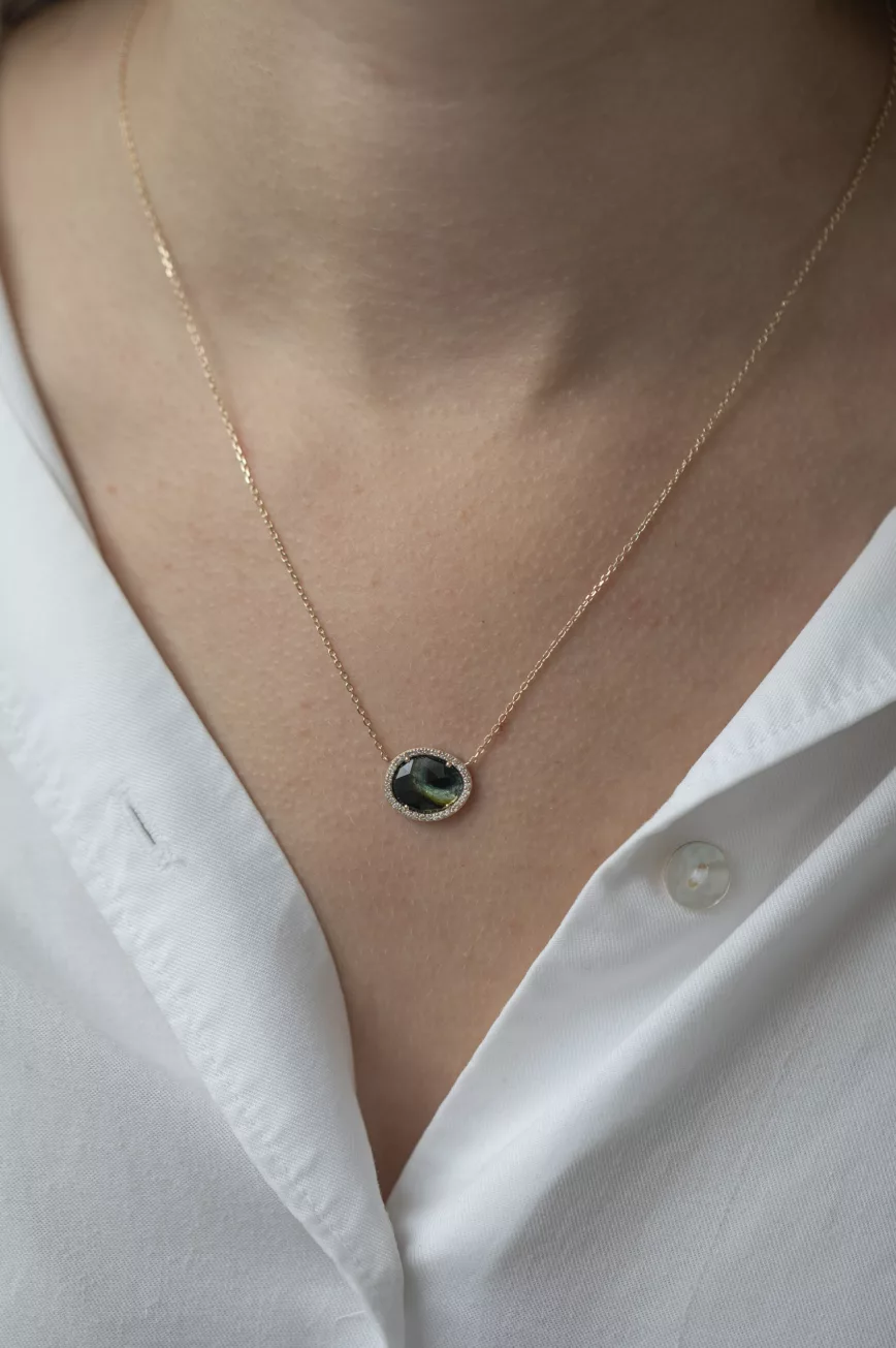 Green tourmaline & grey diamond with dangling detail necklace