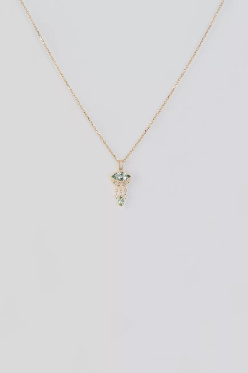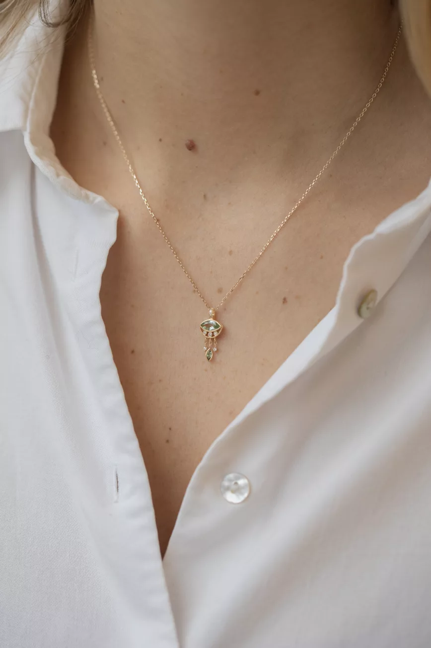 Light green tourmaline marquise eye and dangling diamonds necklace