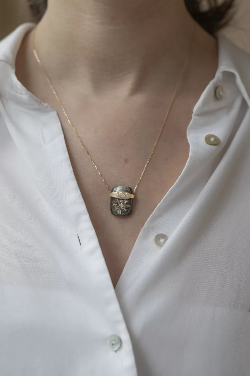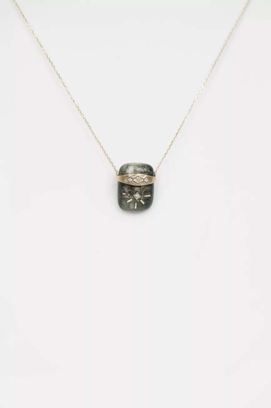 Green tourmaline and grey diamond with dangling detail necklace