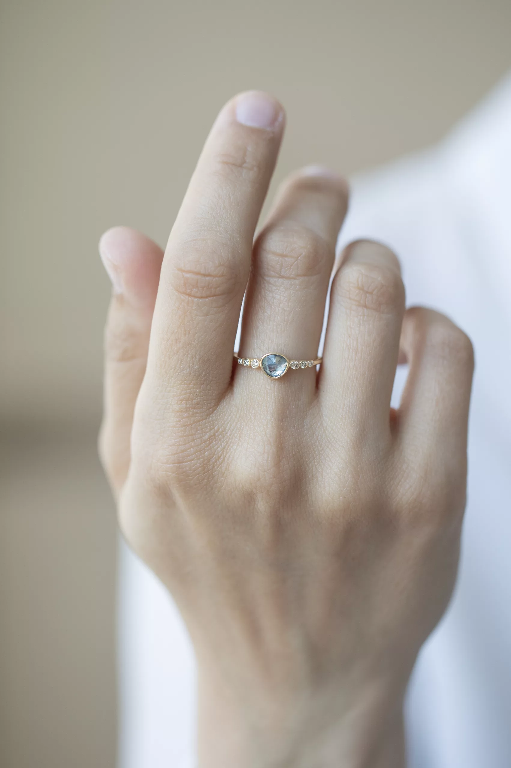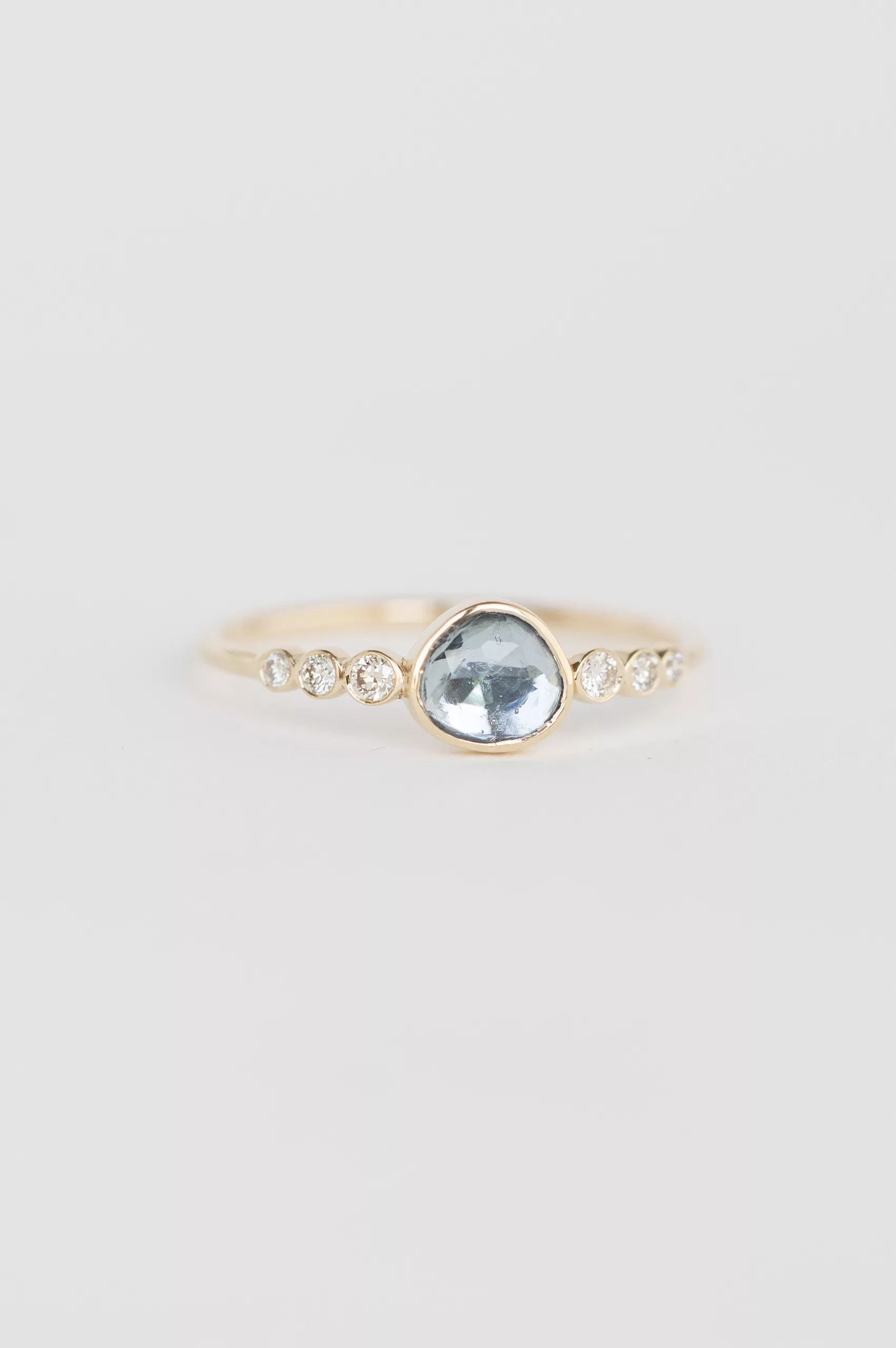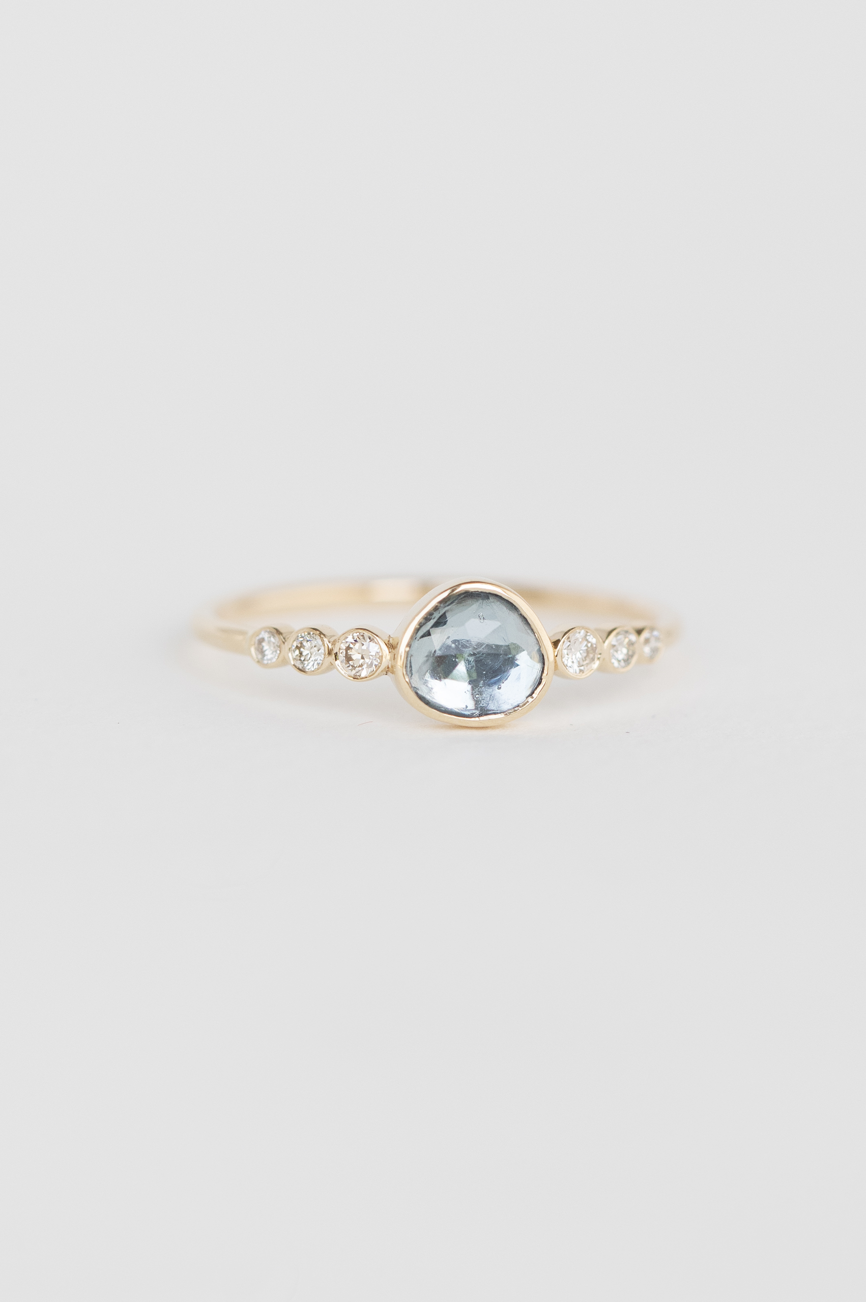 Celine Daoust 14k light yellow gold with one central blue aquamarine and six diamonds. The stone comes in a gradient of a light blue.