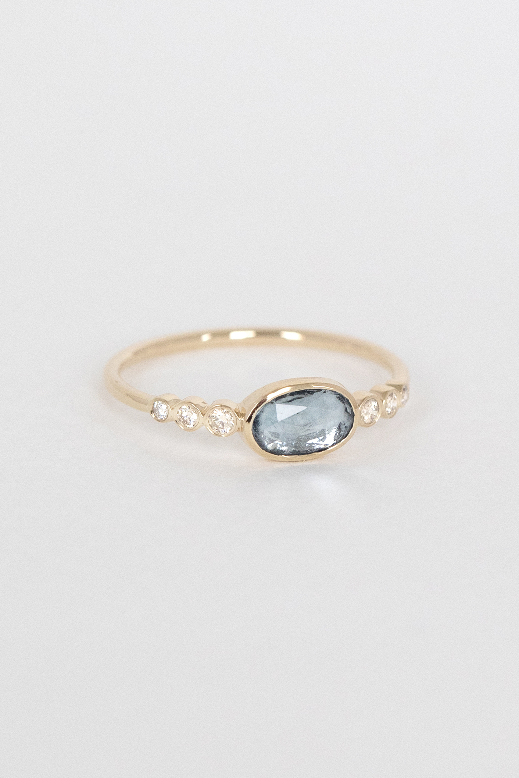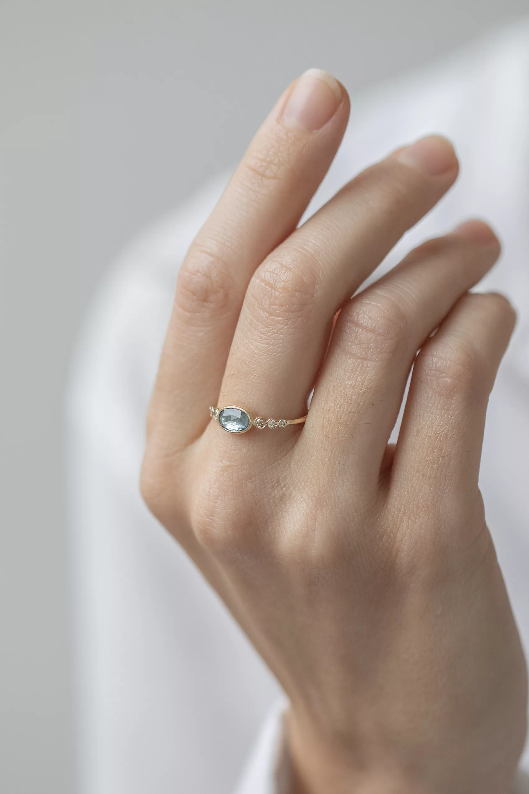 Celine Daoust 14k light yellow gold with one central blue aquamarine and six diamonds. The stone comes in a gradient of a light blue.
