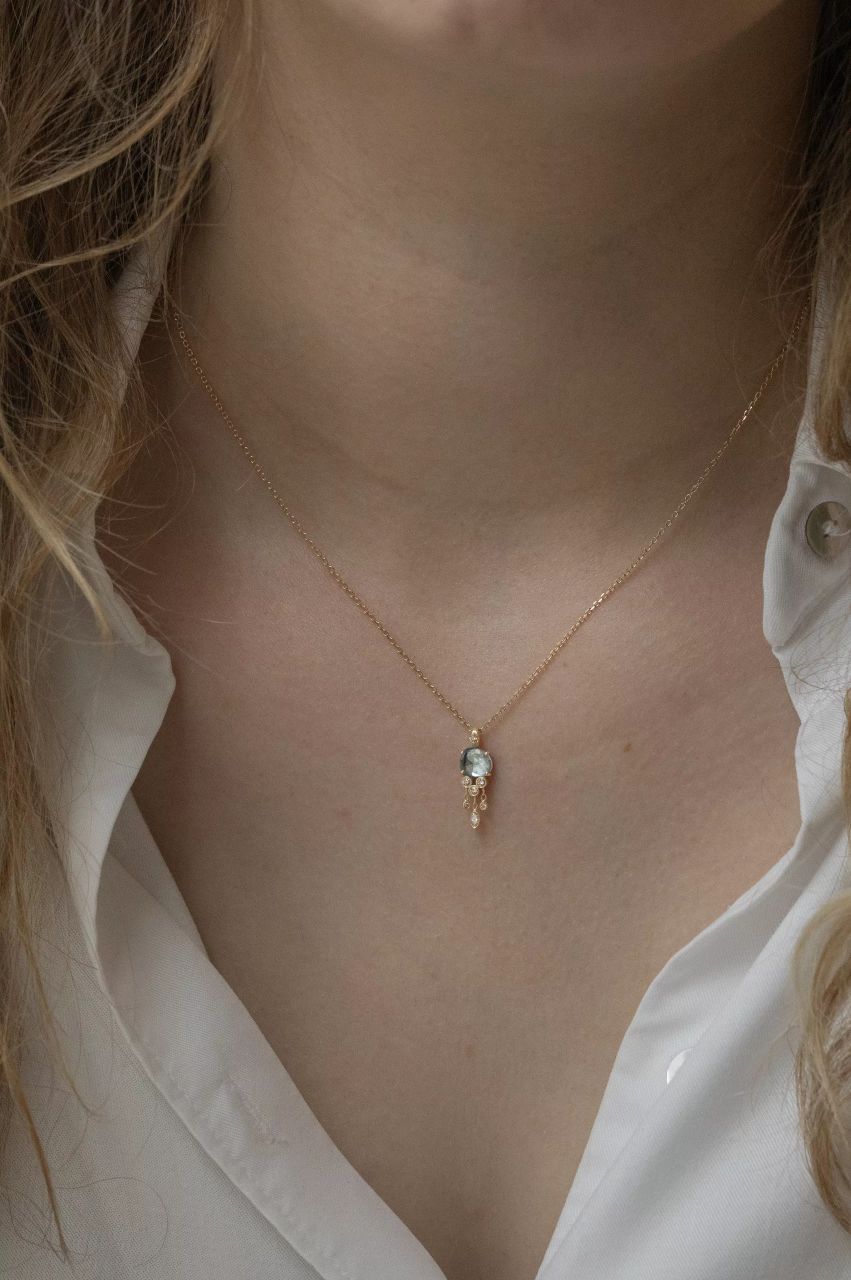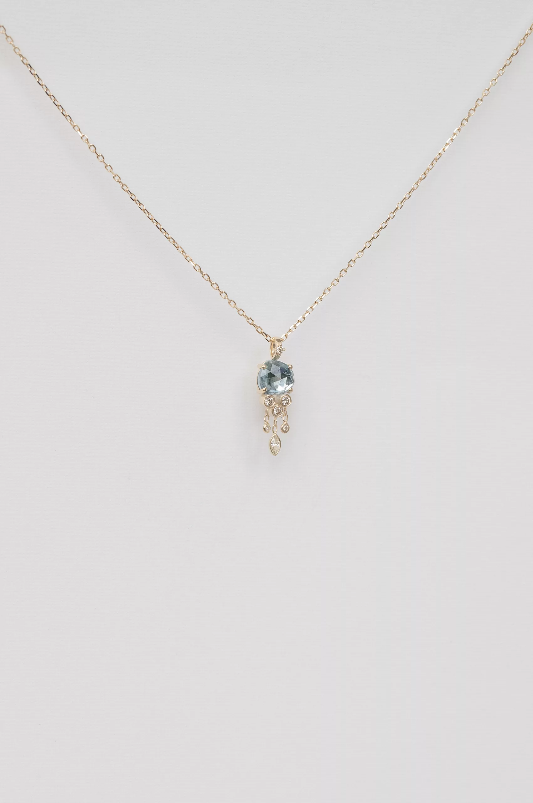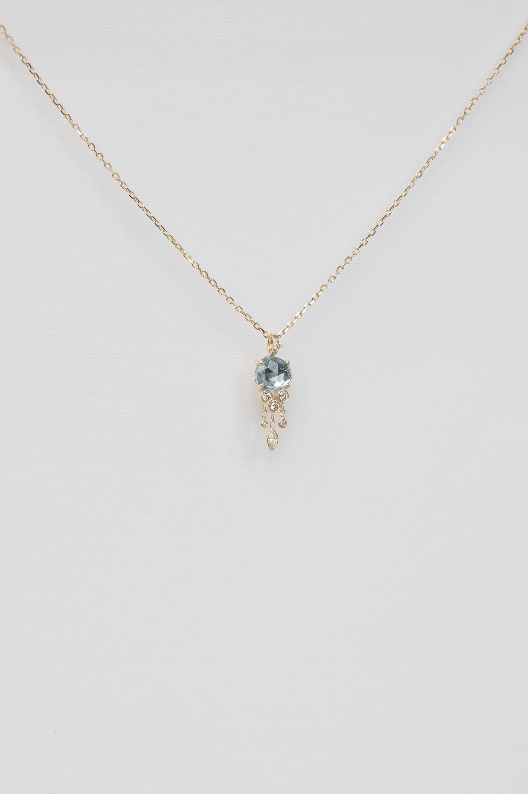 Céline Daoust 14k light yellow gold chain jellyfish necklace with one aquamarine and dangling diamonds. The stone comes in a gradient of blue.