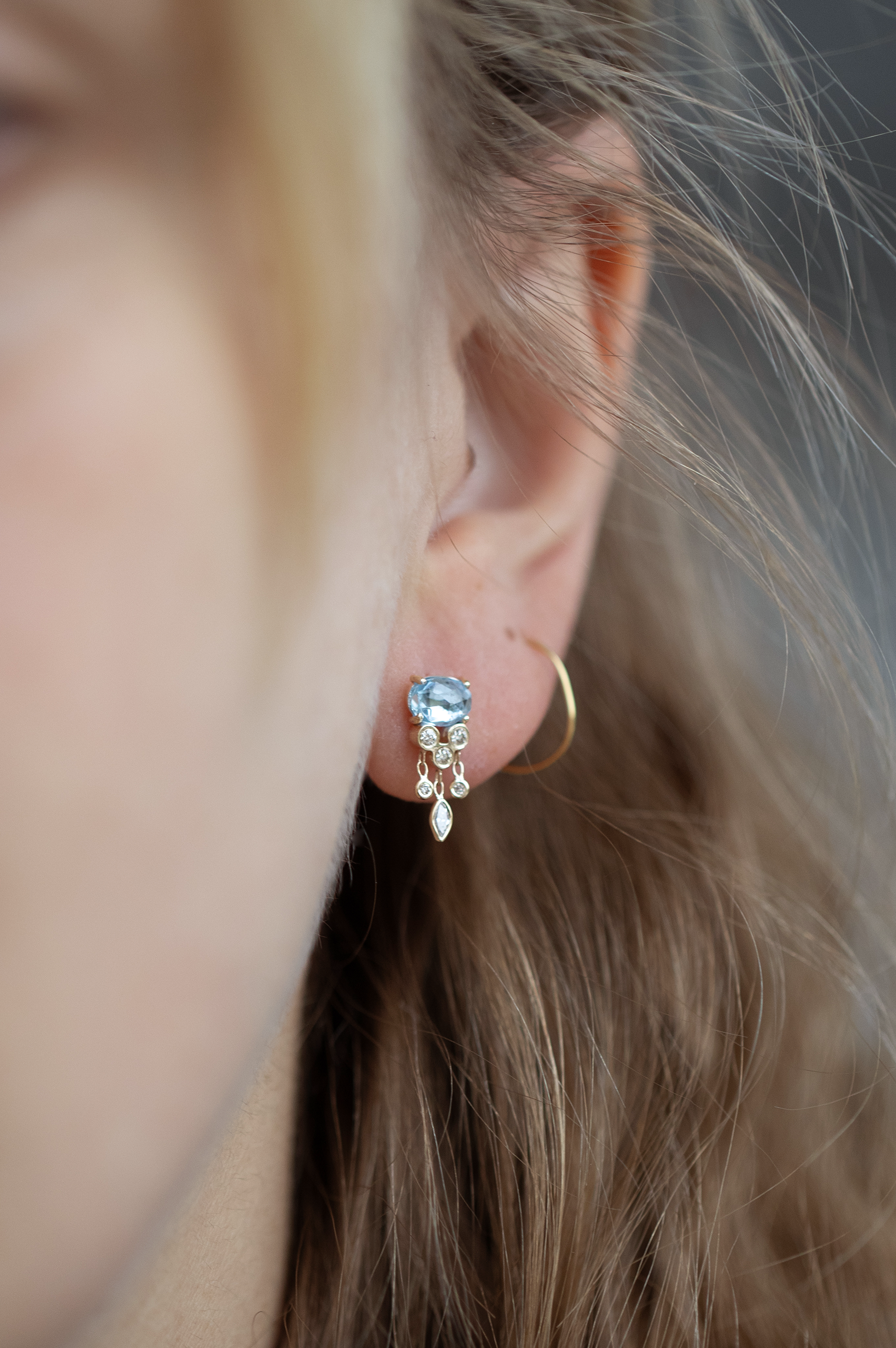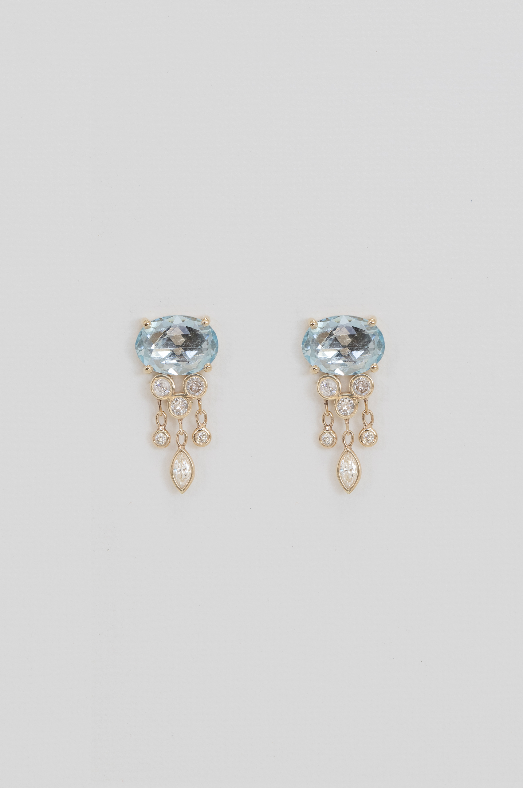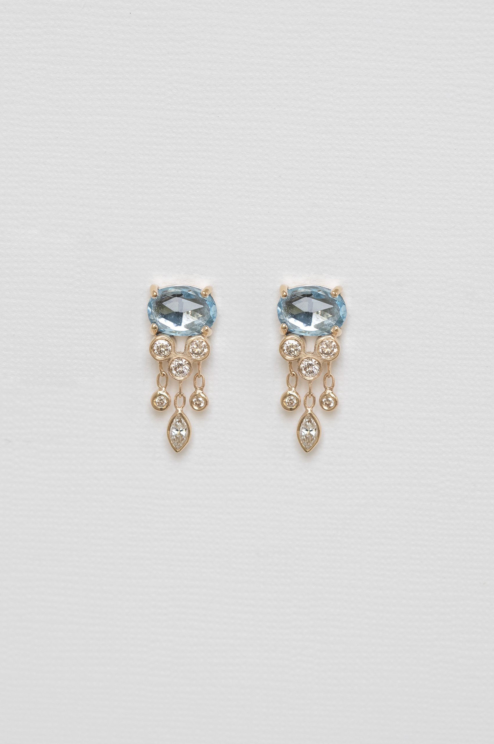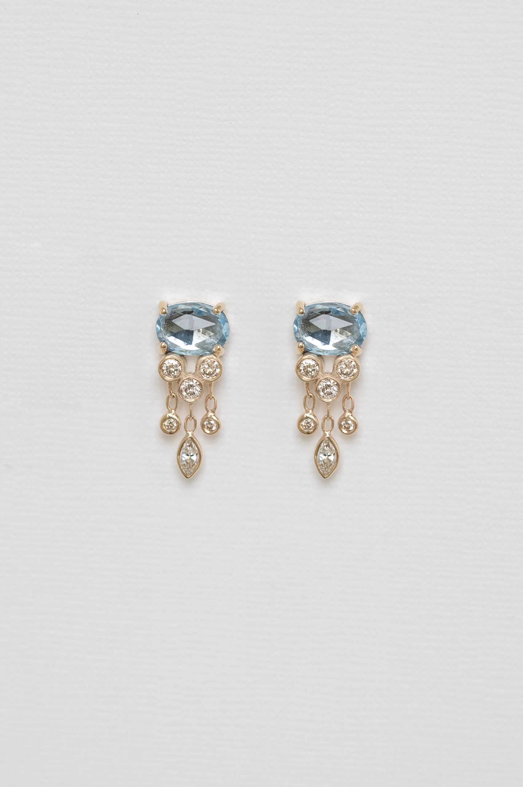 Celine Daoust 14k light yellow gold aquamarine & dangling diamonds jellyfish earrings. The stones comes in a gradient of light blue.