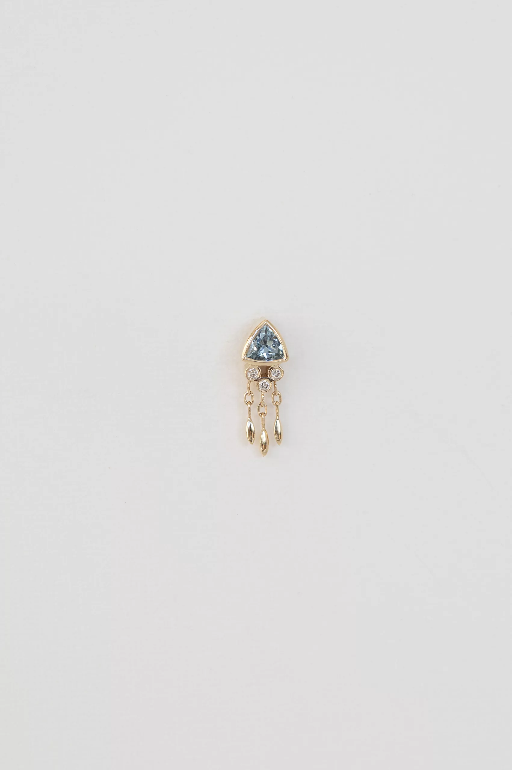 Celine Daoust 14k light yellow gold earring with one dark blue aquamarine, diamonds and dangling details.