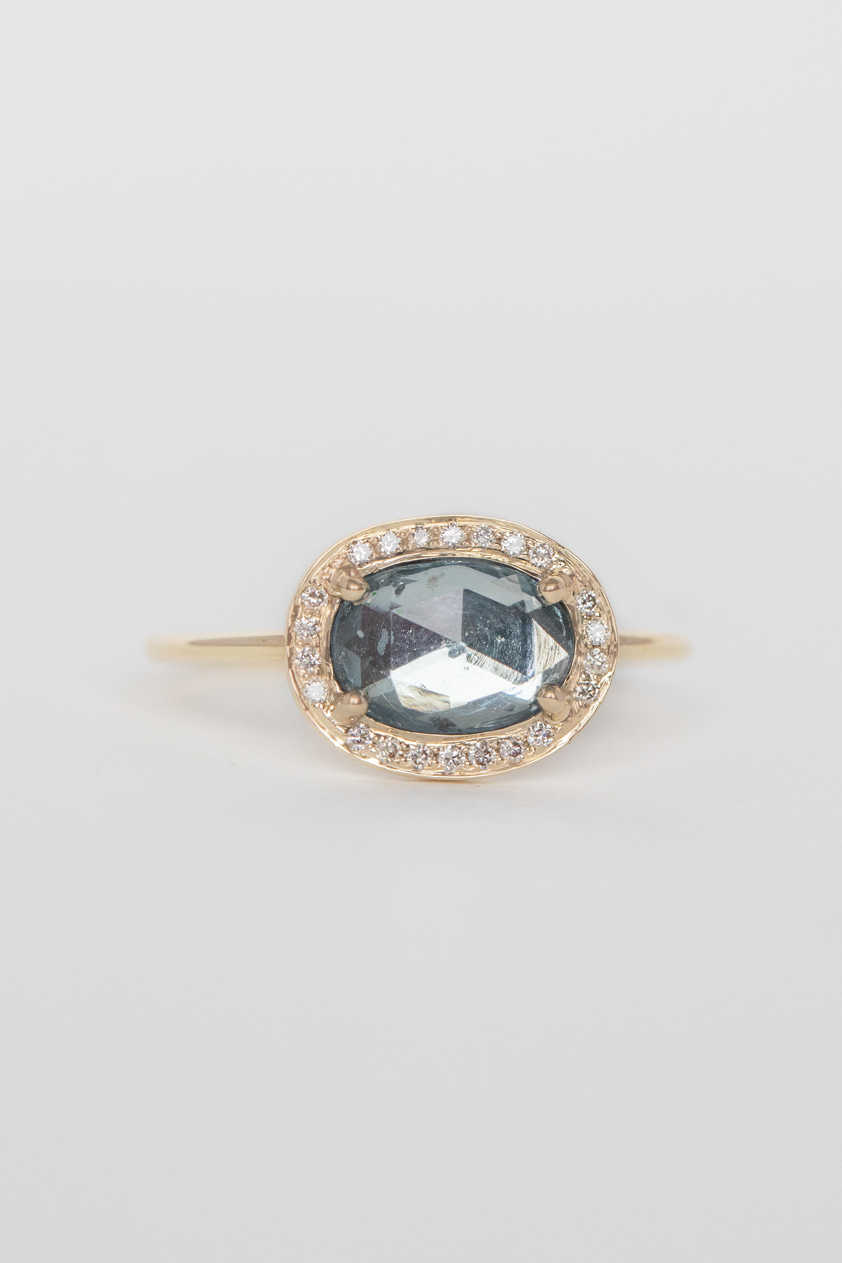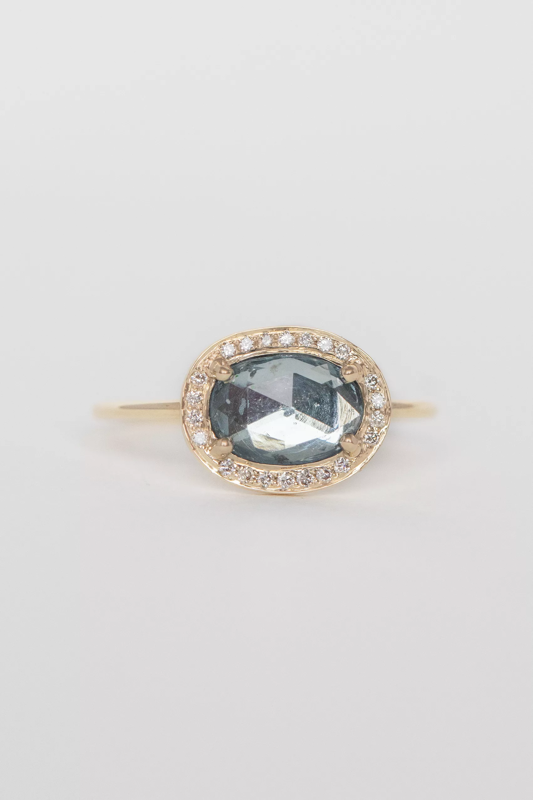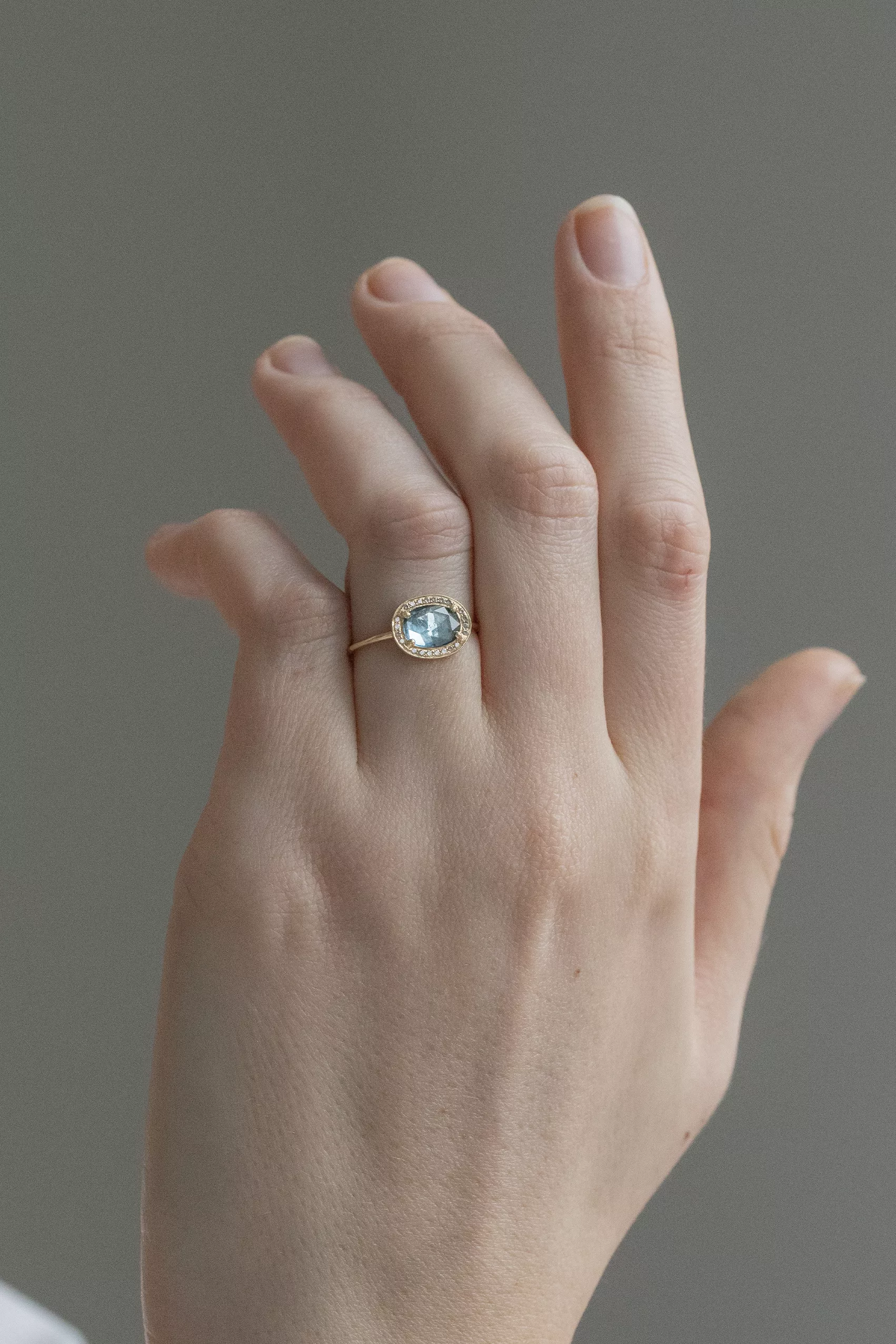 Céline Daoust 14k light yellow gold ring with one aquamarine surrounded by diamonds. The stone comes in a gradient of light blue.