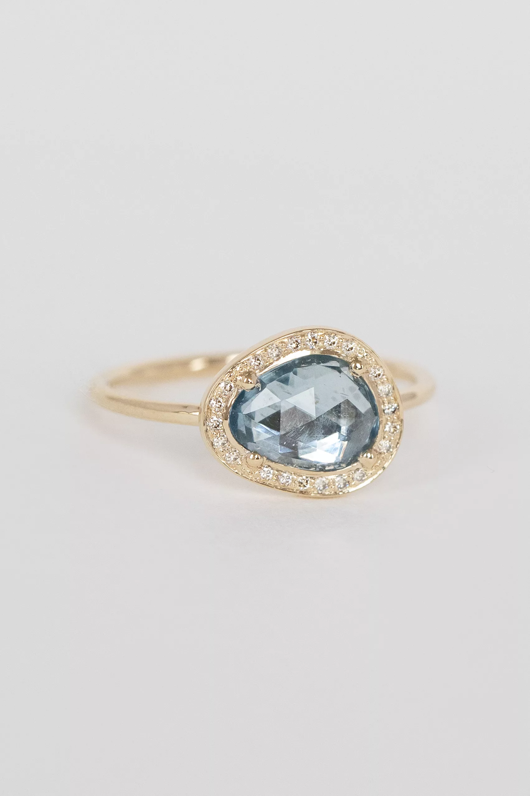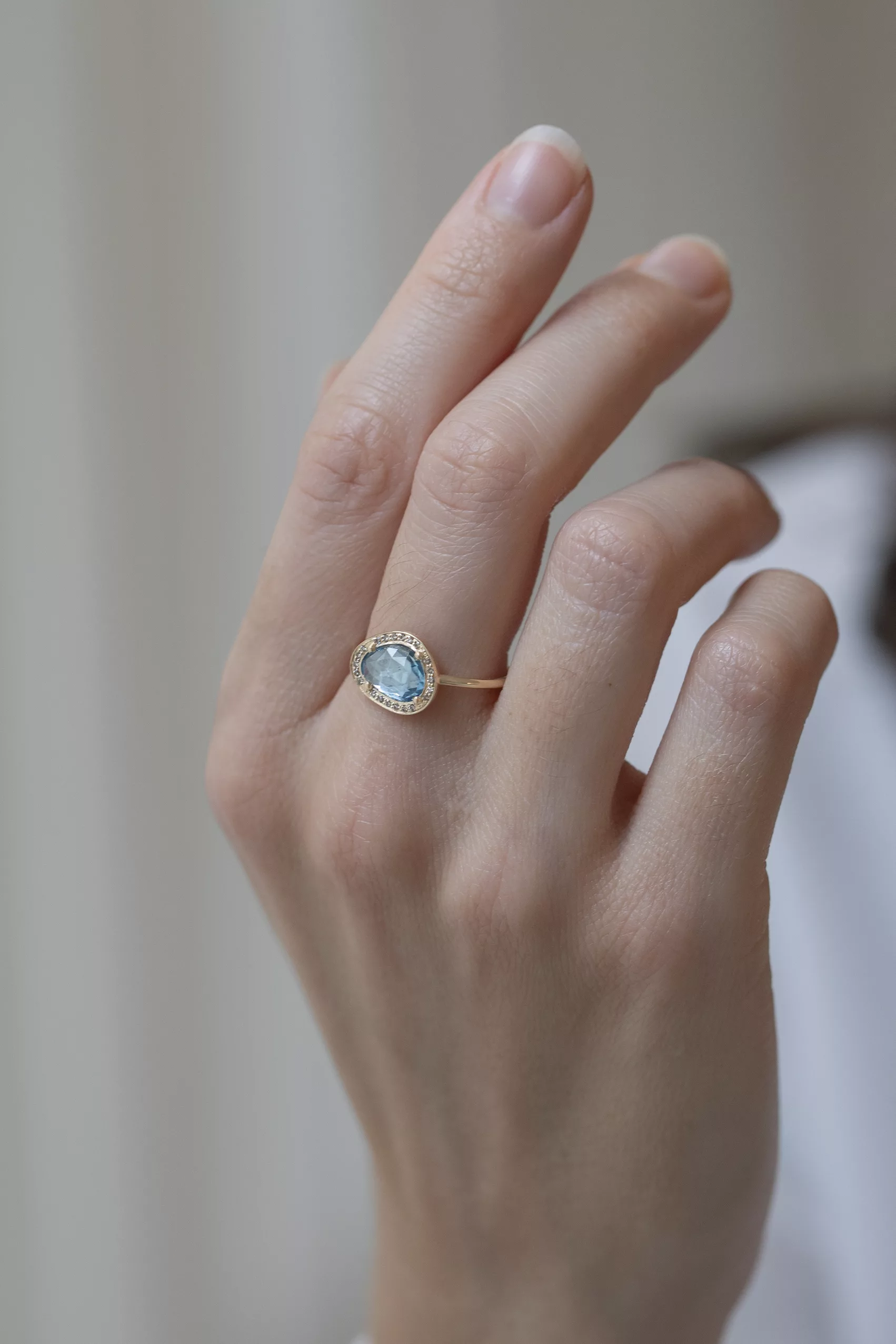 Celine Daoust 14k light yellow gold stella ring with an aquamarine surrounded by diamonds. The stone is a gradient of light blue.