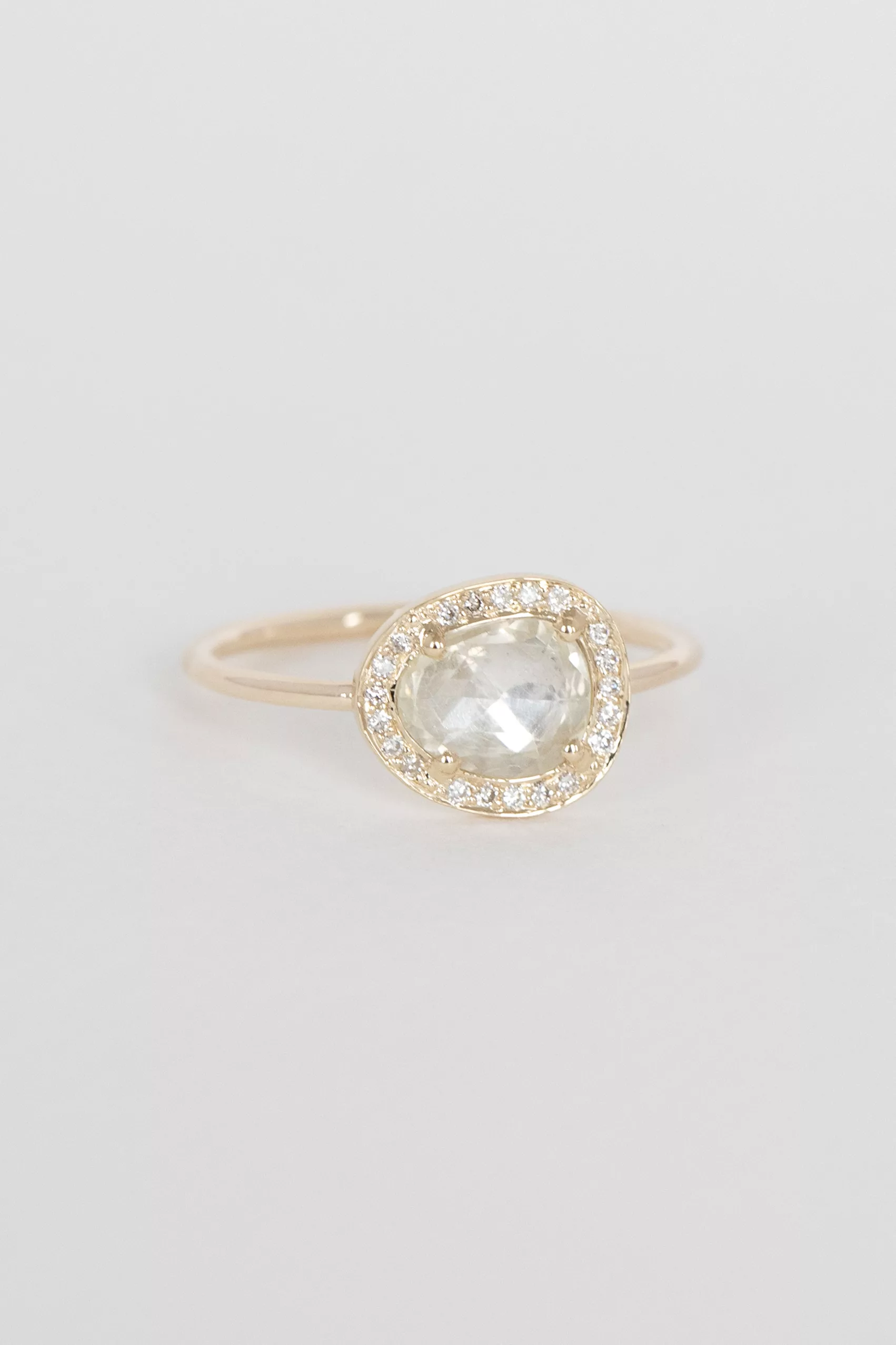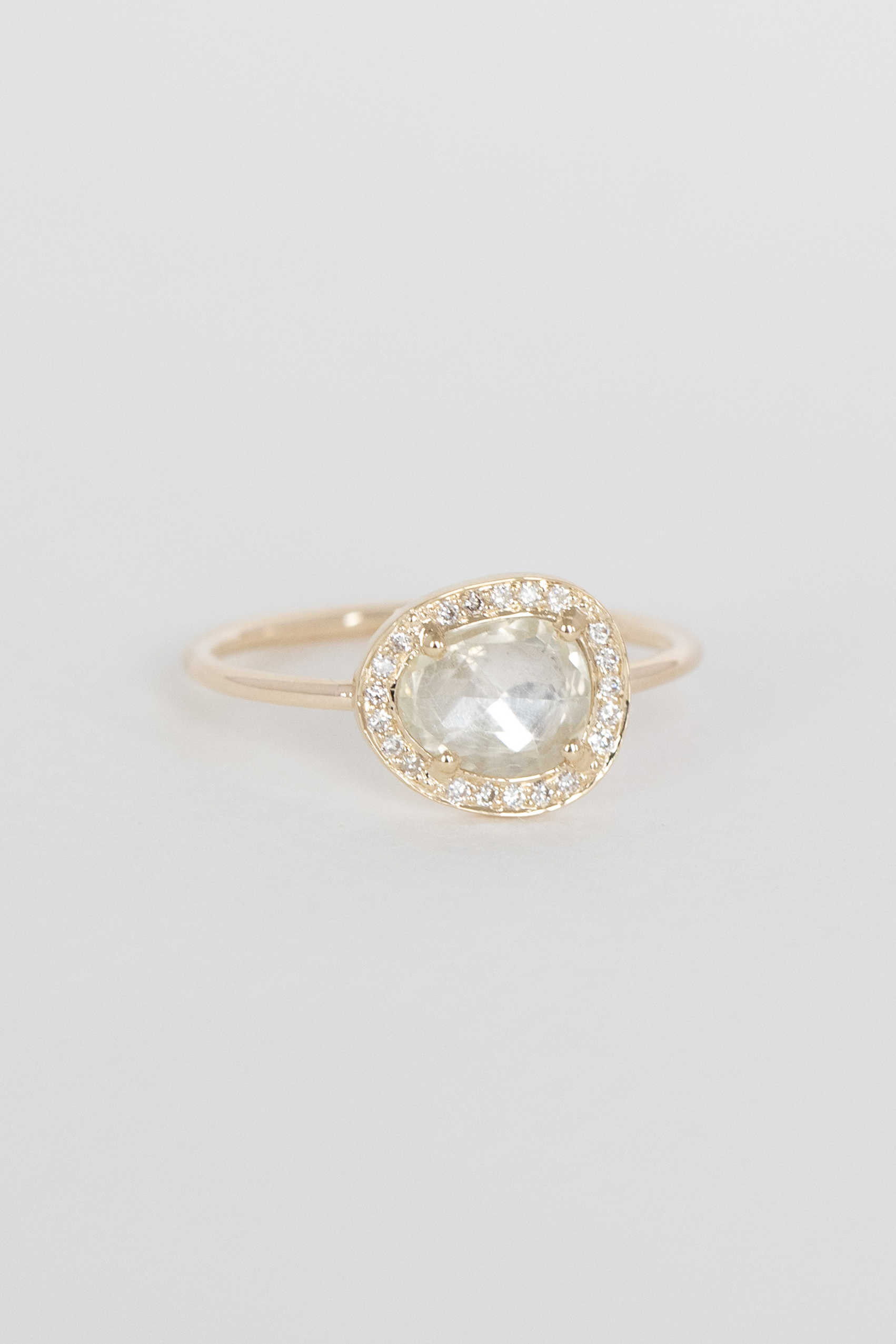 Céline Daoust 14k light yellow gold ring with a light yellow sapphire surrounded by diamonds. The stone comes in a gradient of very light yellow.