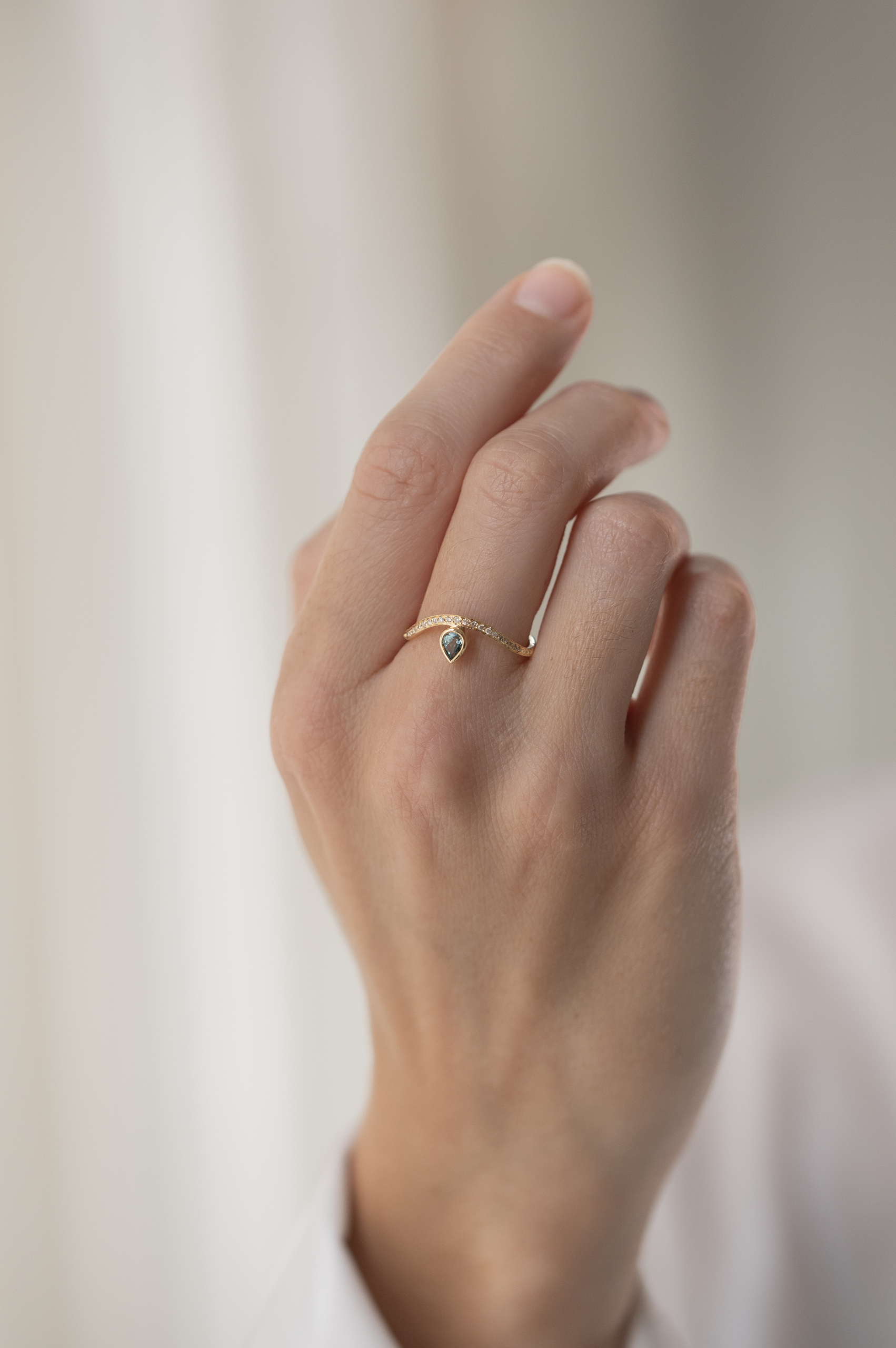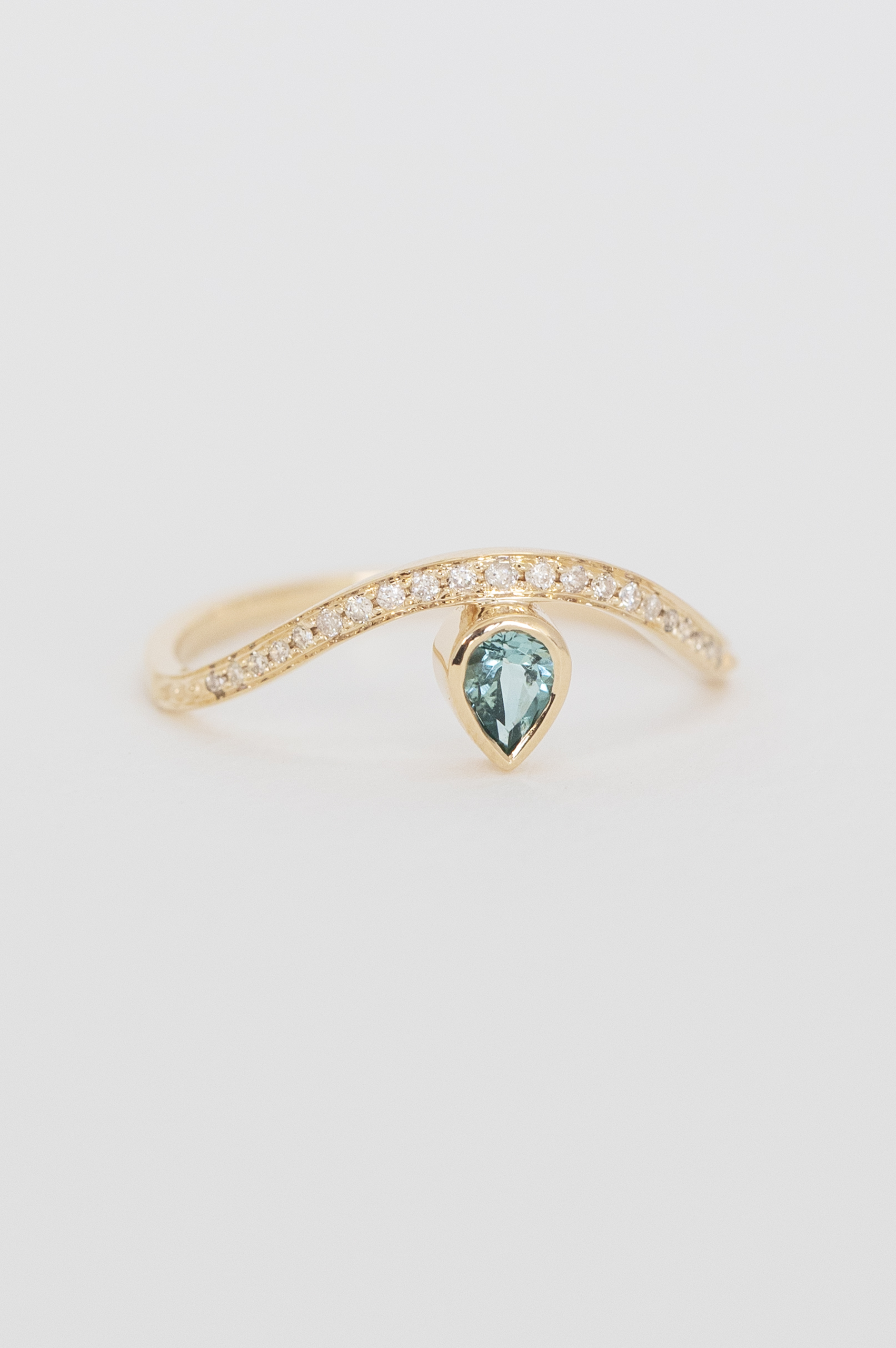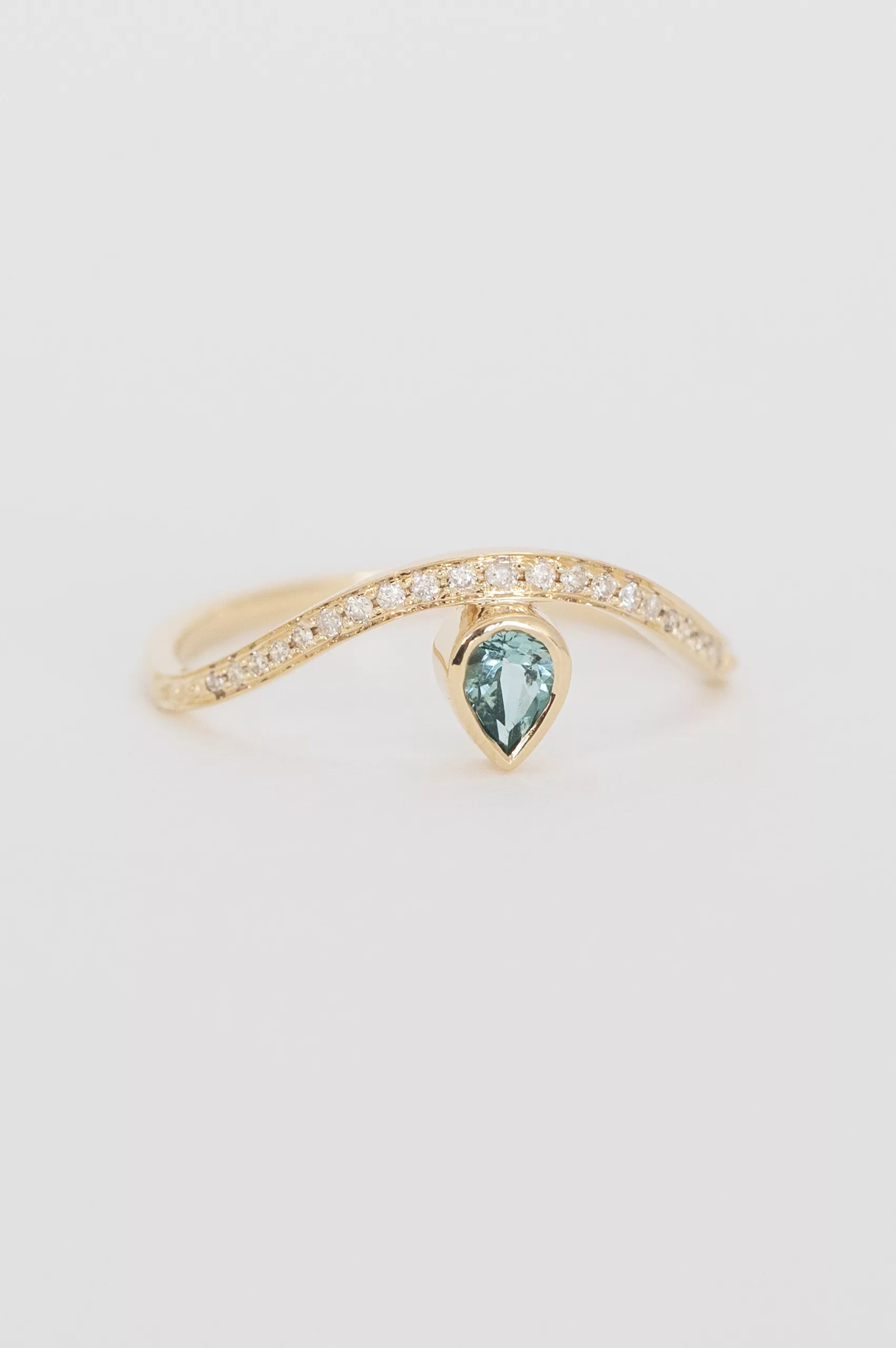 Celine Daoust 14k light yellow gold ring with a blue tourmaline on a gold wave with diamonds. The stone comes in a gradient of blue and turquoise.