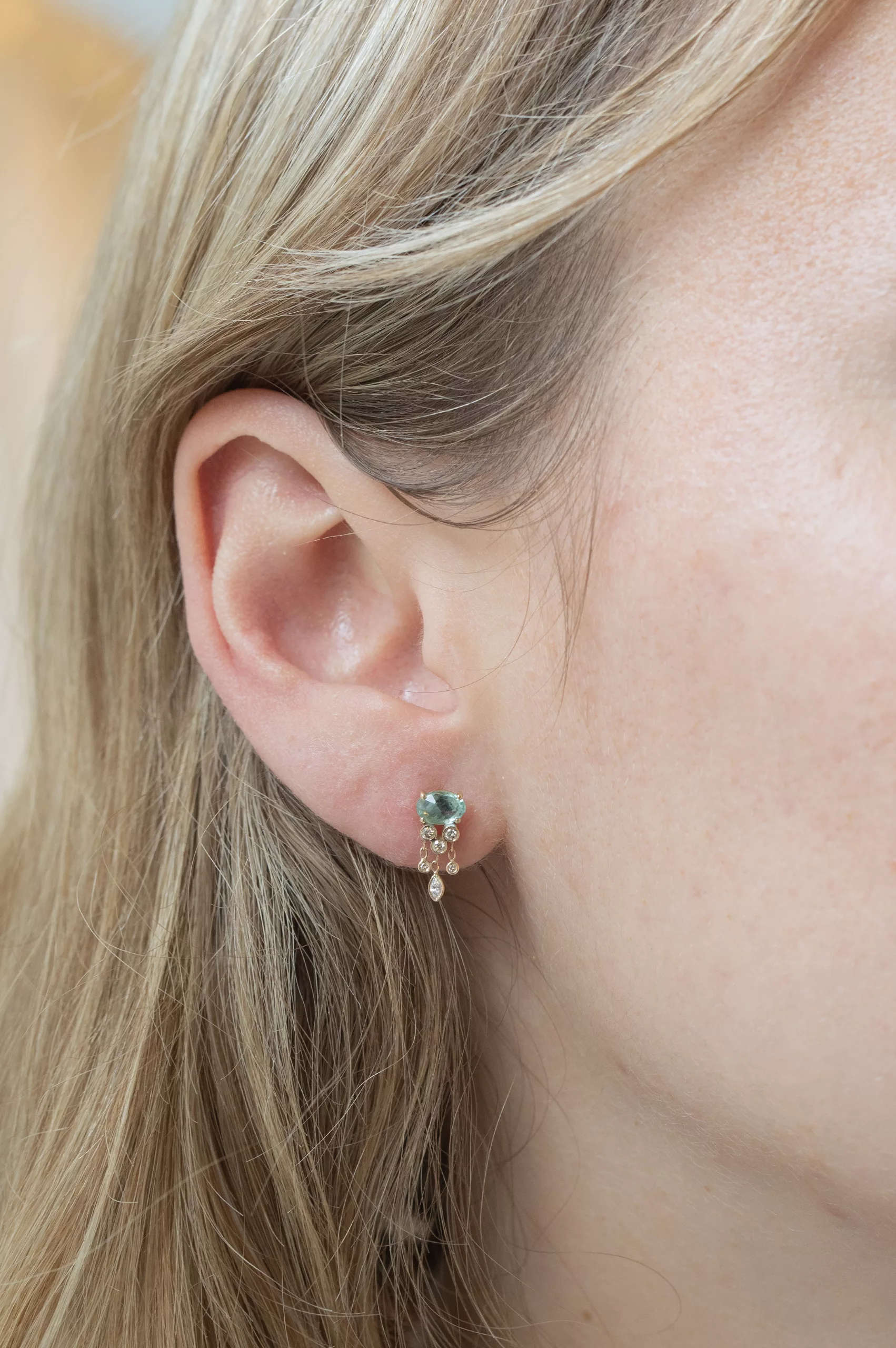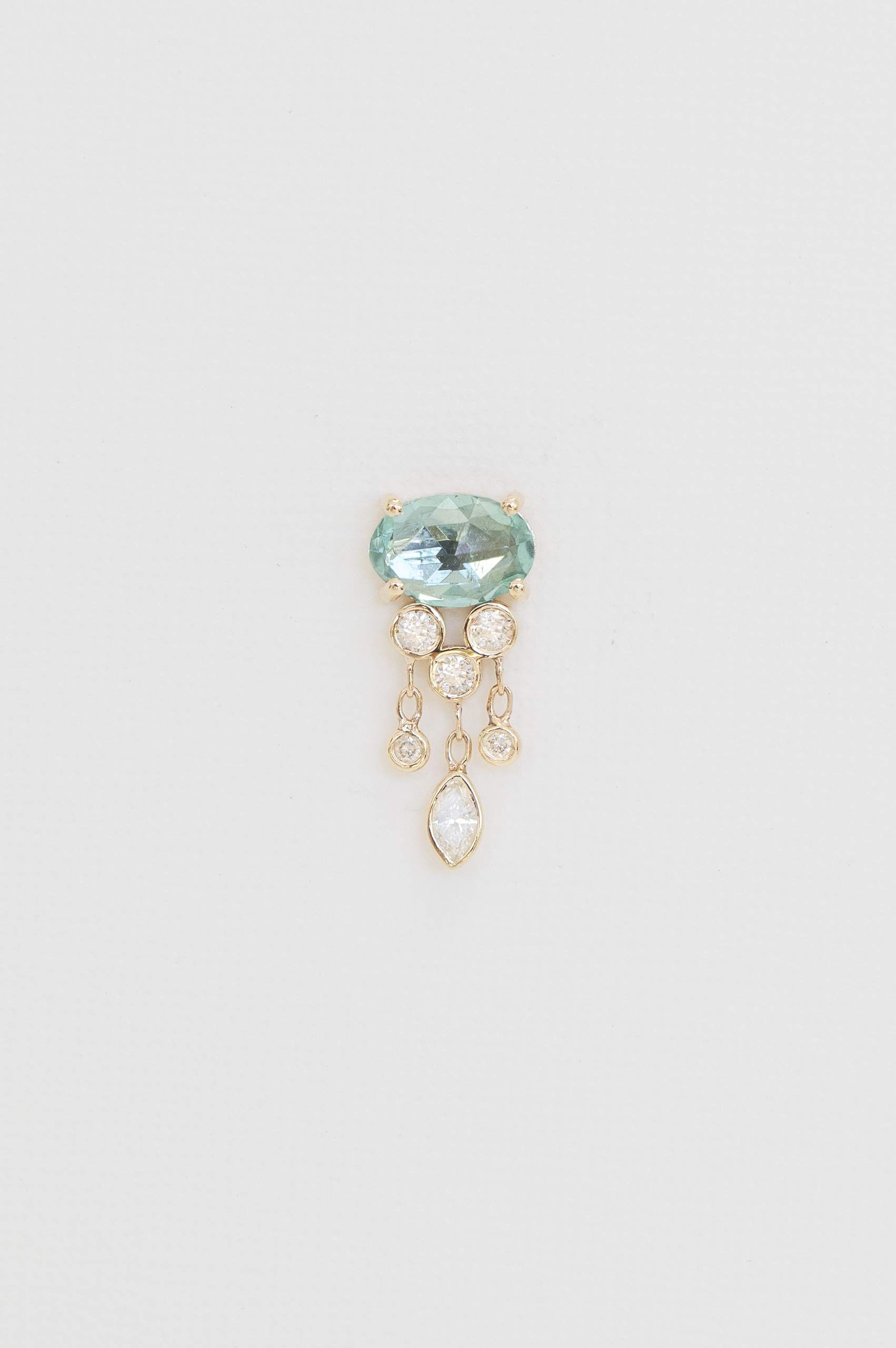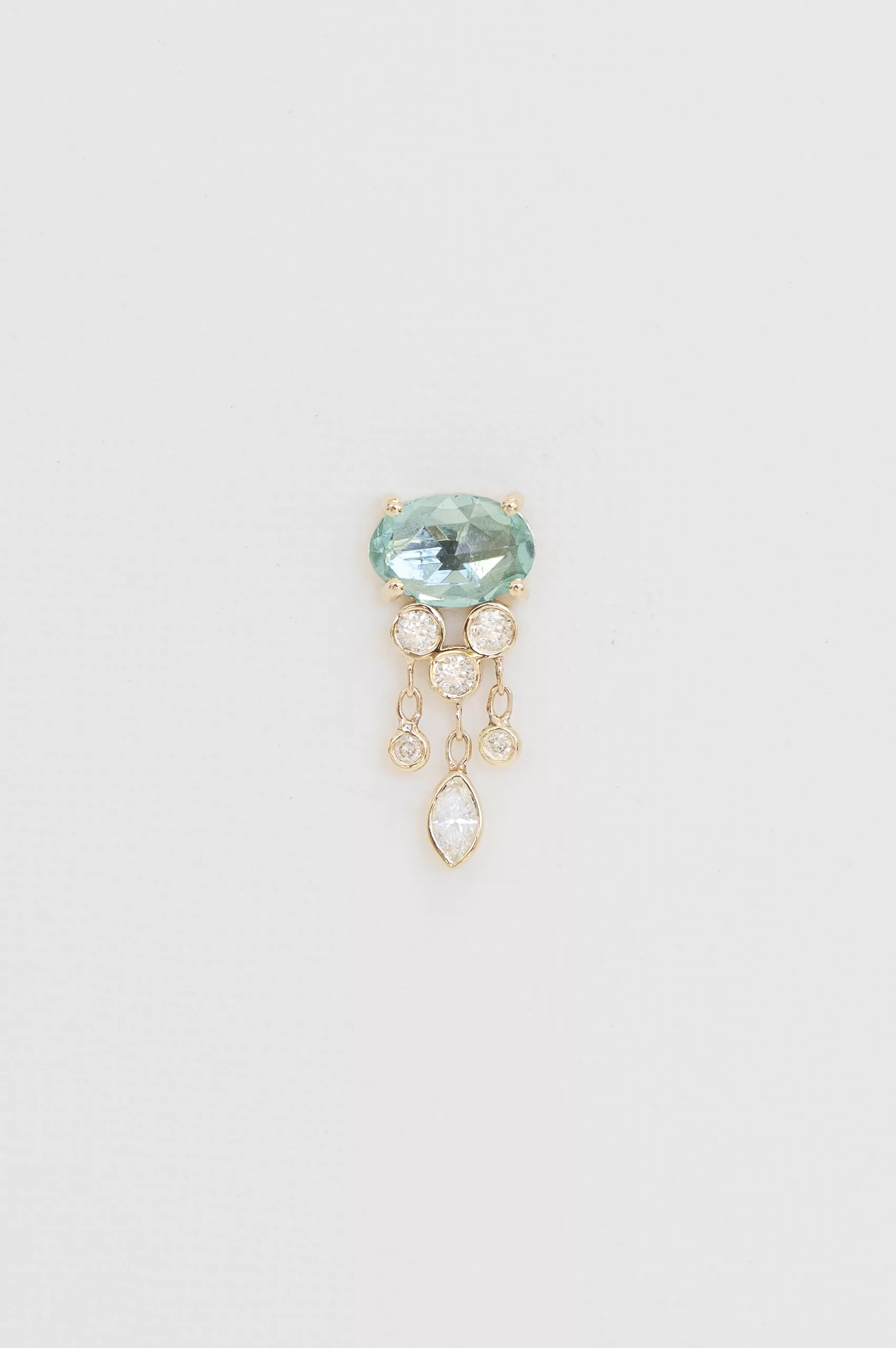 Celine Daoust 14k light yellow gold blue tourmaline & dangling diamonds jellyfish single earring. The stone comes in a gradient of light blue.