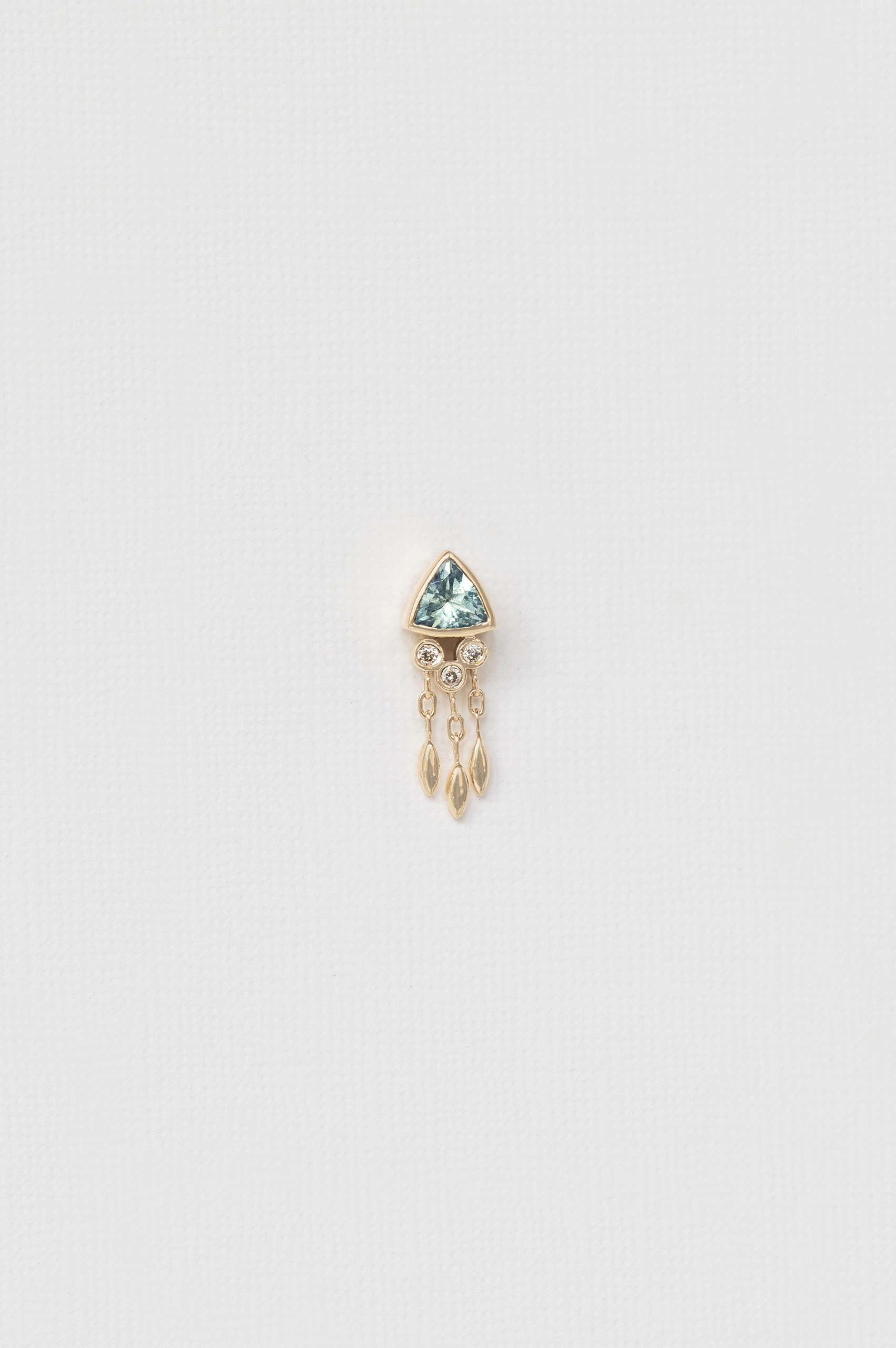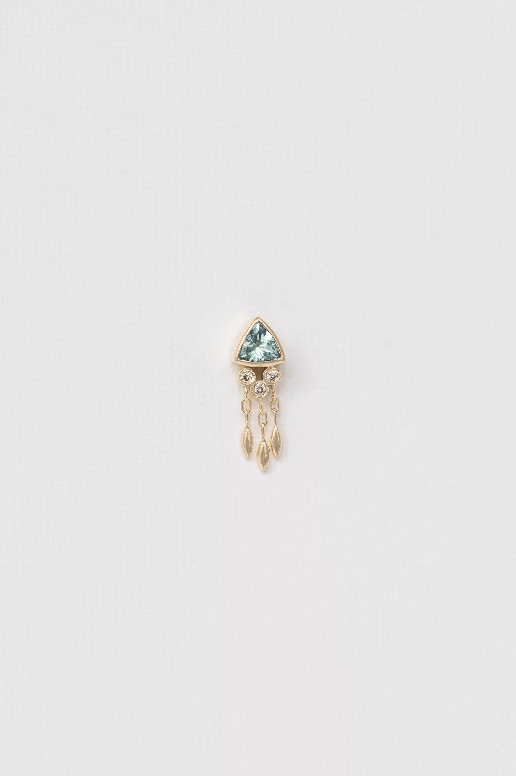 Celine Daoust 14kt light yellow gold earring with one light blue tourmaline, diamonds and dangling details. The stone comes in a gradient of light blue.