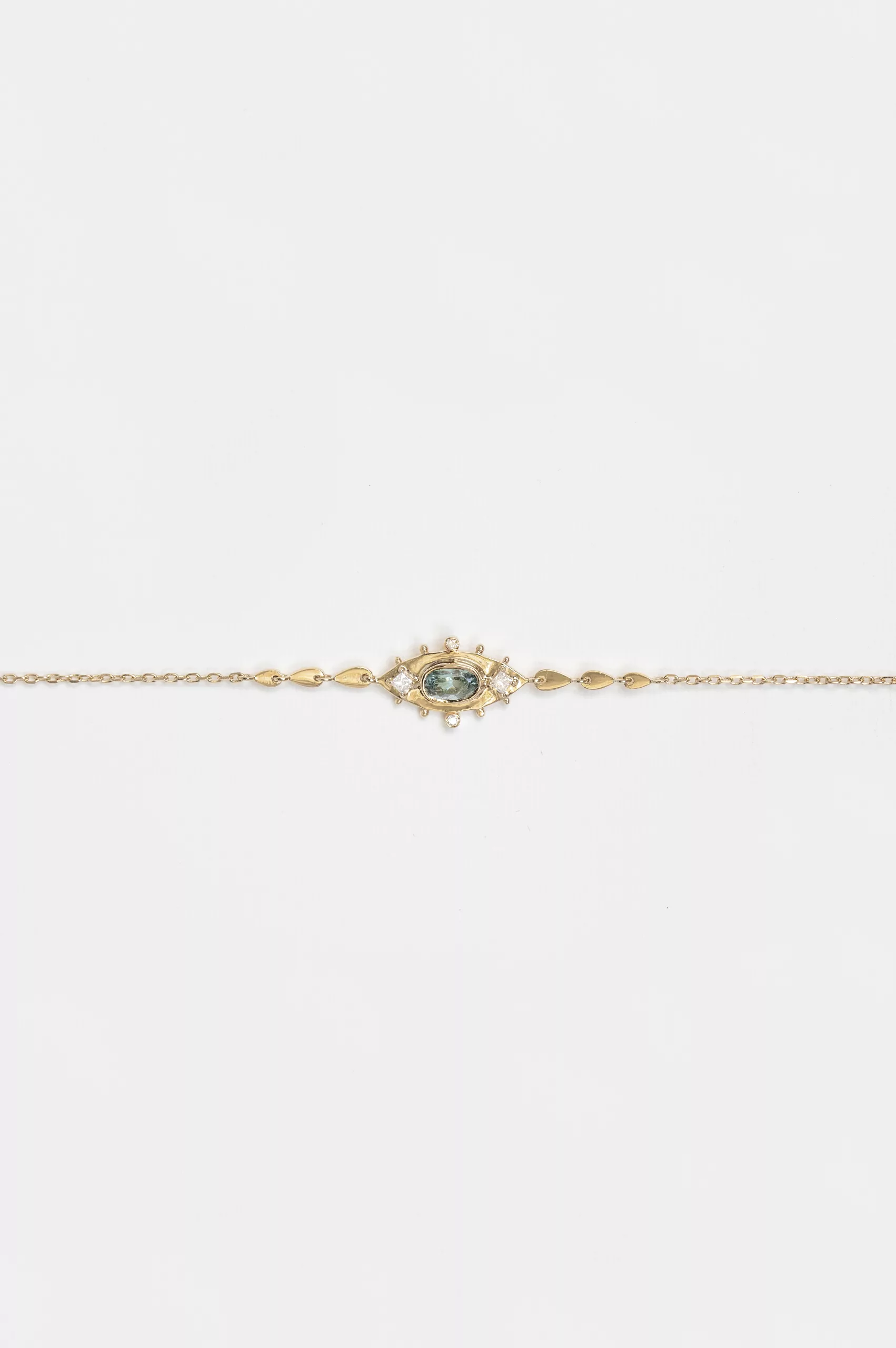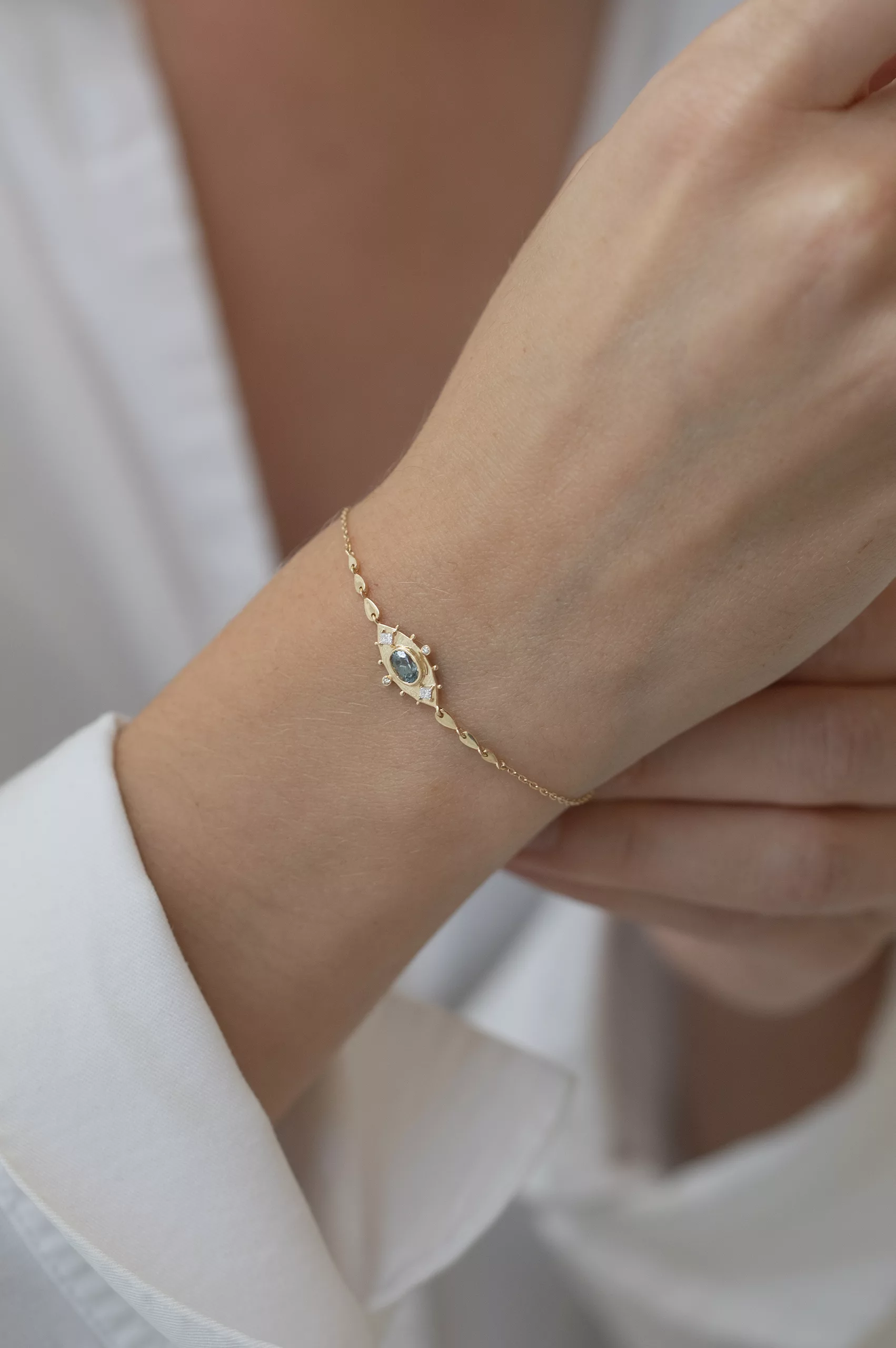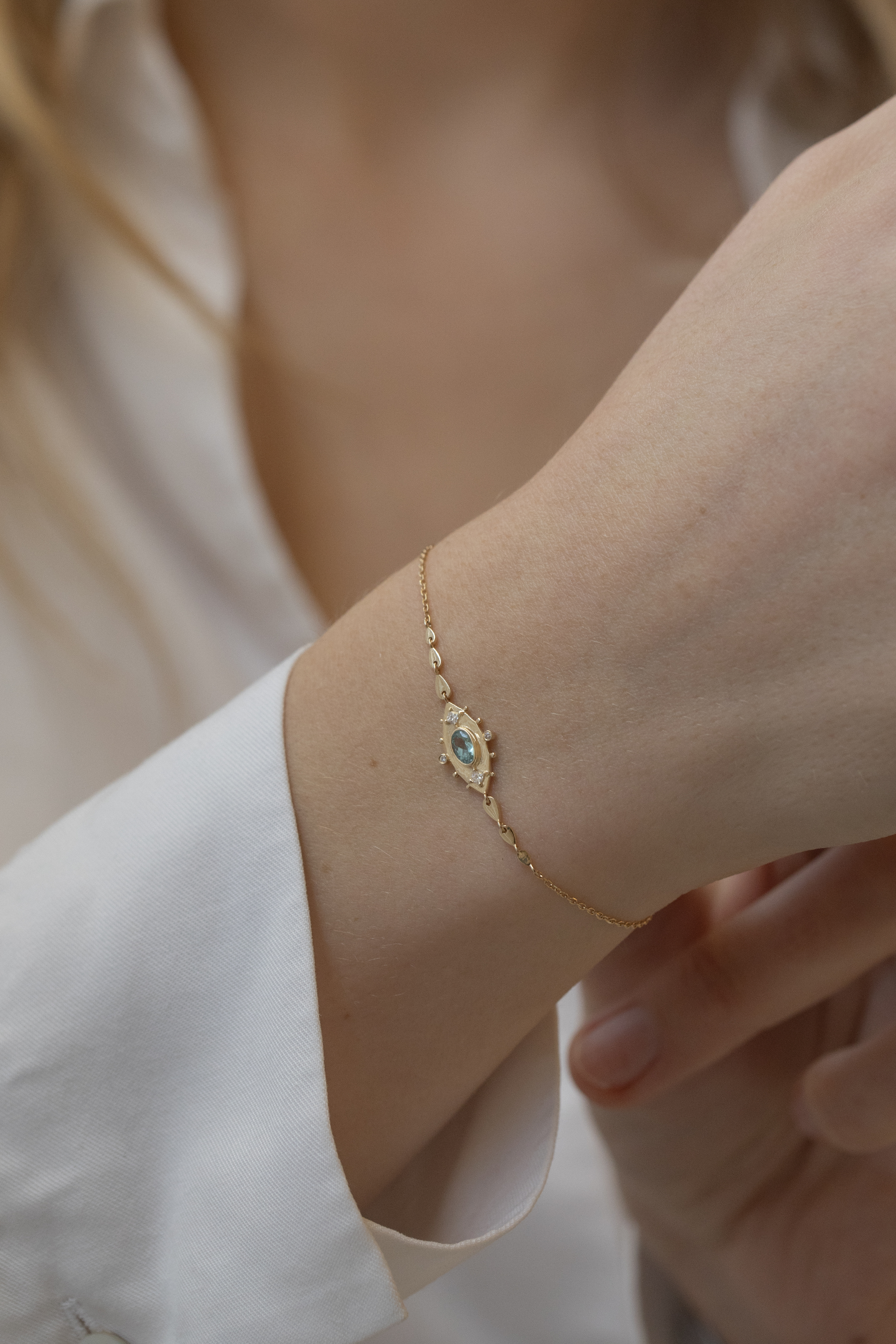 Celine Daoust 14k light yellow gold chain blue tourmaline eye and diamond bracelet. The stone comes in a gradient of light blue.