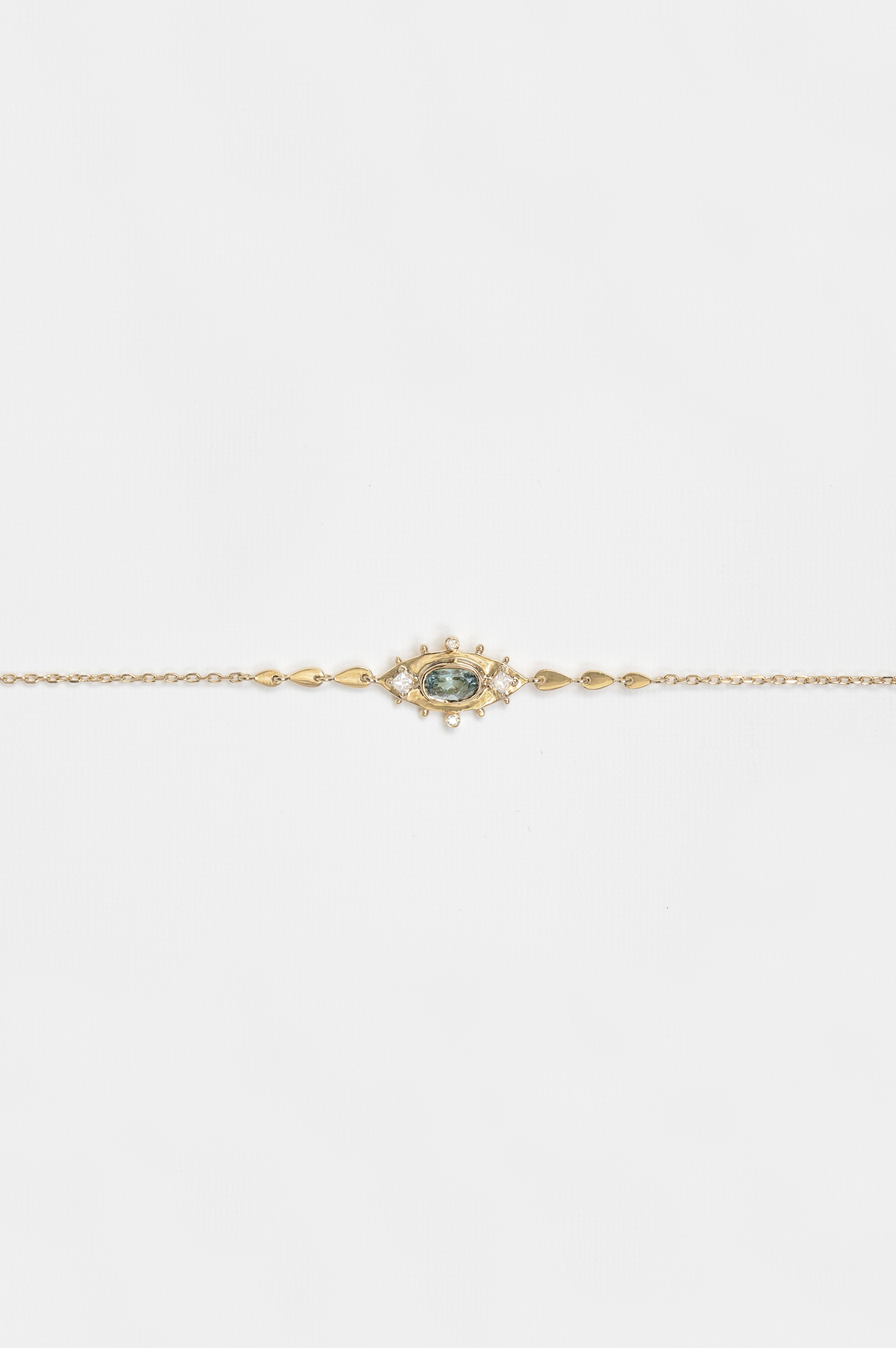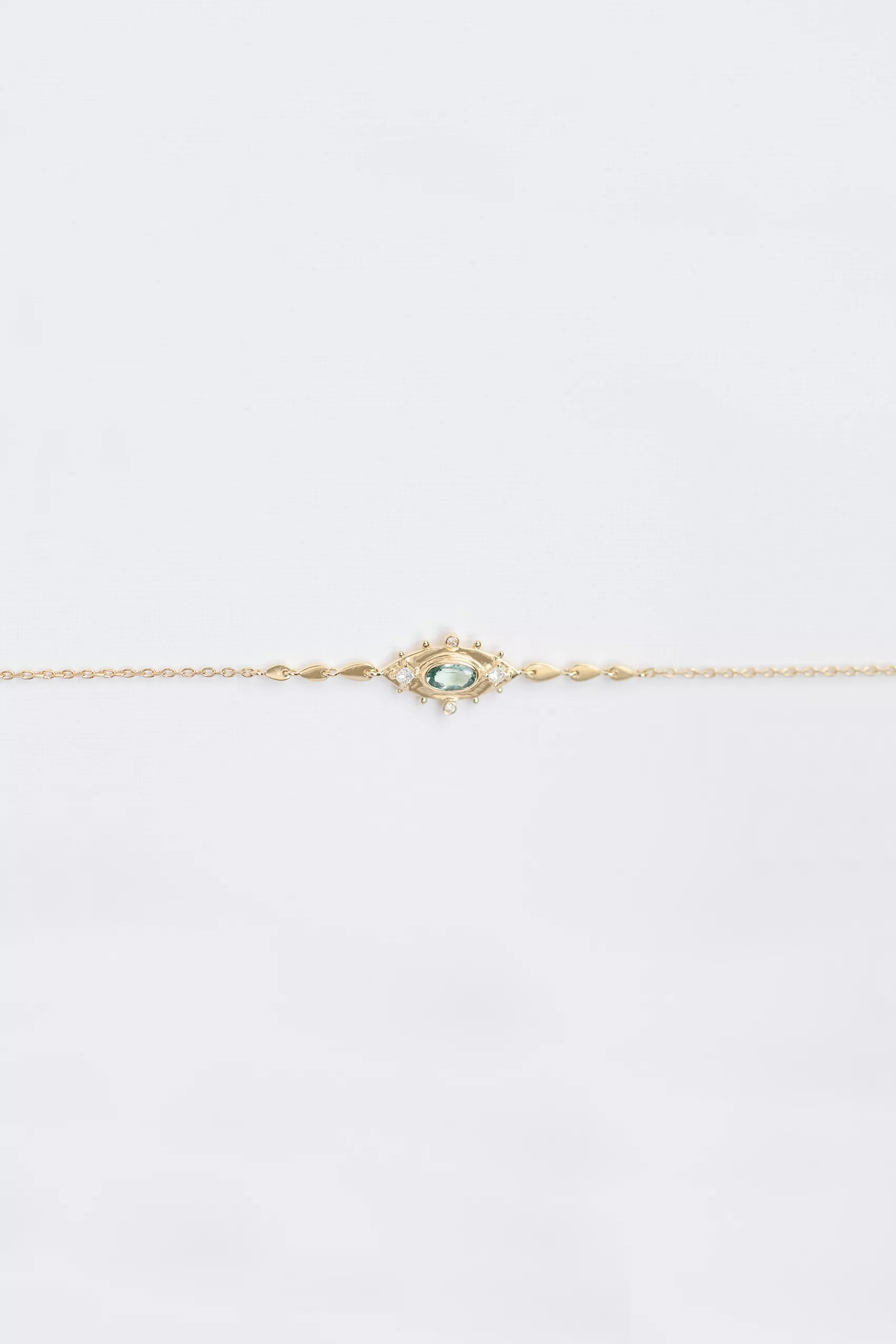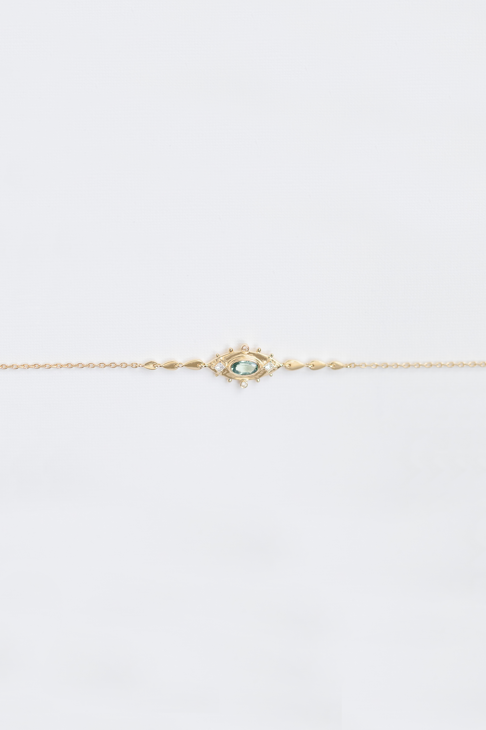 Celine Daoust 14k light yellow gold chain blue tourmaline eye and diamond bracelet. The stone comes in a gradient of light blue.