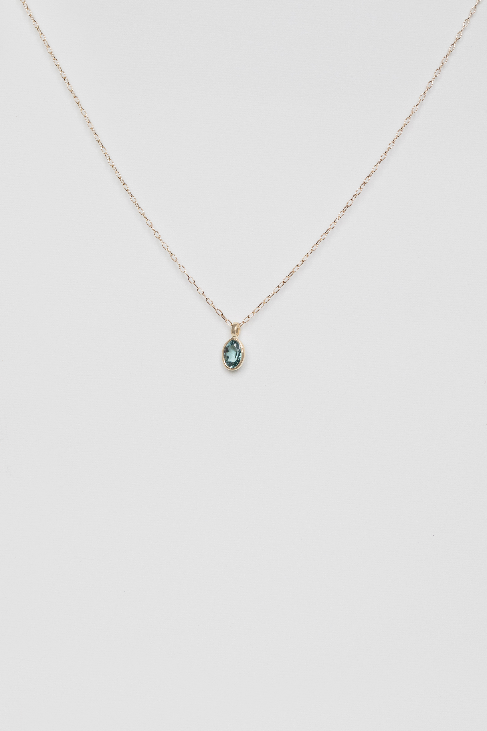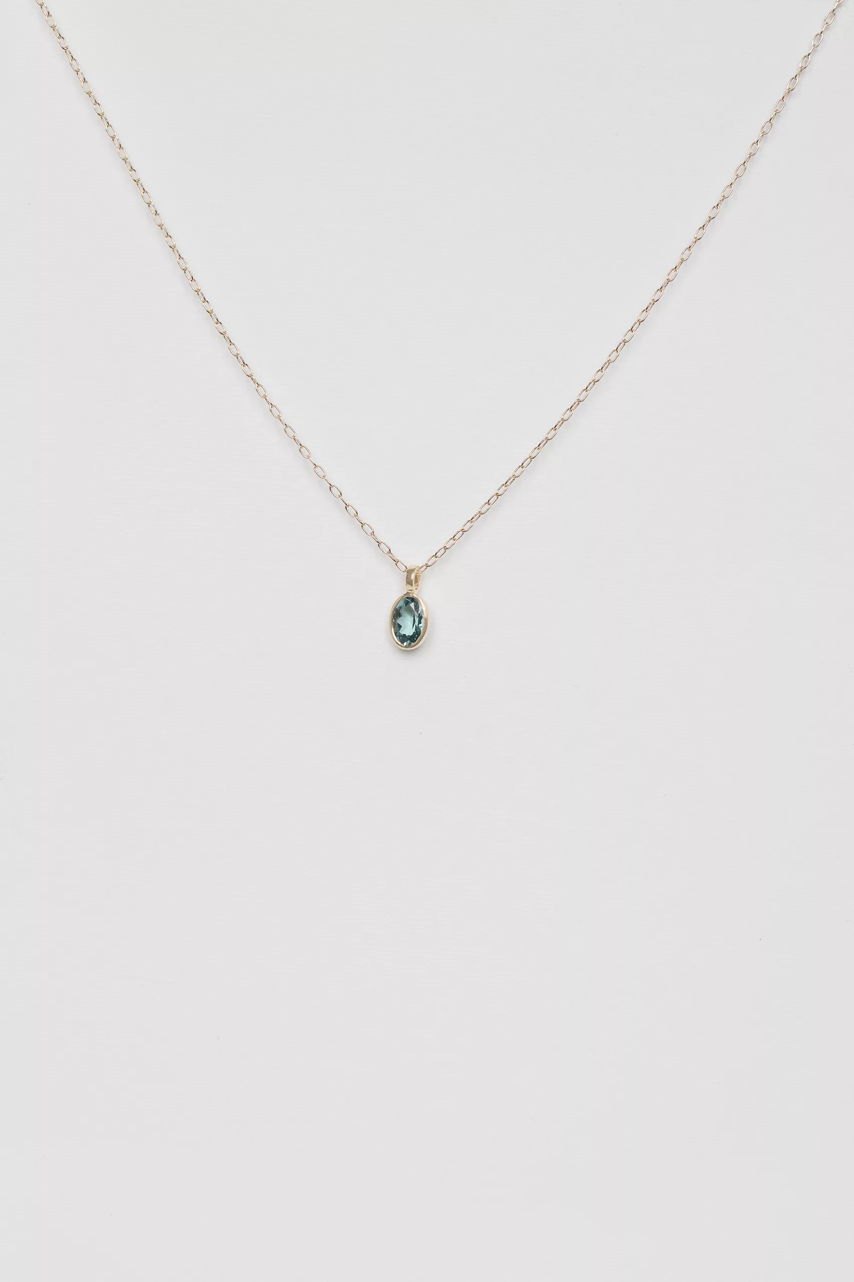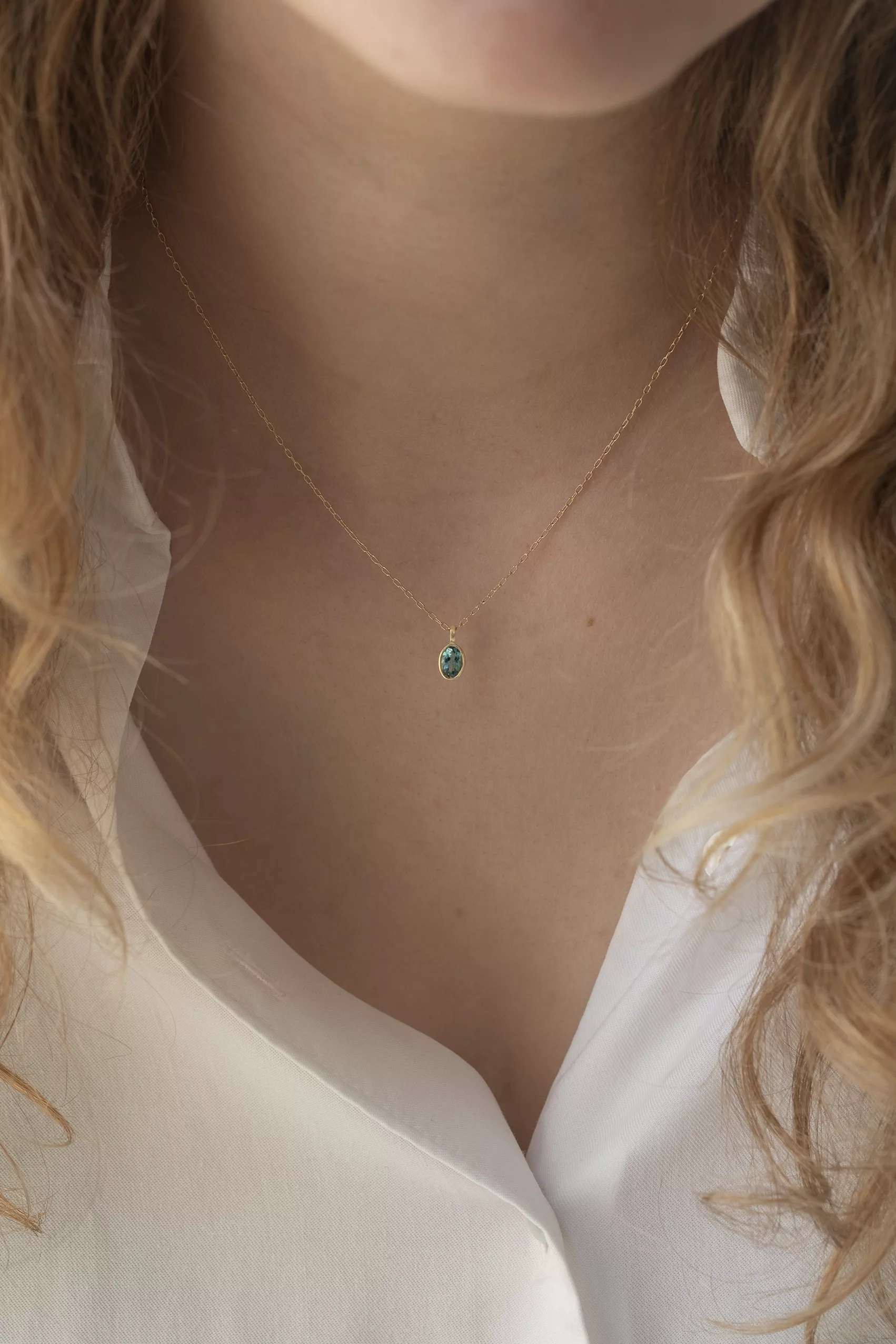 Celine Daoust 14k light yellow gold maya blue tourmaline special cut necklace. The stone comes in a gradient of blue.