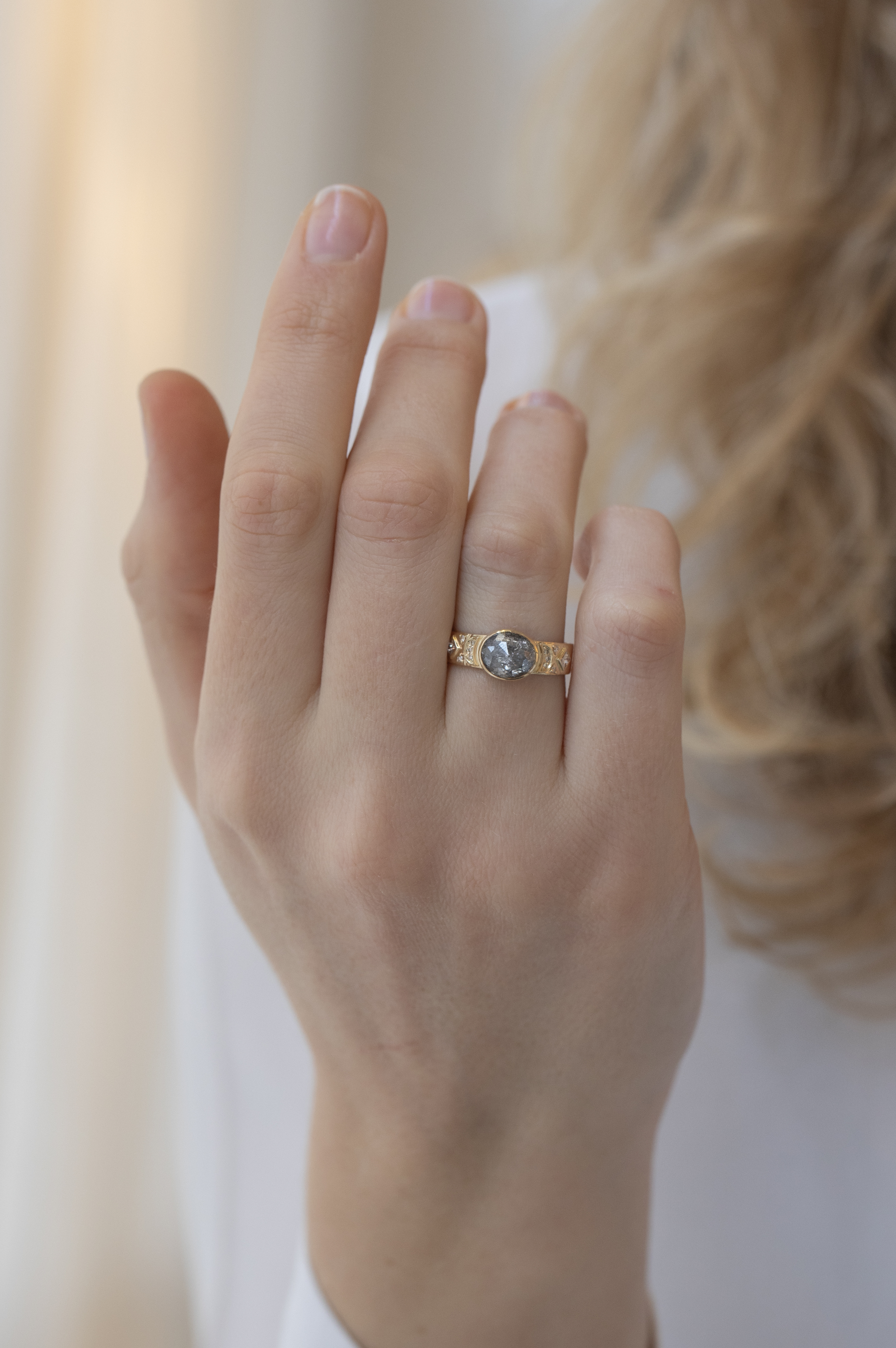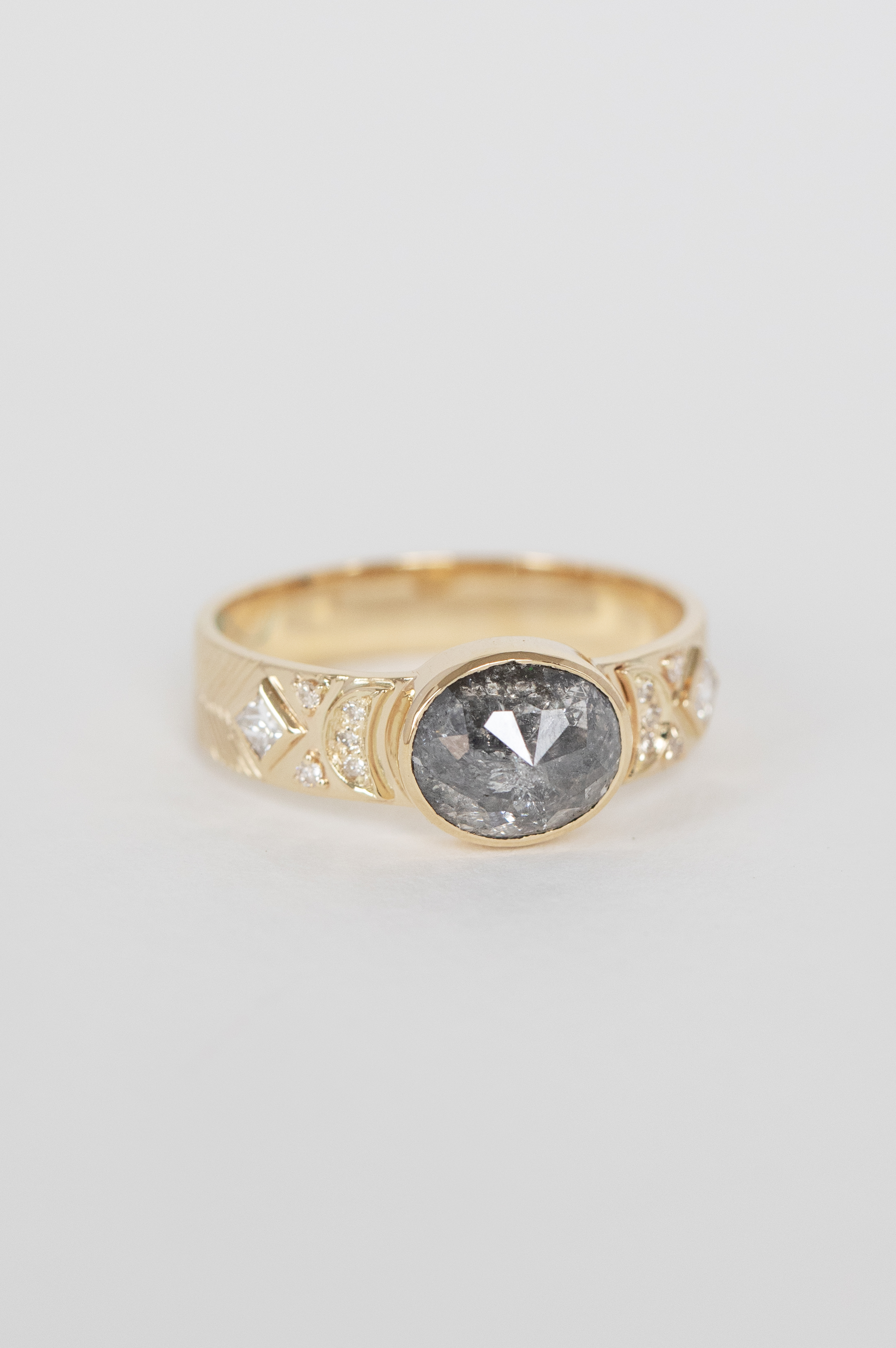 Celine Daoust 14k light yellow gold ring with an oval grey diamond, moon crescent details and square diamonds. The stone is a gradient of light and dark grey.