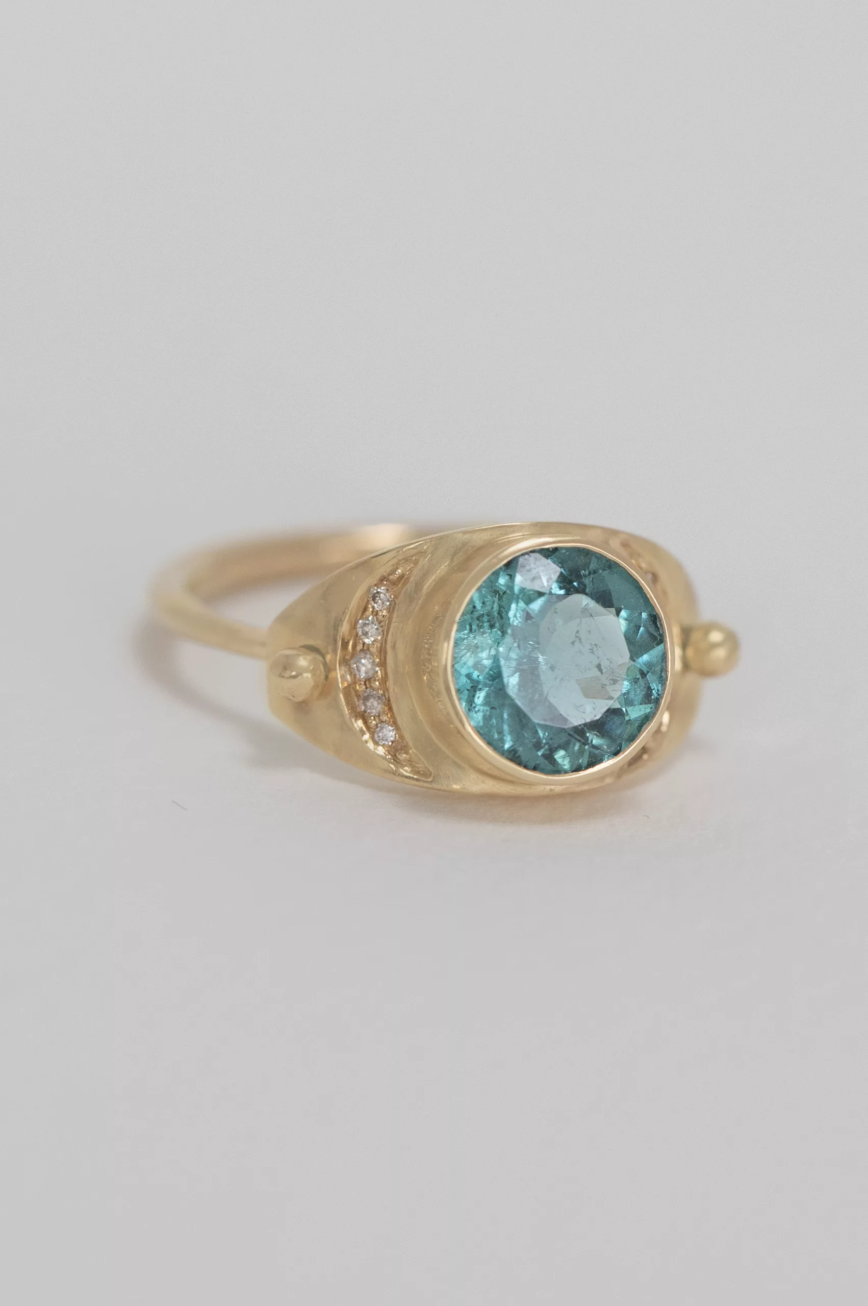 Celine daoust 14k yellow gold plate with one large blue tourmaline. The stone color is a gradient of dark and light blue.