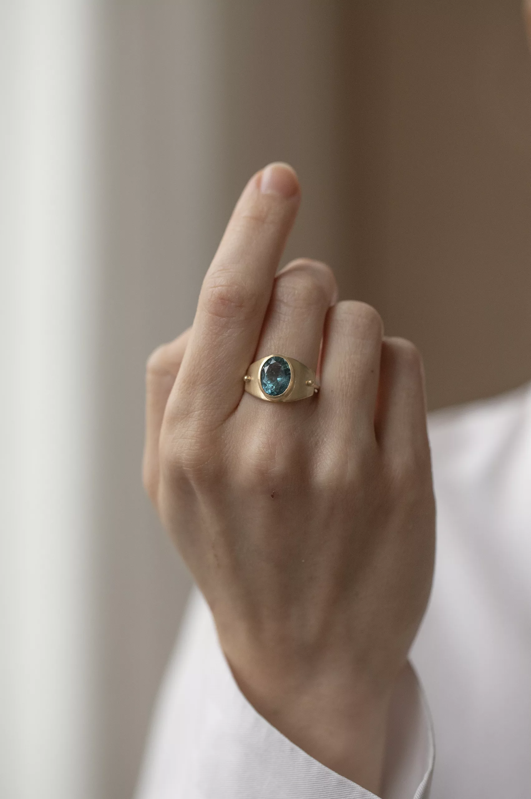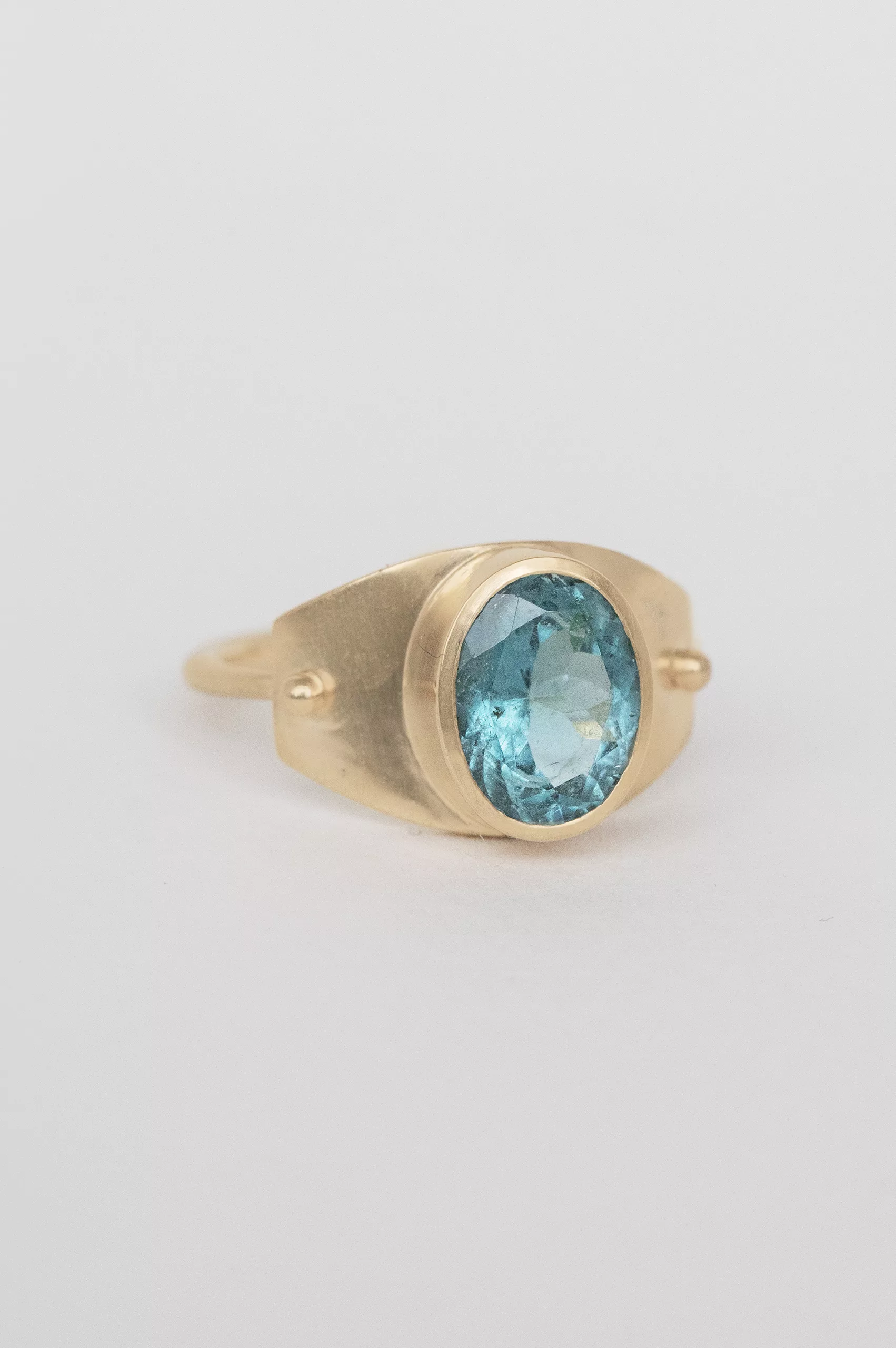 Céline Daoust 14k yellow gold with large blue tourmaline. The stone color is a gradient of light grey and blue.