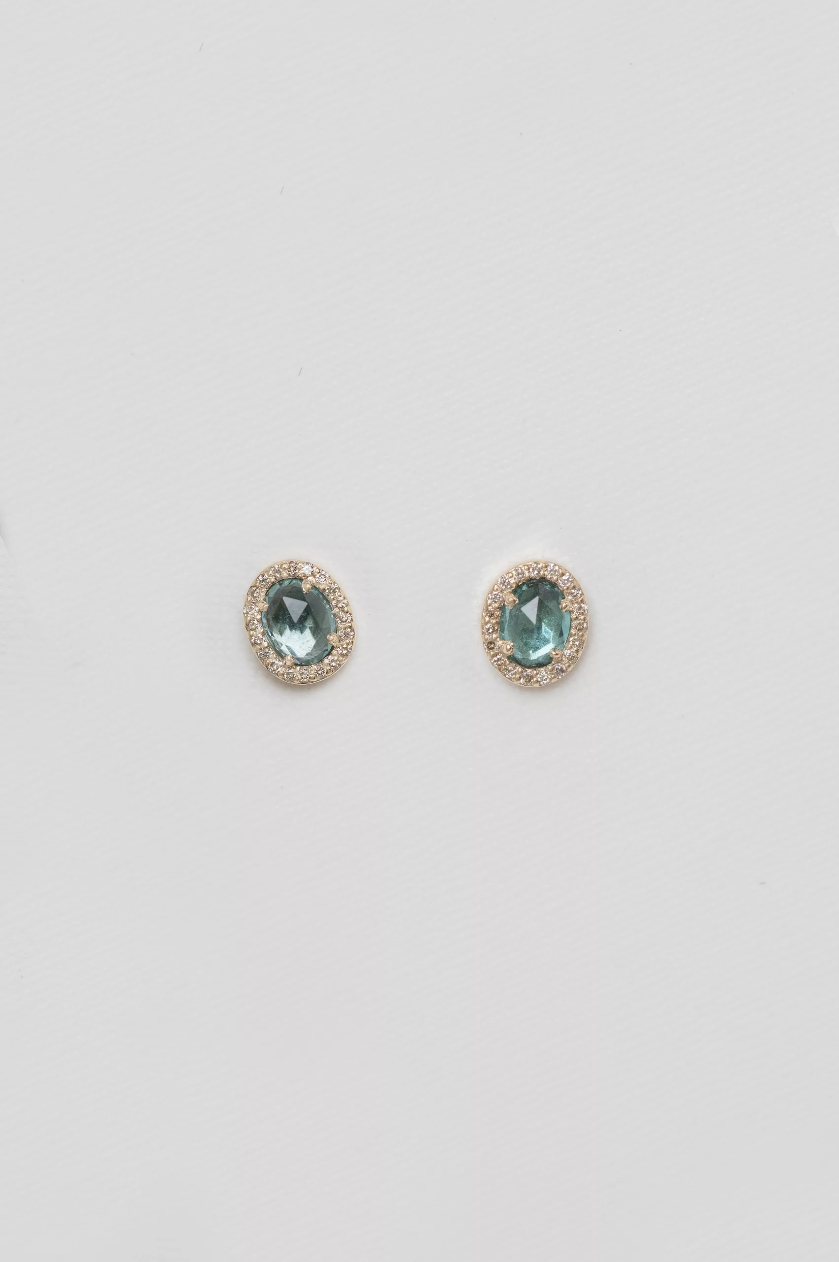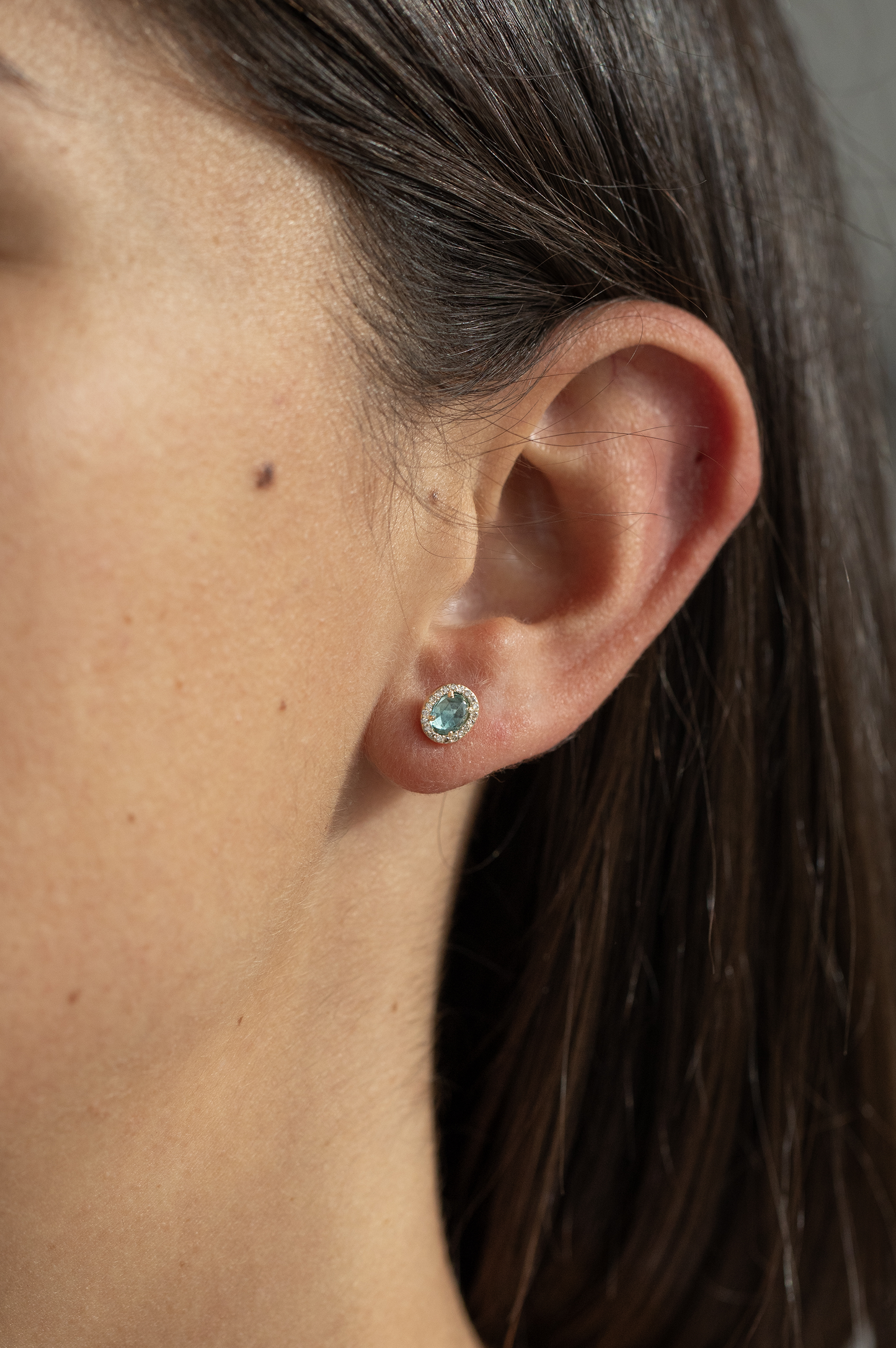 Celine Daoust 14k light yellow gold stella single earring with a blue tourmaline surrounded by diamonds. The stone come in a gradient of blue.