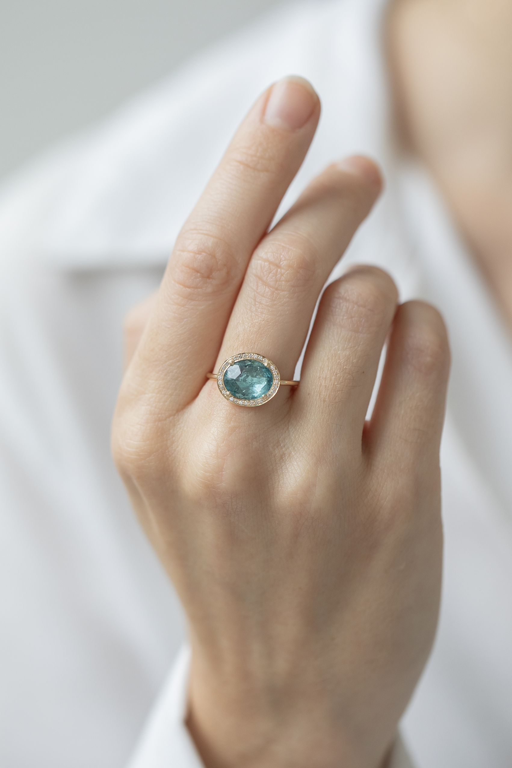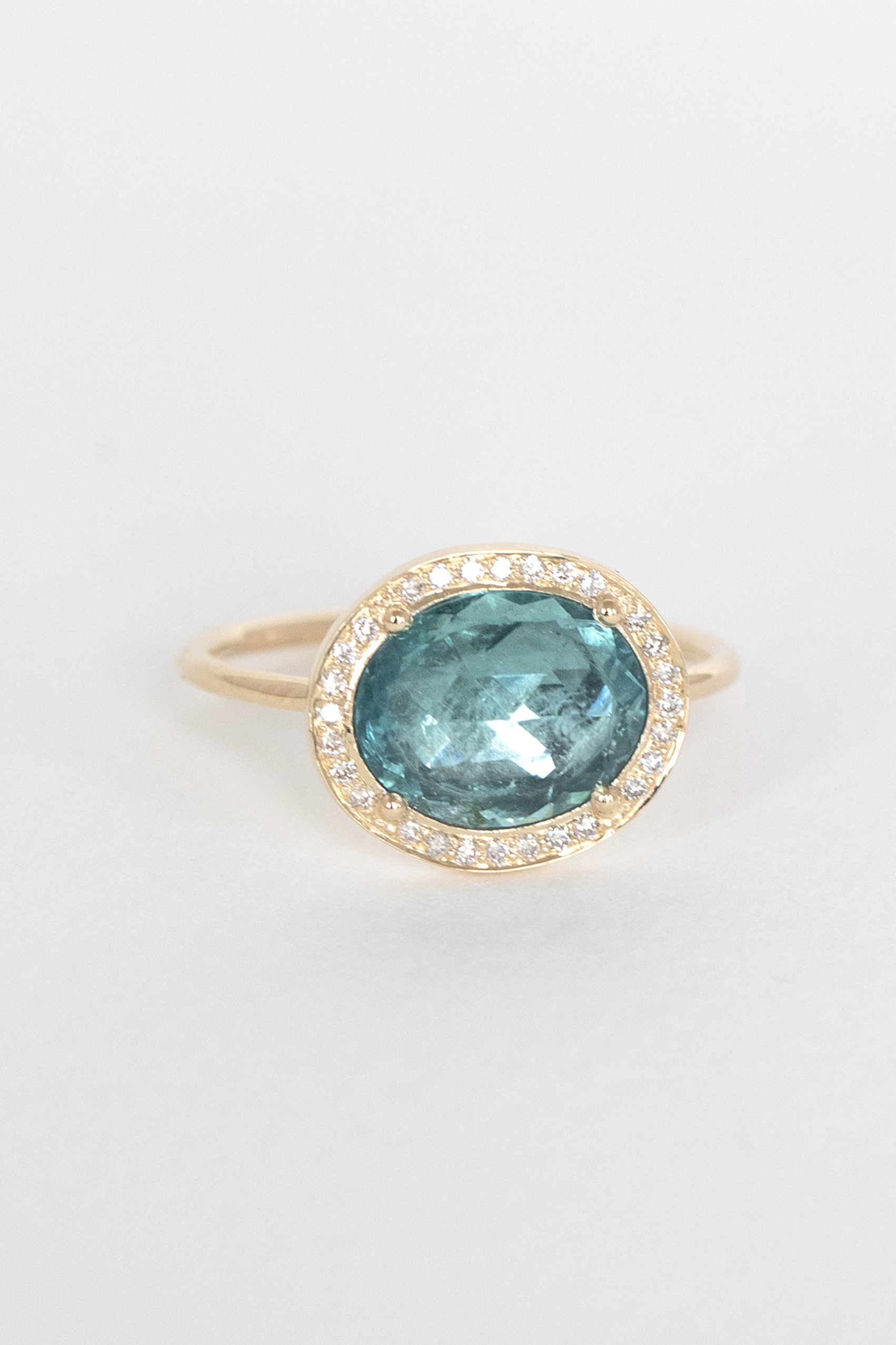 Celine Daoust 14k light yellow gold stella ring with a blue tourmaline surrounded by diamonds. The stone comes in a gradient of turquoise blue.