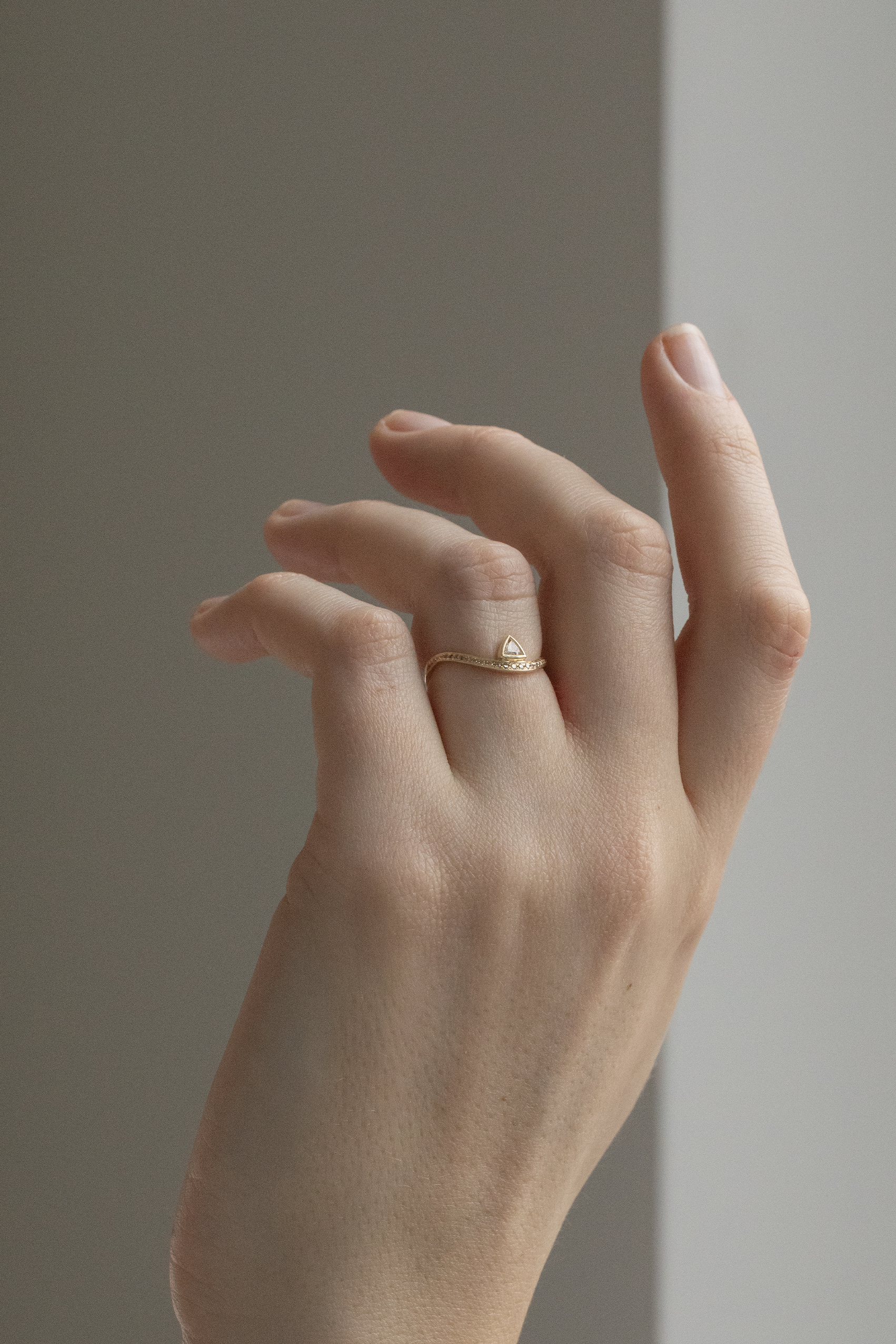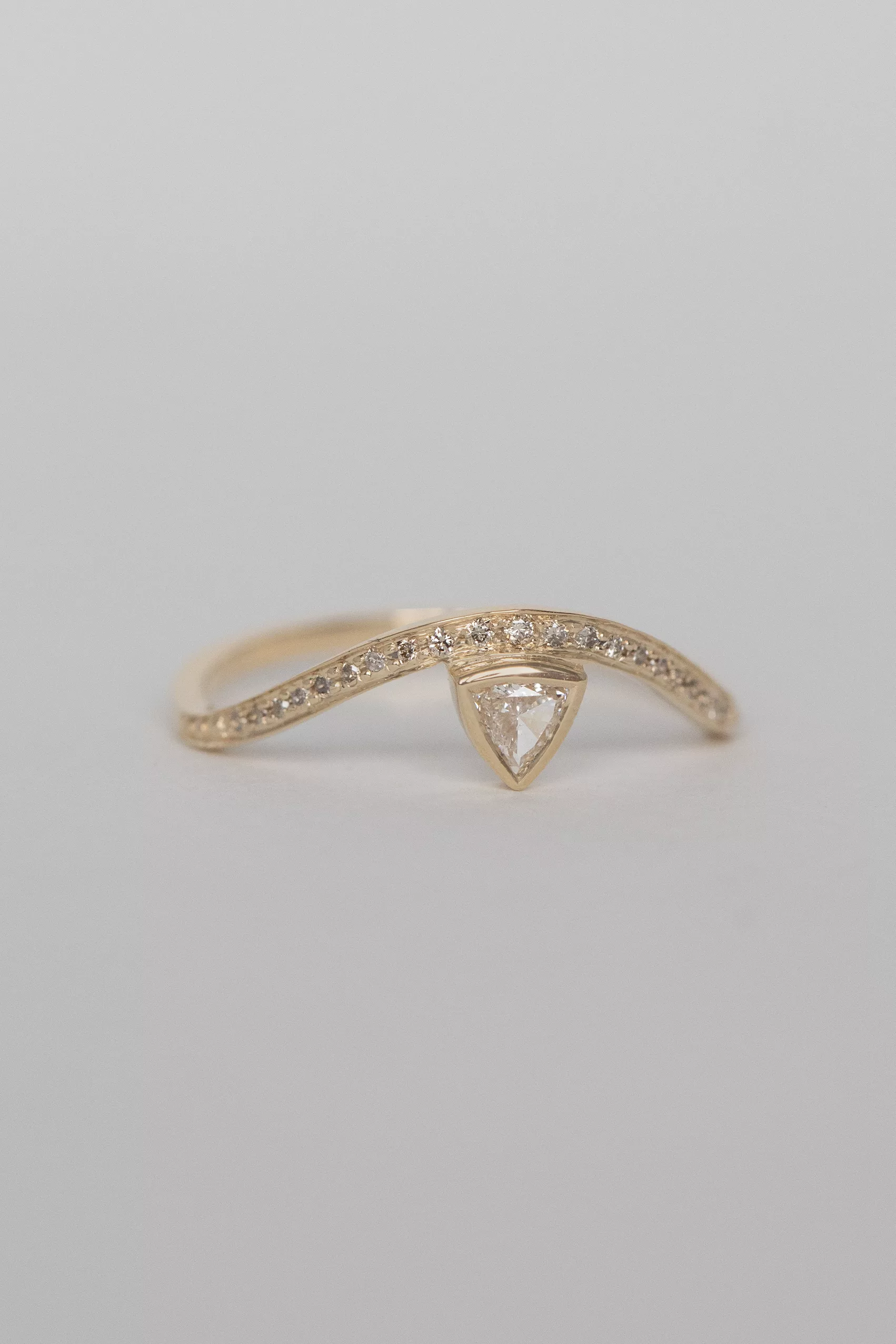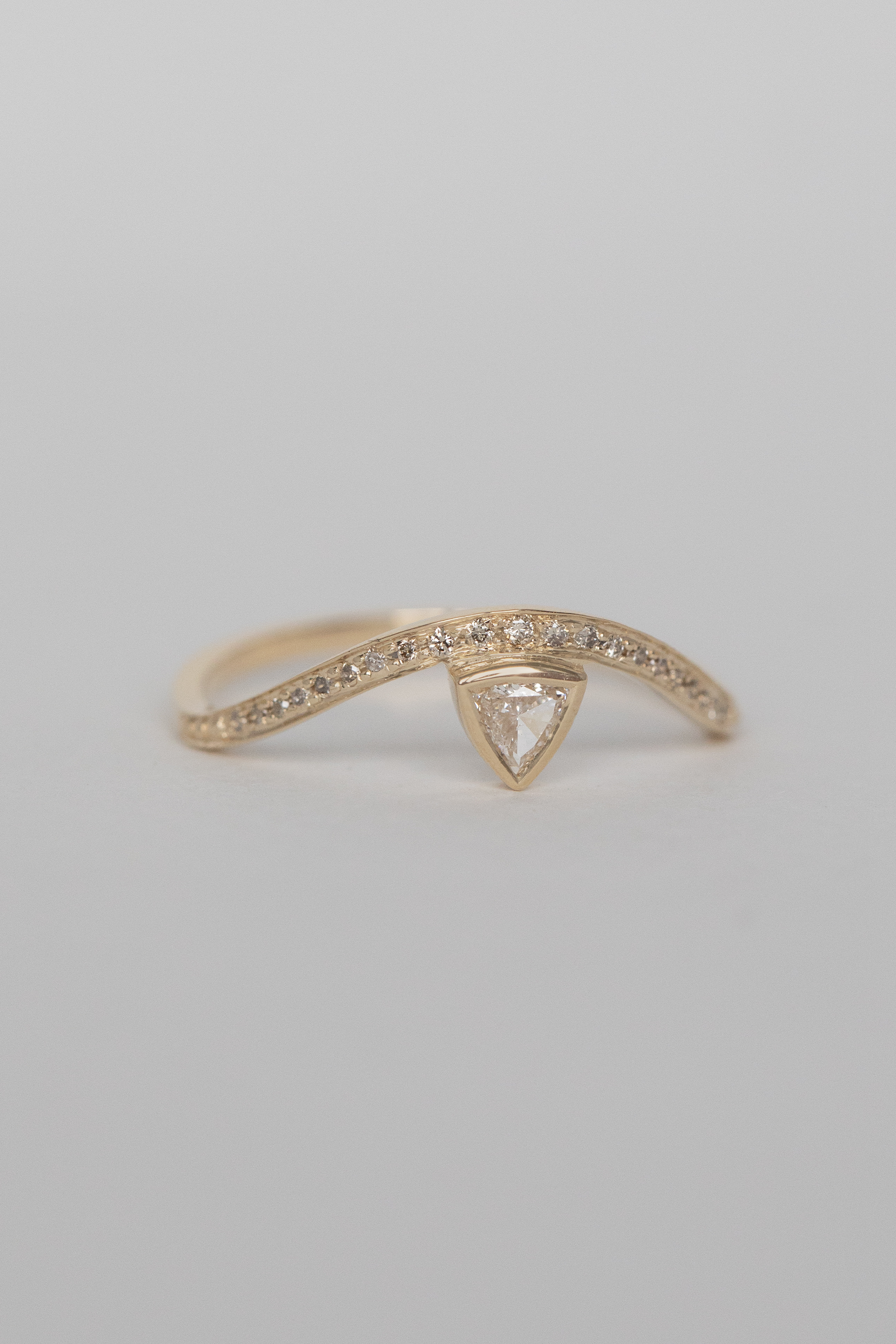 Celine Daoust 14k light yellow gold ring with a rose cut champagne diamond on a gold wave with diamonds.
