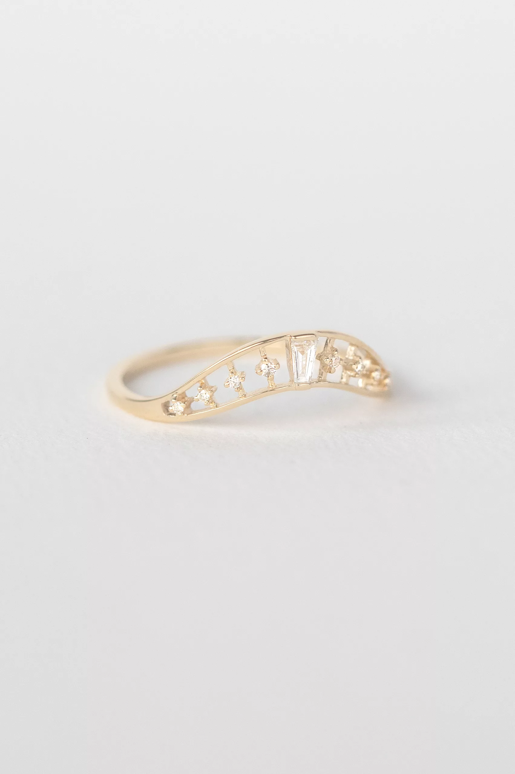 Celine Daoust 14k light yellow gold crown ring set with one baguette diamonds and white diamonds.