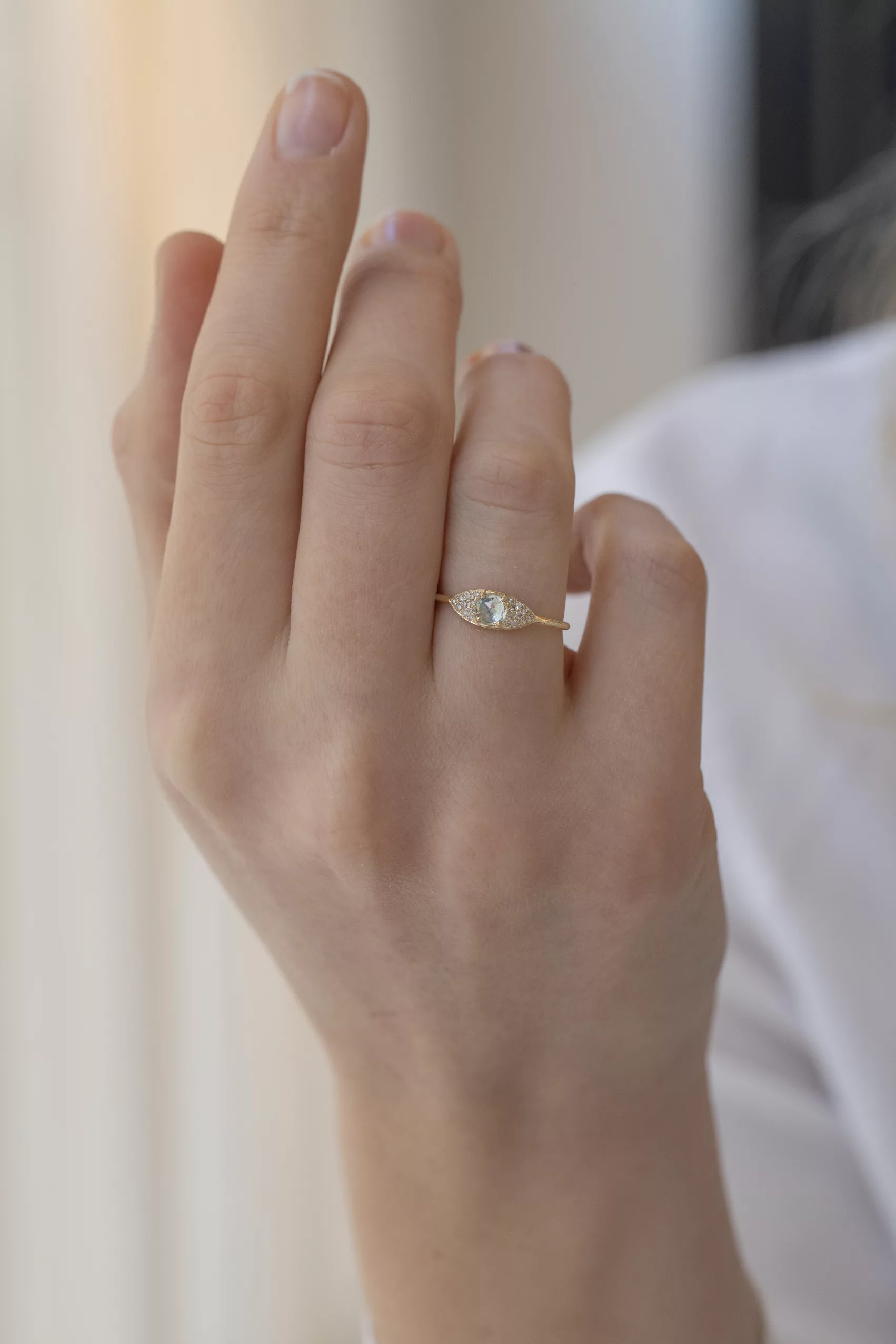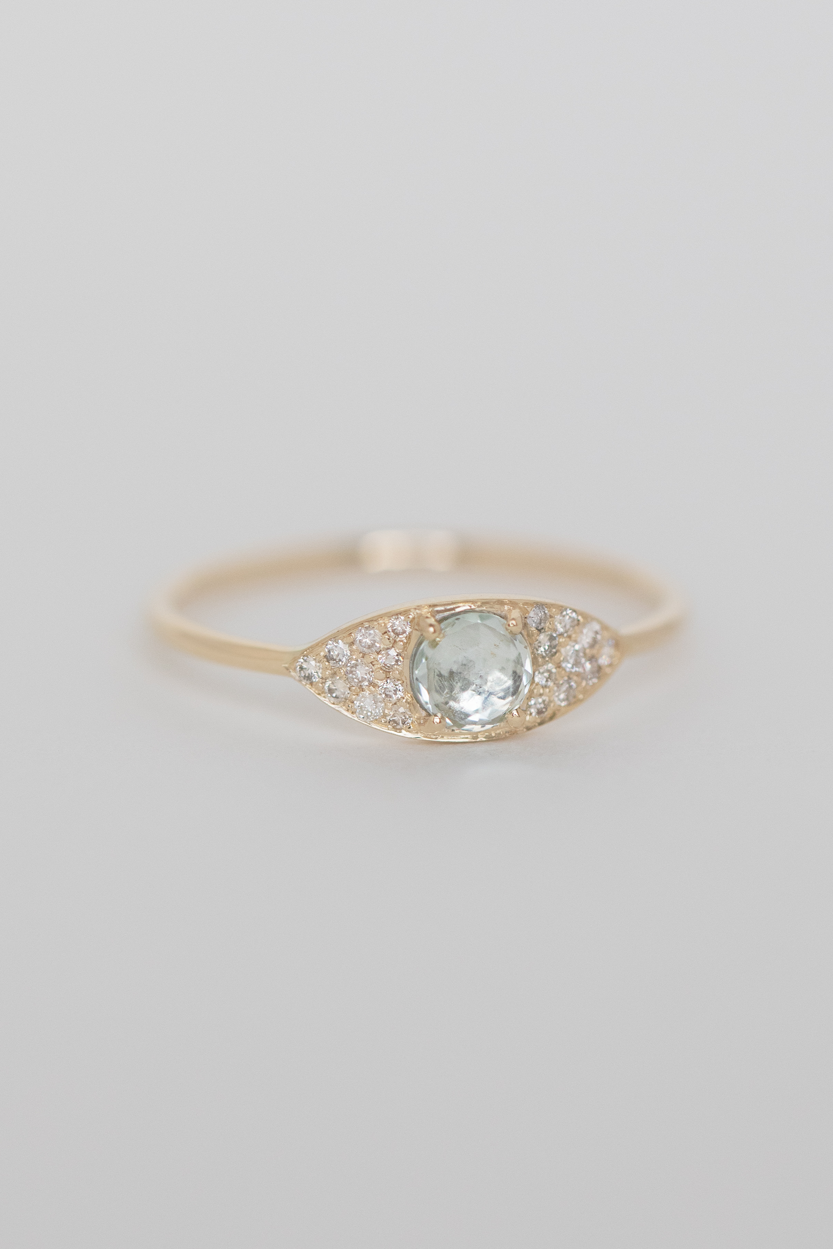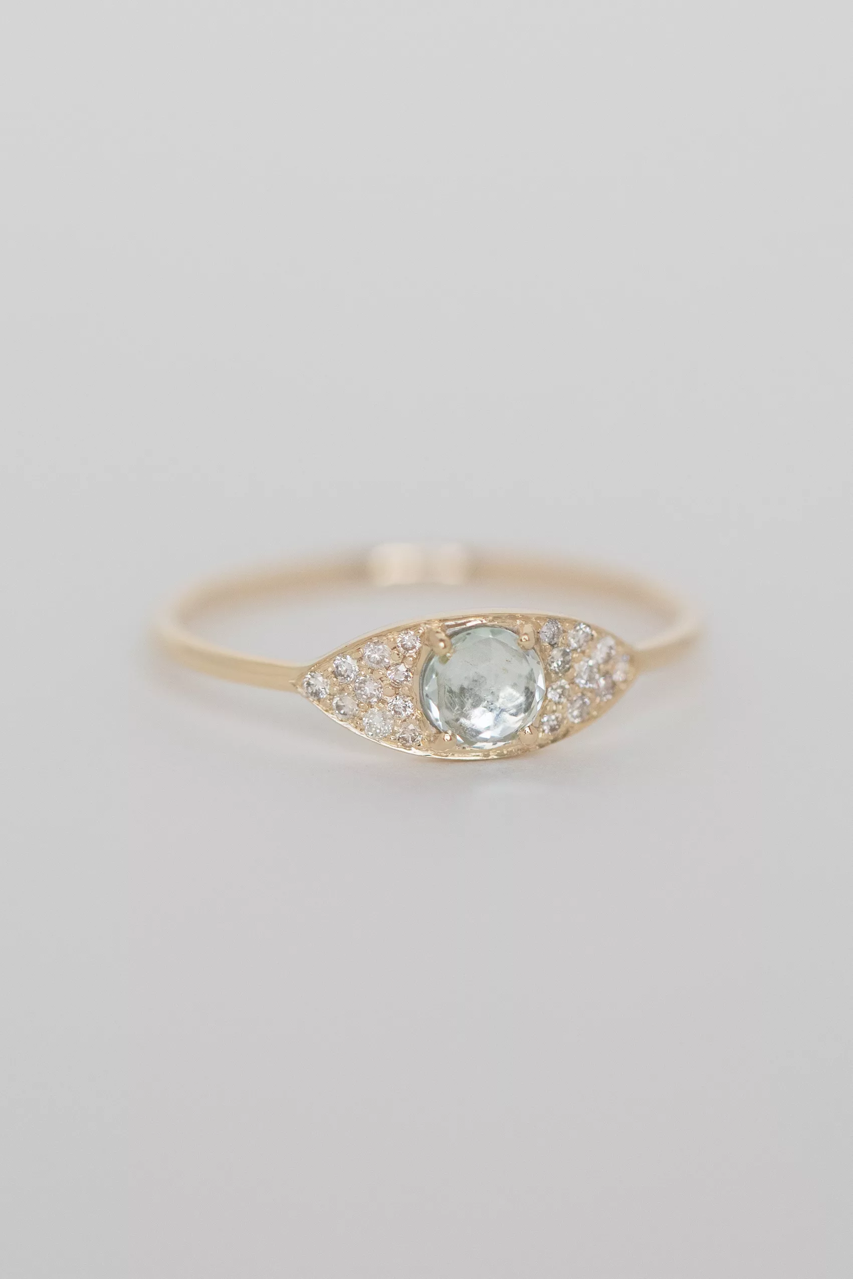 Céline Daoust 14k yellow gold full eye ring with one light green tourmaline and diamonds. The stone color is a gradient of light green.