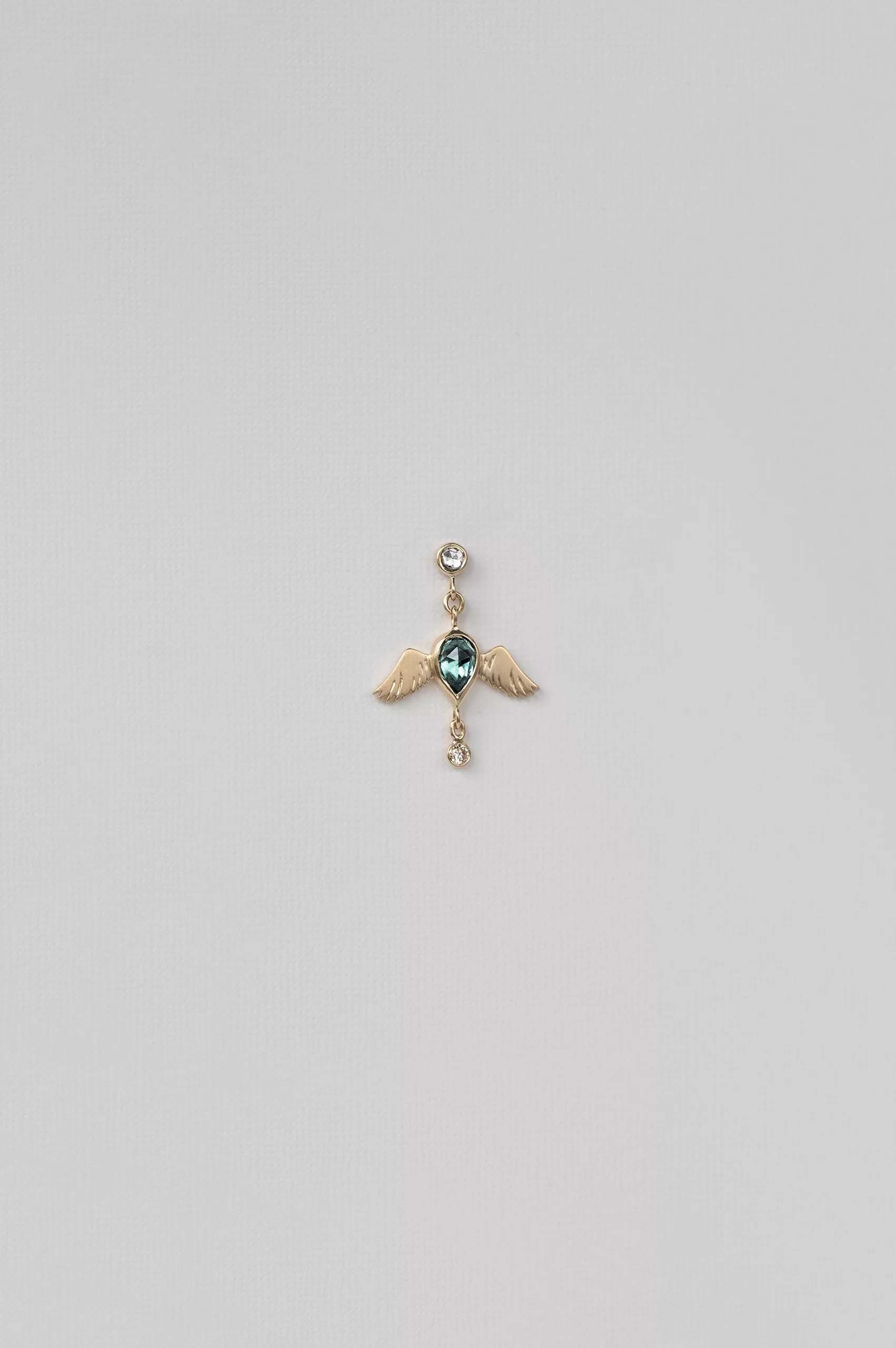 Celine daoust 14k light yellow gold single bird earring with one dark blue pear tourmaline & dangling diamond. The stone comes in a gradient of blue.