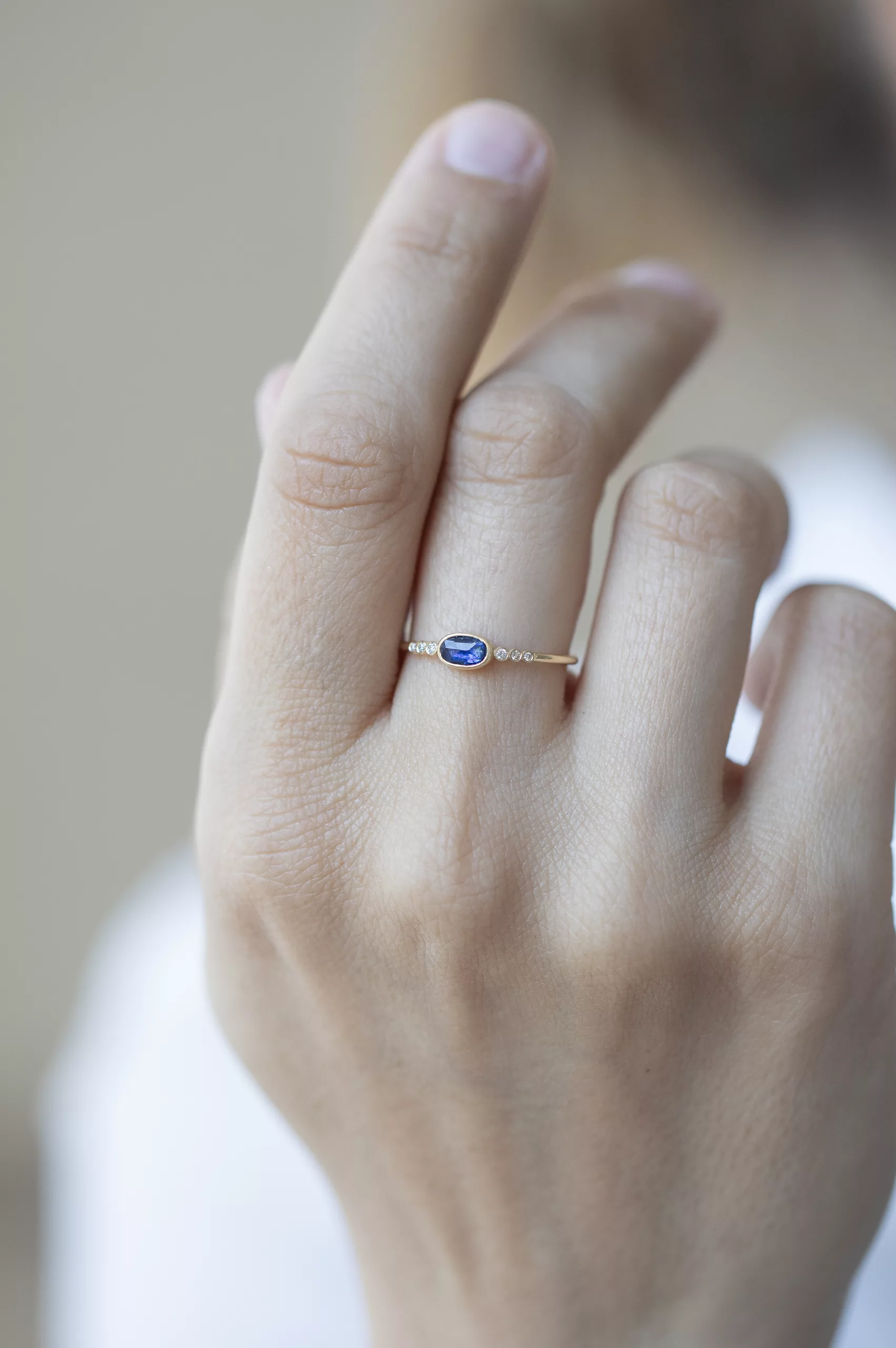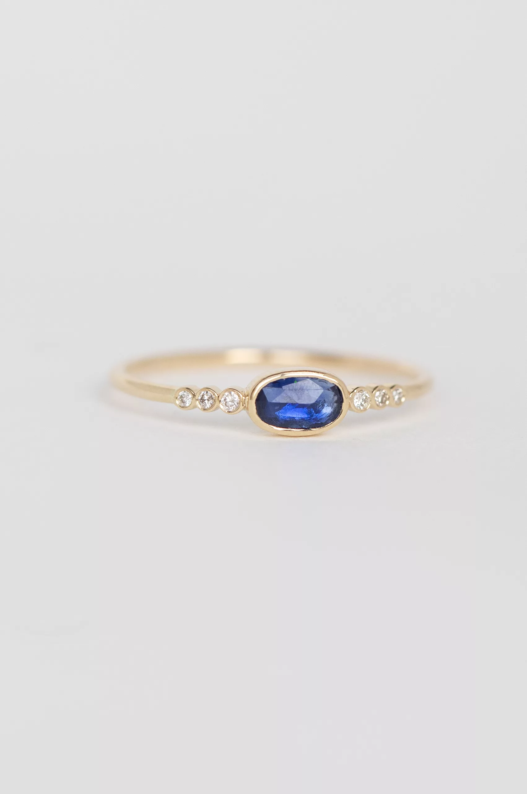 Céline Daoust 14k light yellow gold with one central blue sapphire and six diamonds. The stone comes in a gradient of dark blue .