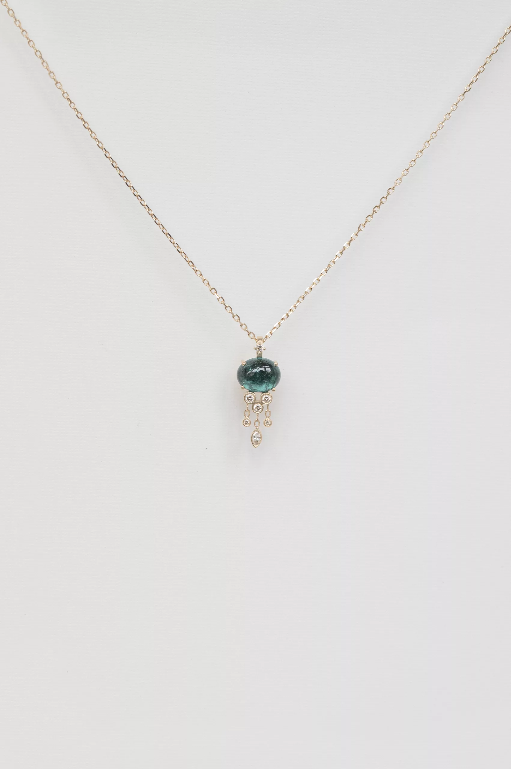 Céline Daoust 14k light yellow gold chain jellyfish necklace with one dark blue tourmaline and dangling diamonds. The stone comes in a gradient of dark blue.