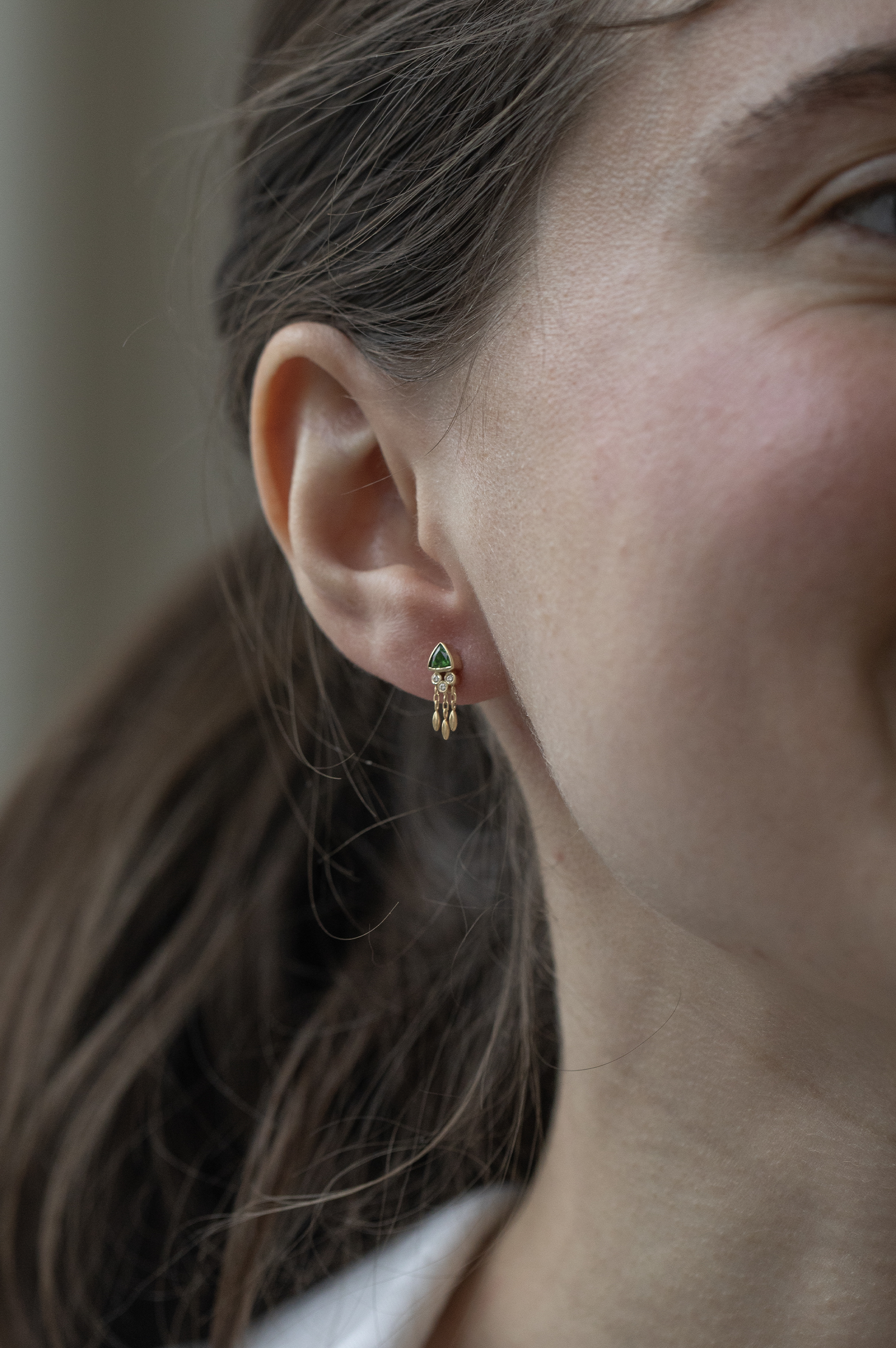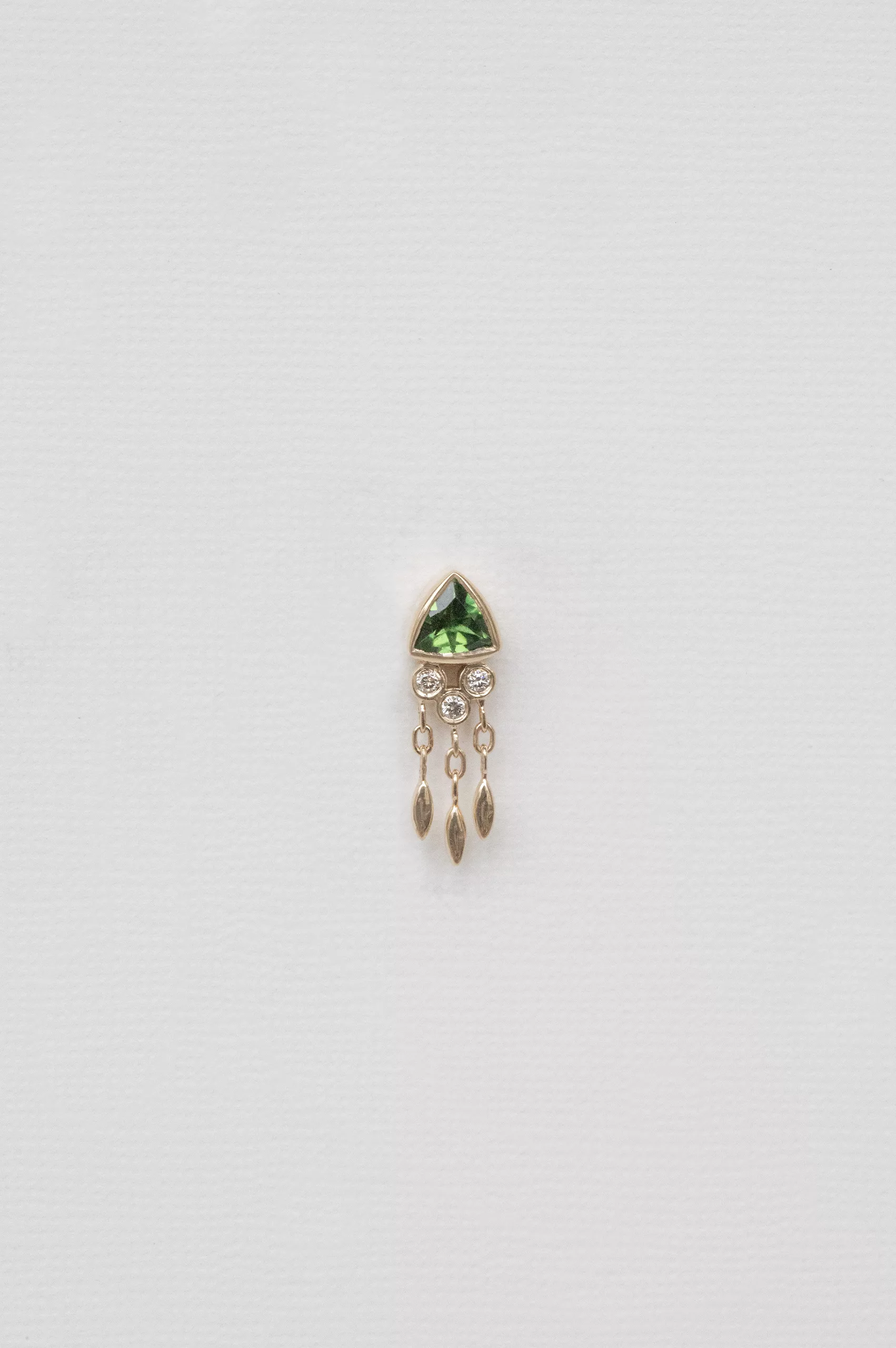 Celine Daoust 14k light yellow gold earring with one dark green tourmaline, diamonds and dangling details. The stone comes in a gradient of dark green.