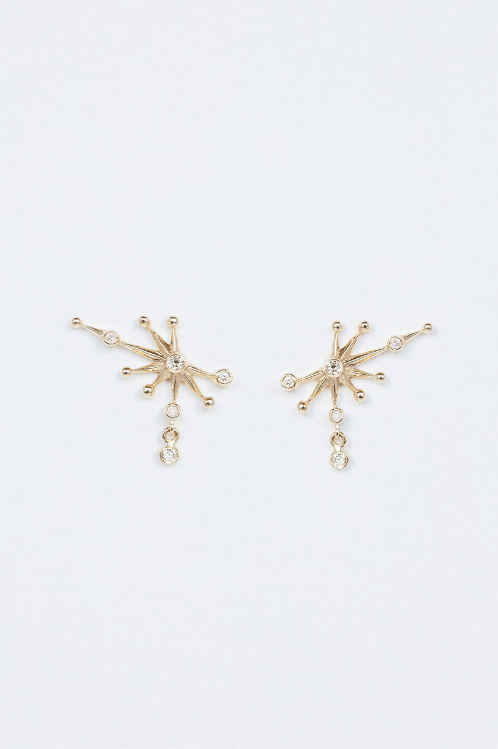 Celine Daoust 14k light yellow gold with five white diamonds and one dangling diamond constellation single stud earrings.