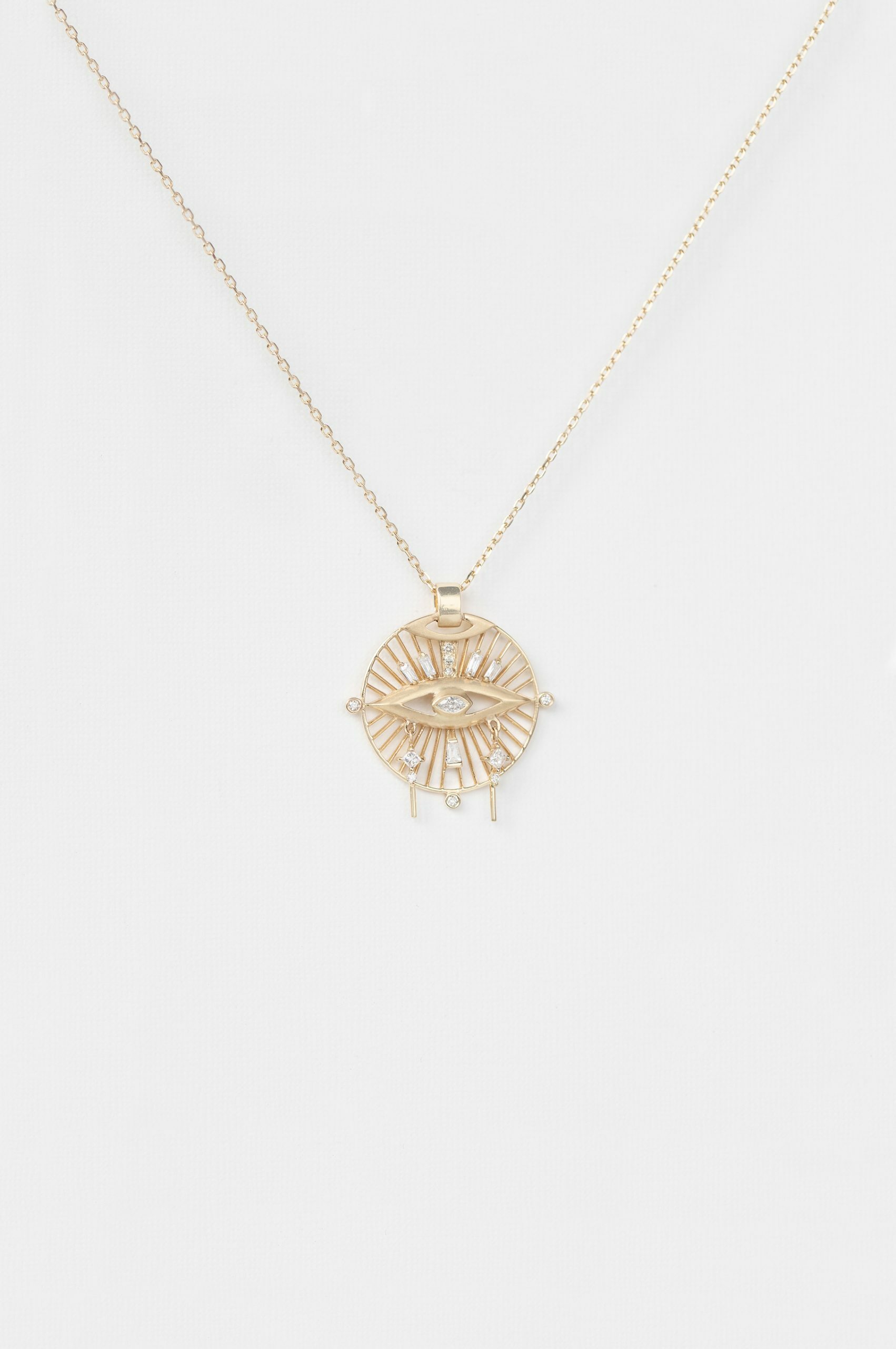 Celine Daoust 14k light yellow gold dream maker pendant oval diamond with eye details, baguette and dangling diamonds necklace.