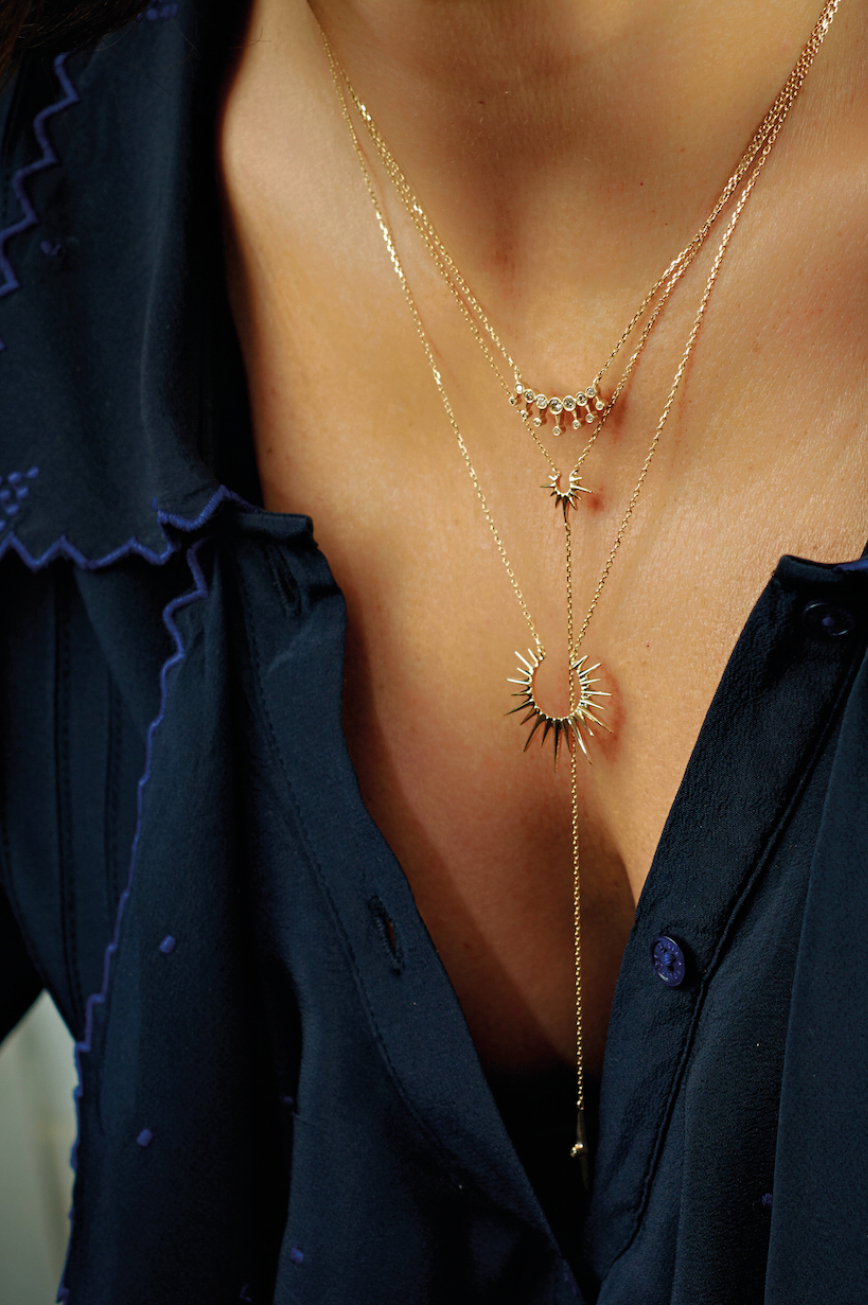Celine Daoust 14k light yellow gold stars and universe diamond sun chain lariat necklace.