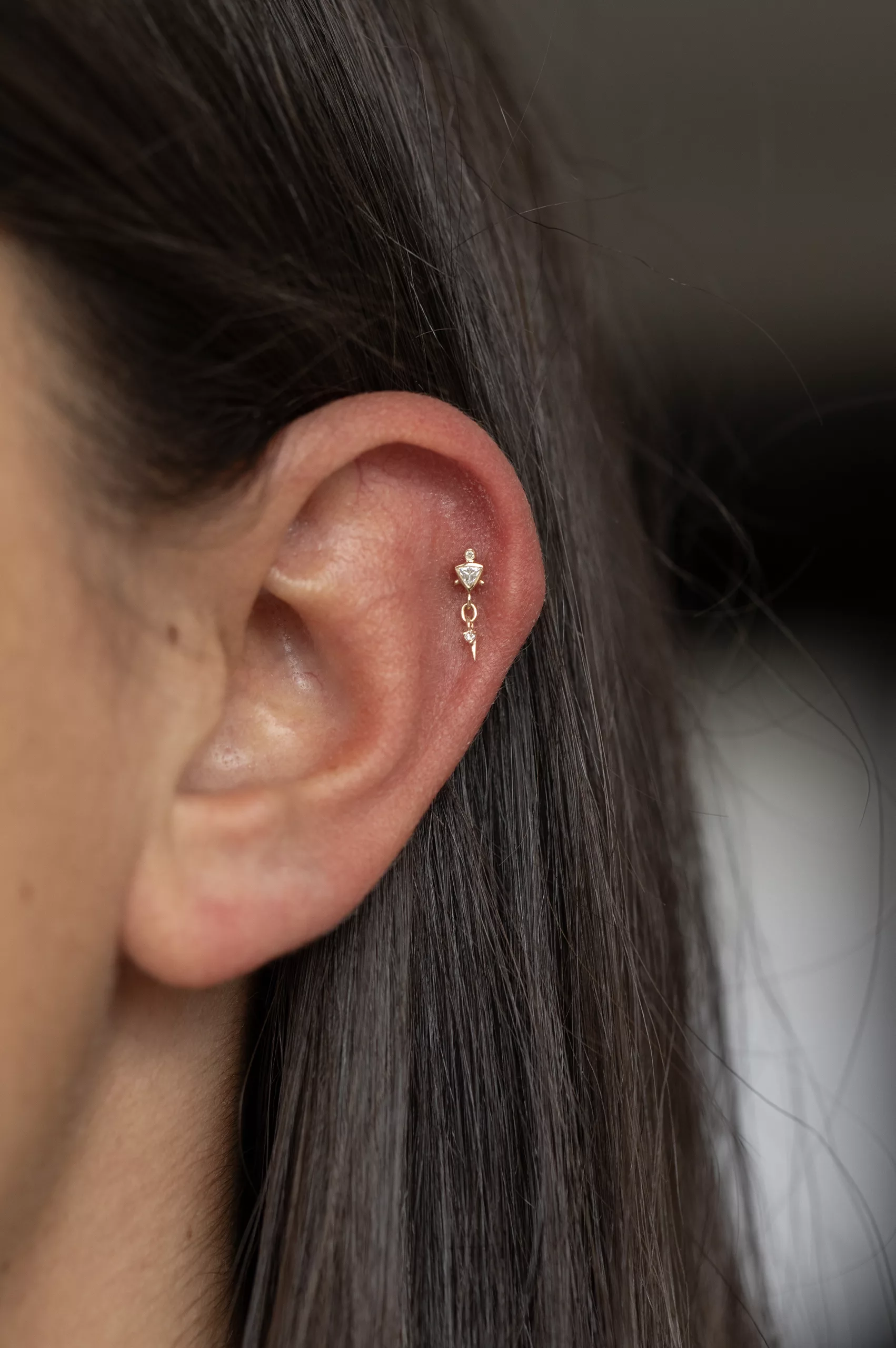 Celine Daoust 14k light yellow gold diamond triangle and dangling detail flat back piercing.