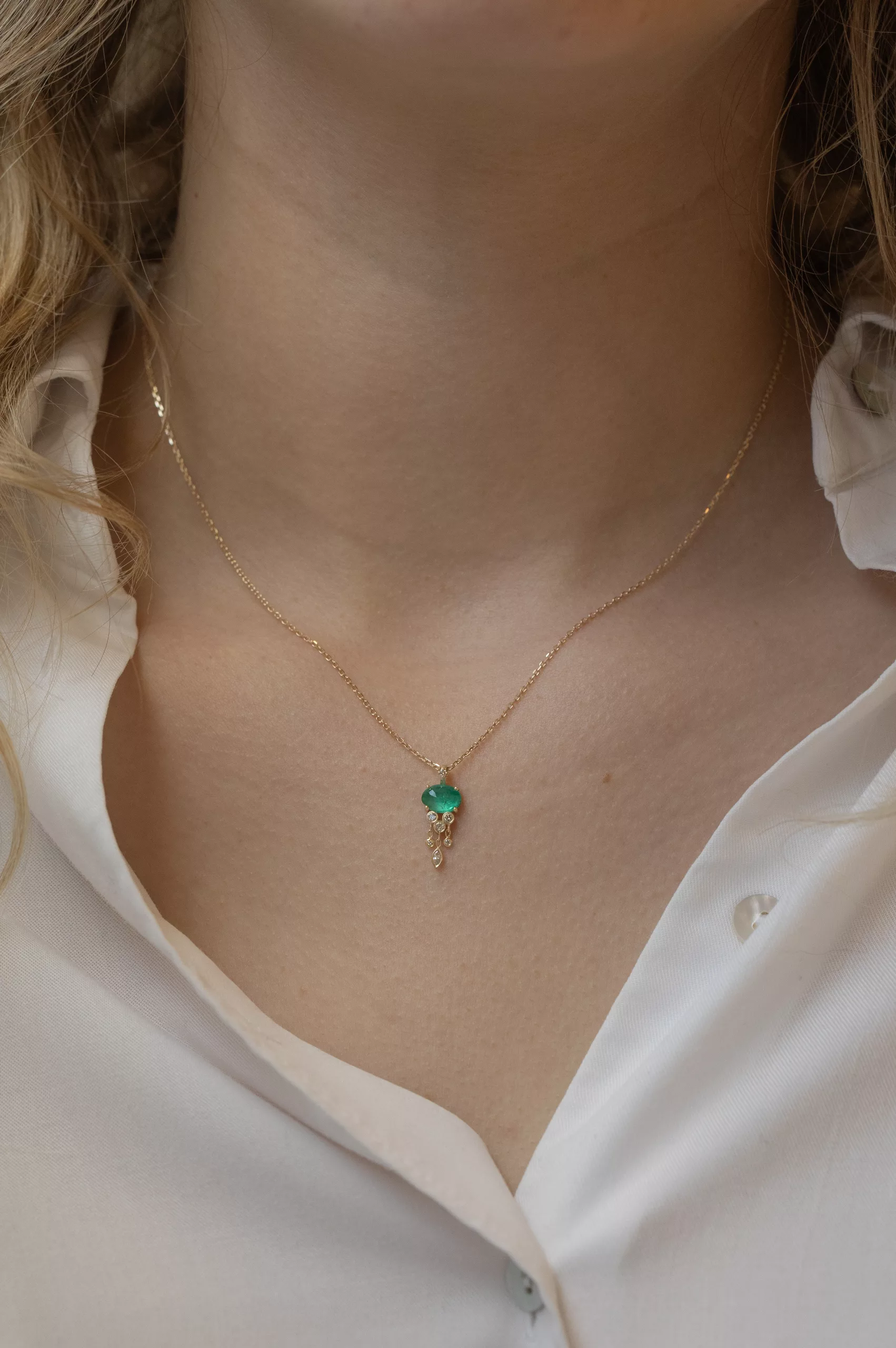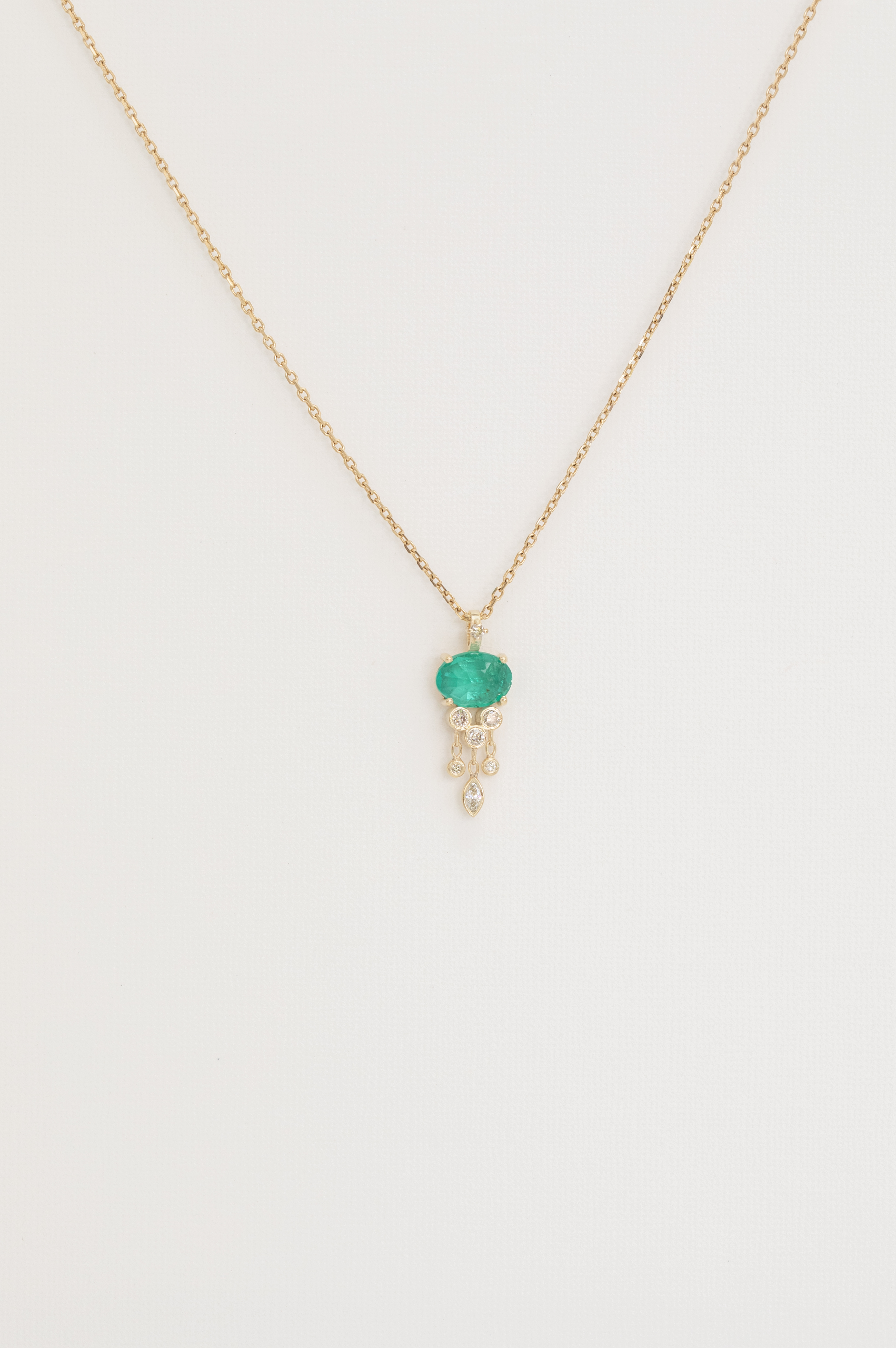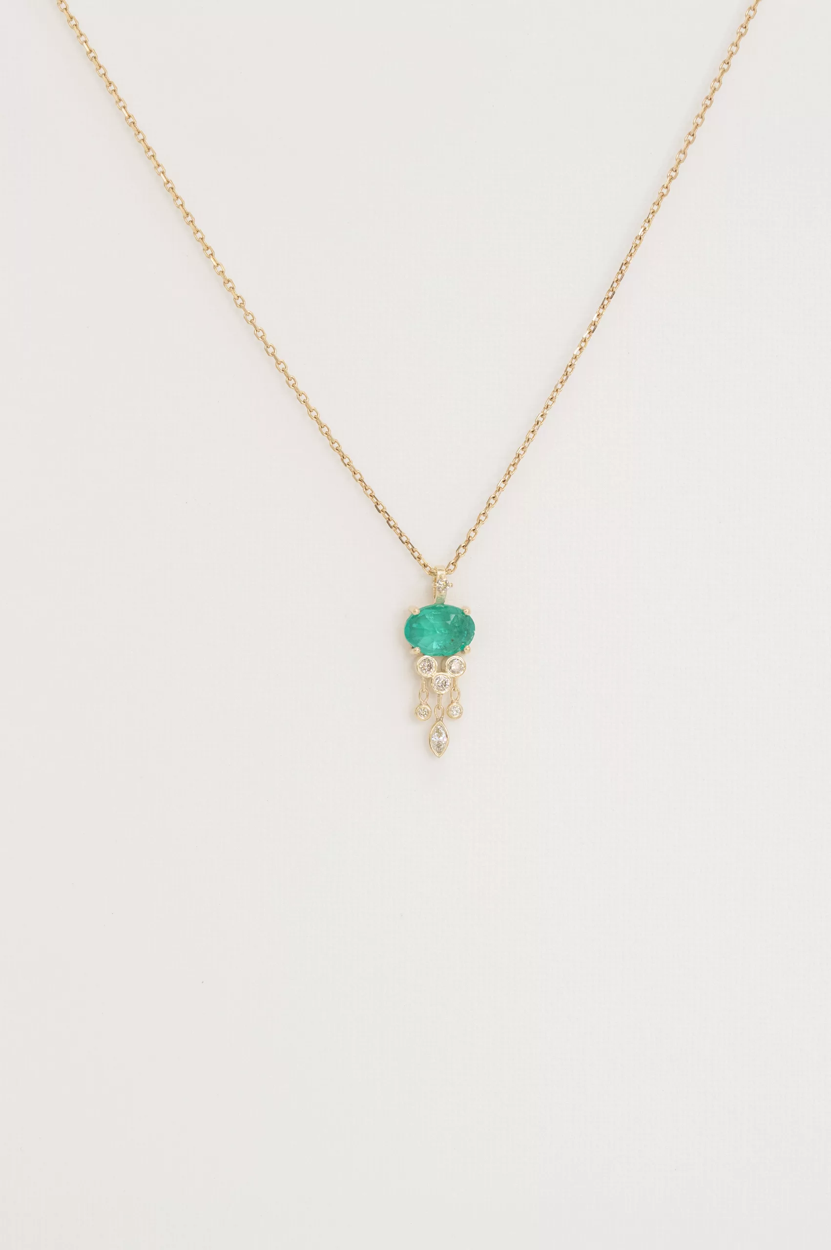 Celine Daoust 14k light yellow gold chain jellyfish necklace with one intense emerald and dangling diamonds. The stone comes in gradient of light and vivid green.
