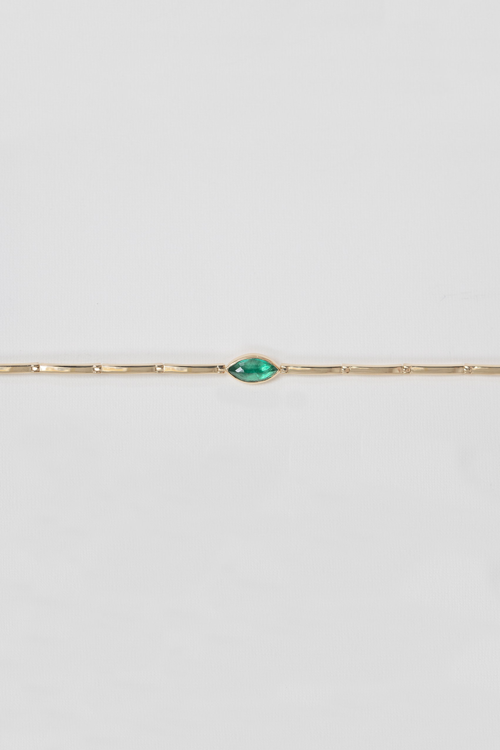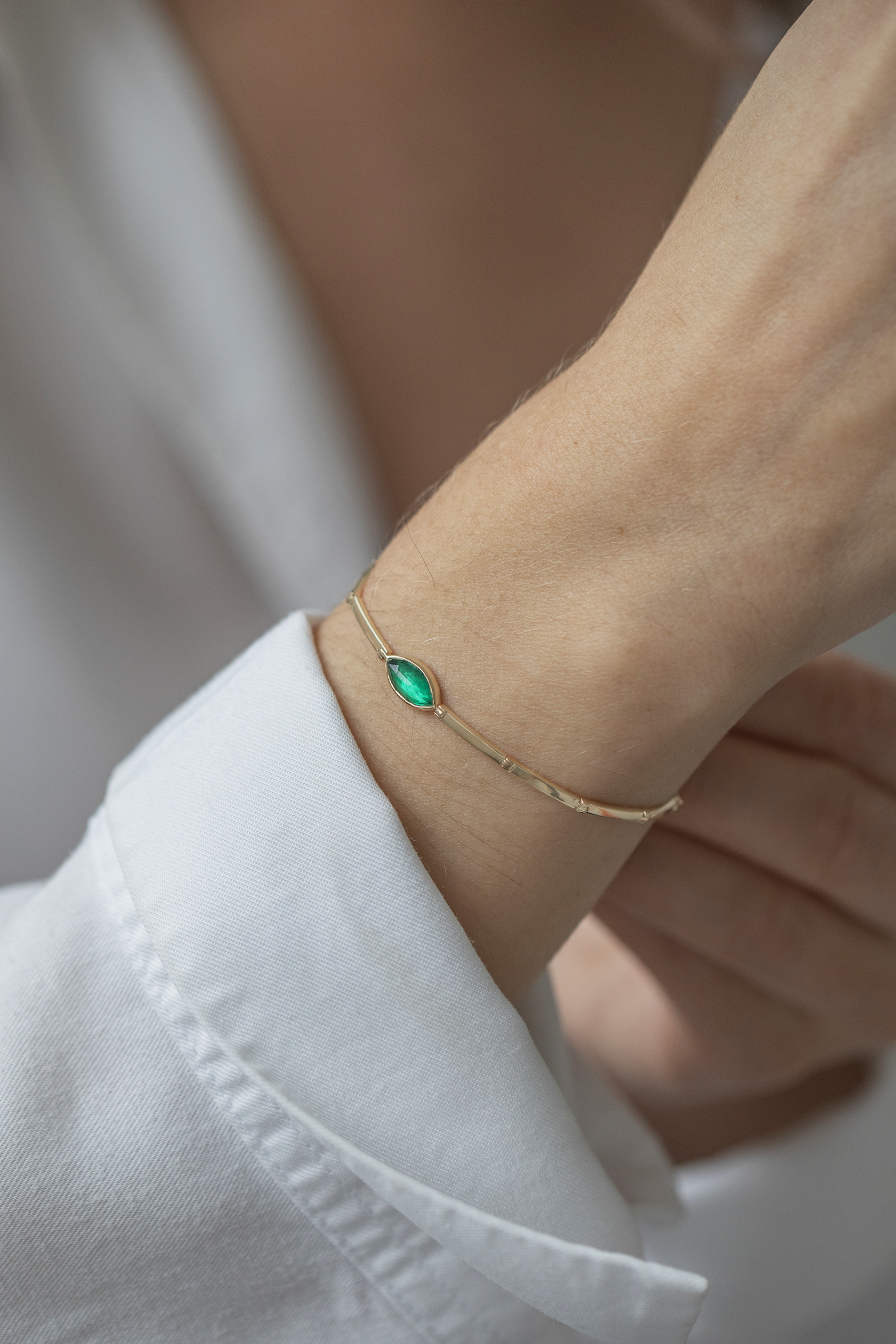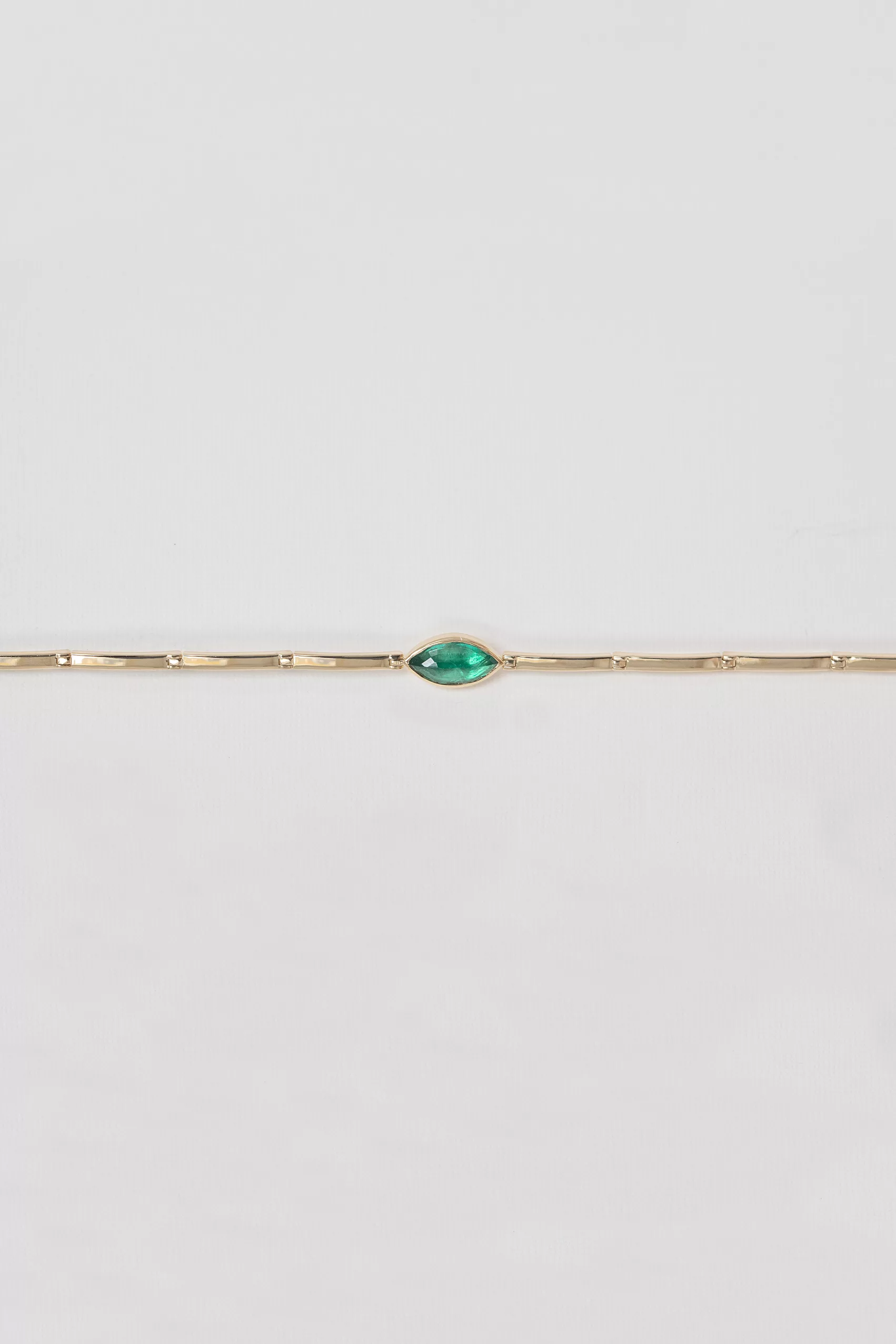 Celine Daoust 14k light yellow gold articulated bracelet with one emerald. The stone is a gradient of light and dark green.
