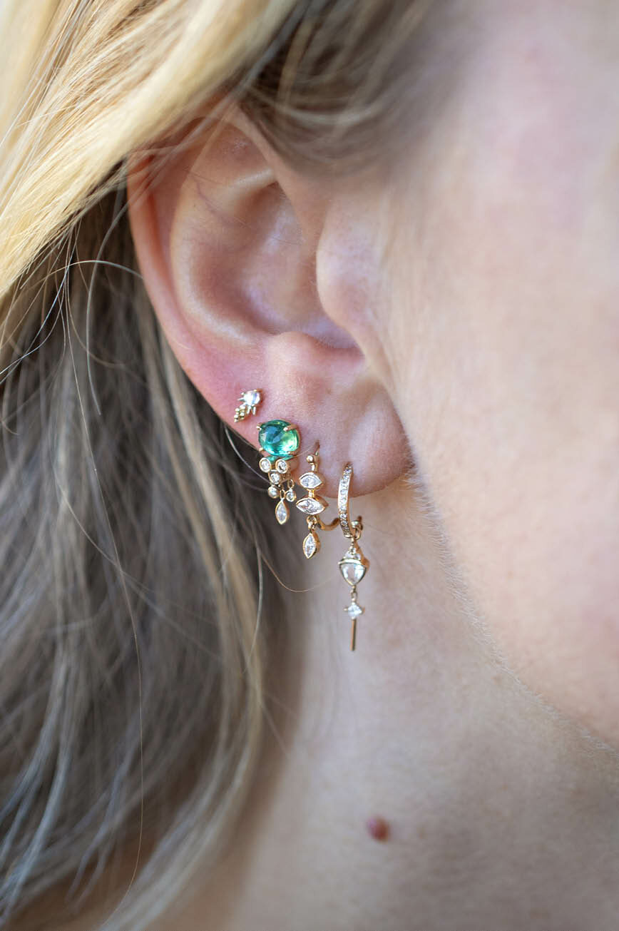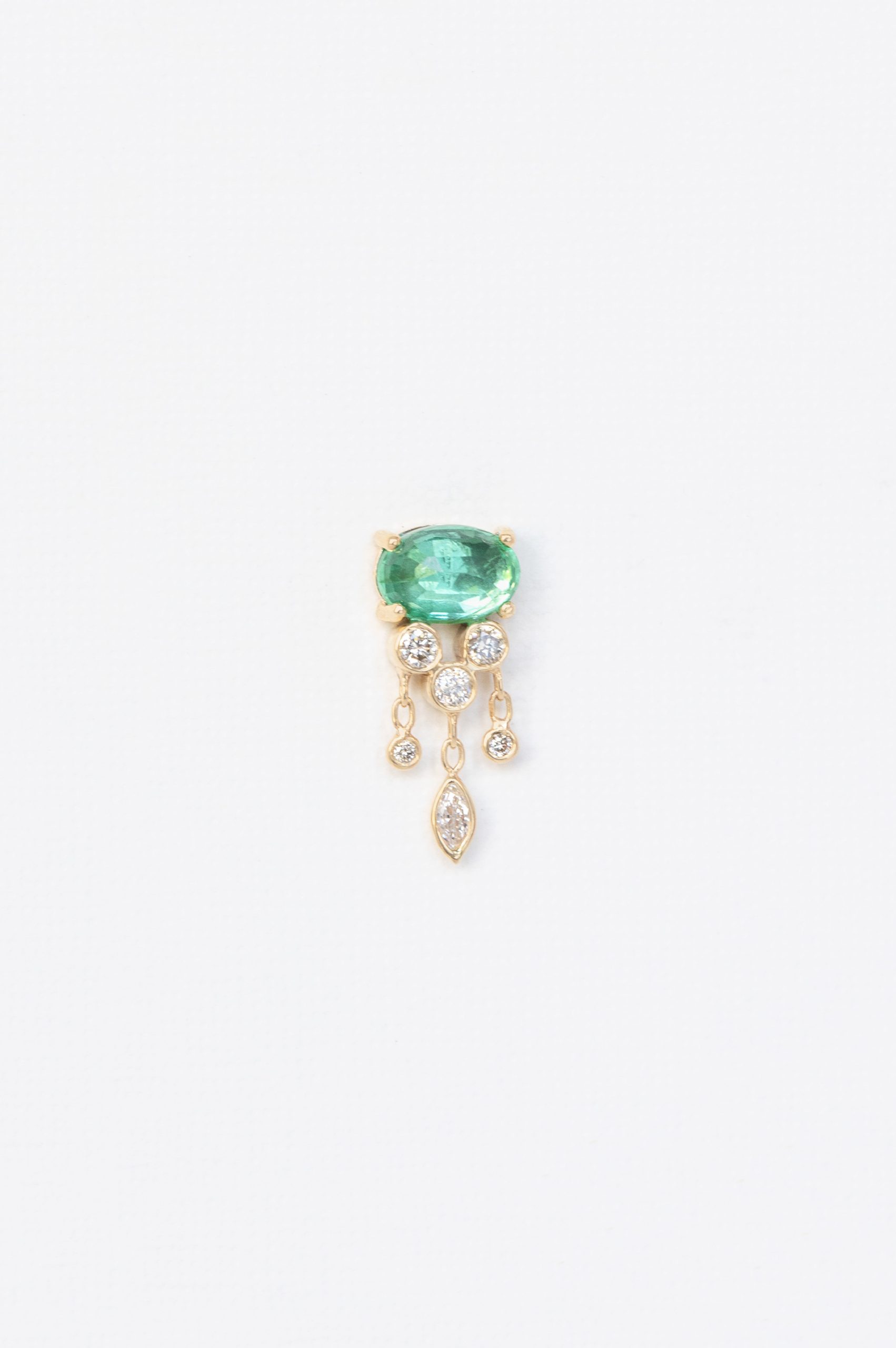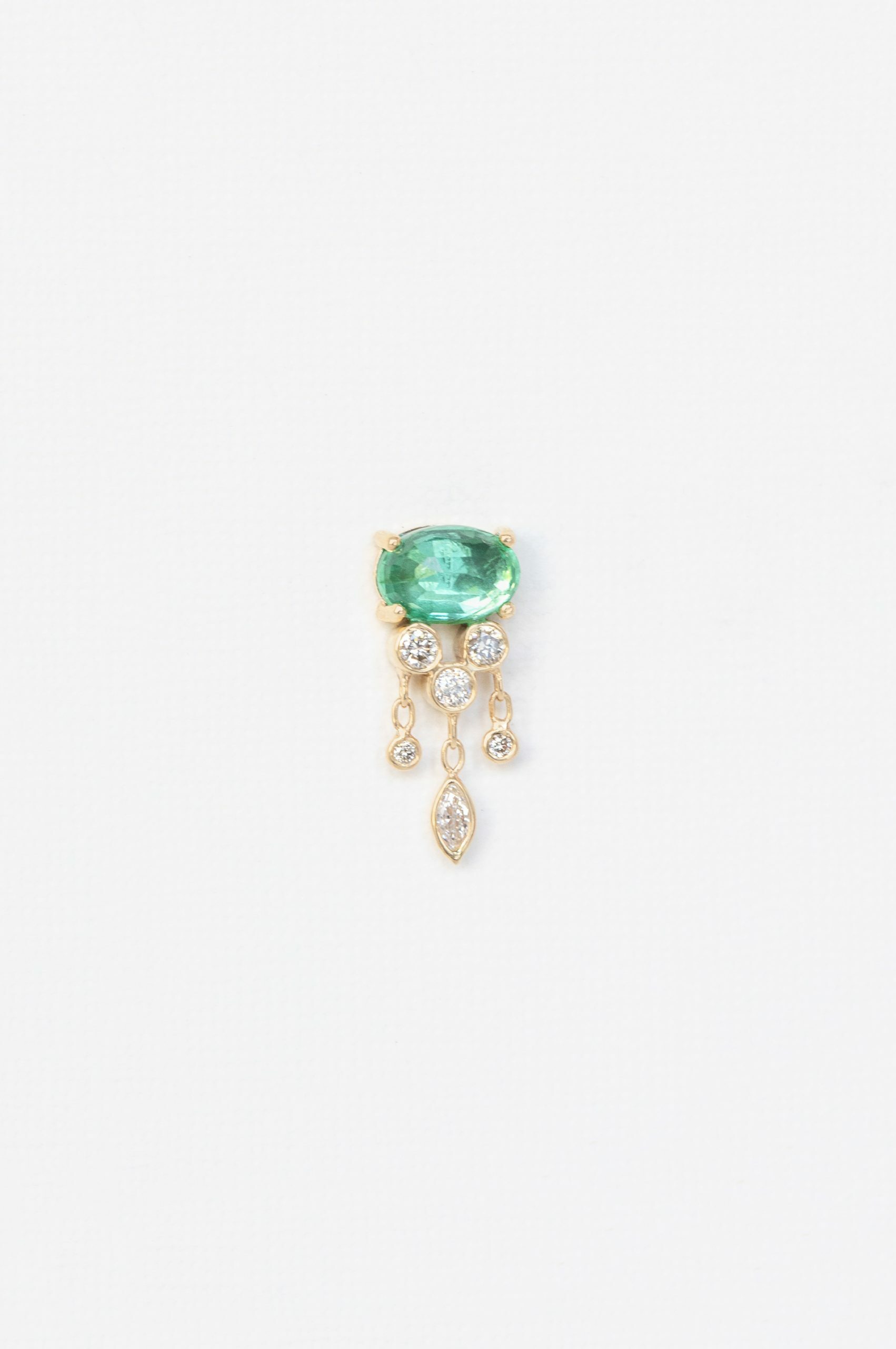 Celine Daoust 14k light yellow gold jellyfish earring with one light green emerald & dangling diamonds. The stone comes in gradients of vivid green.