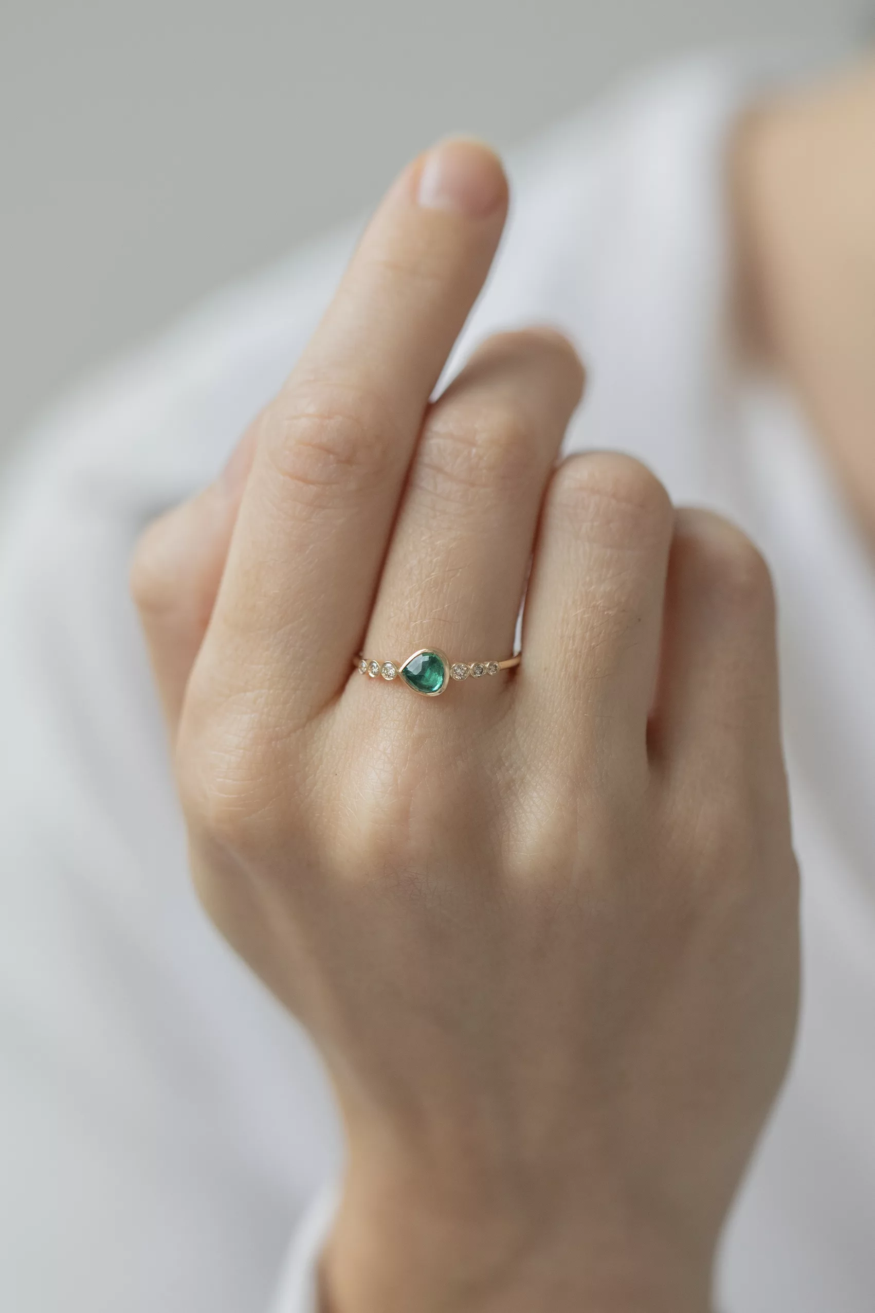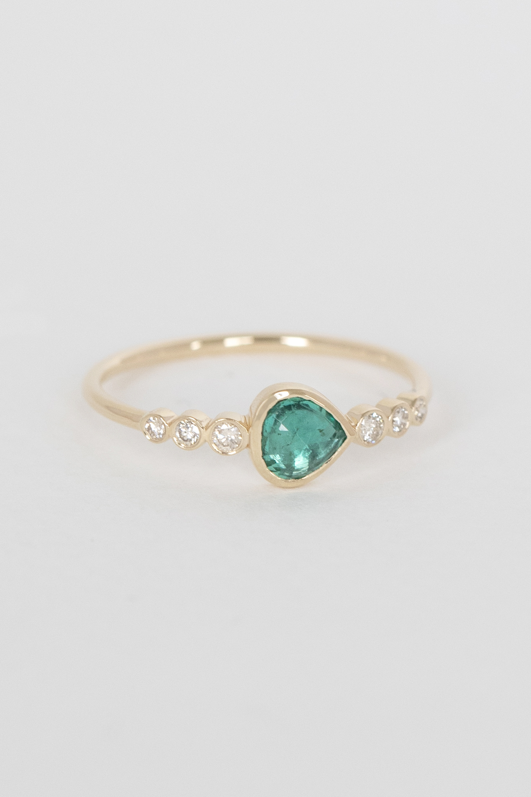 Celine Daoust 14k light yellow gold with one central square emerald and six diamonds. The stone comes in an intense green.