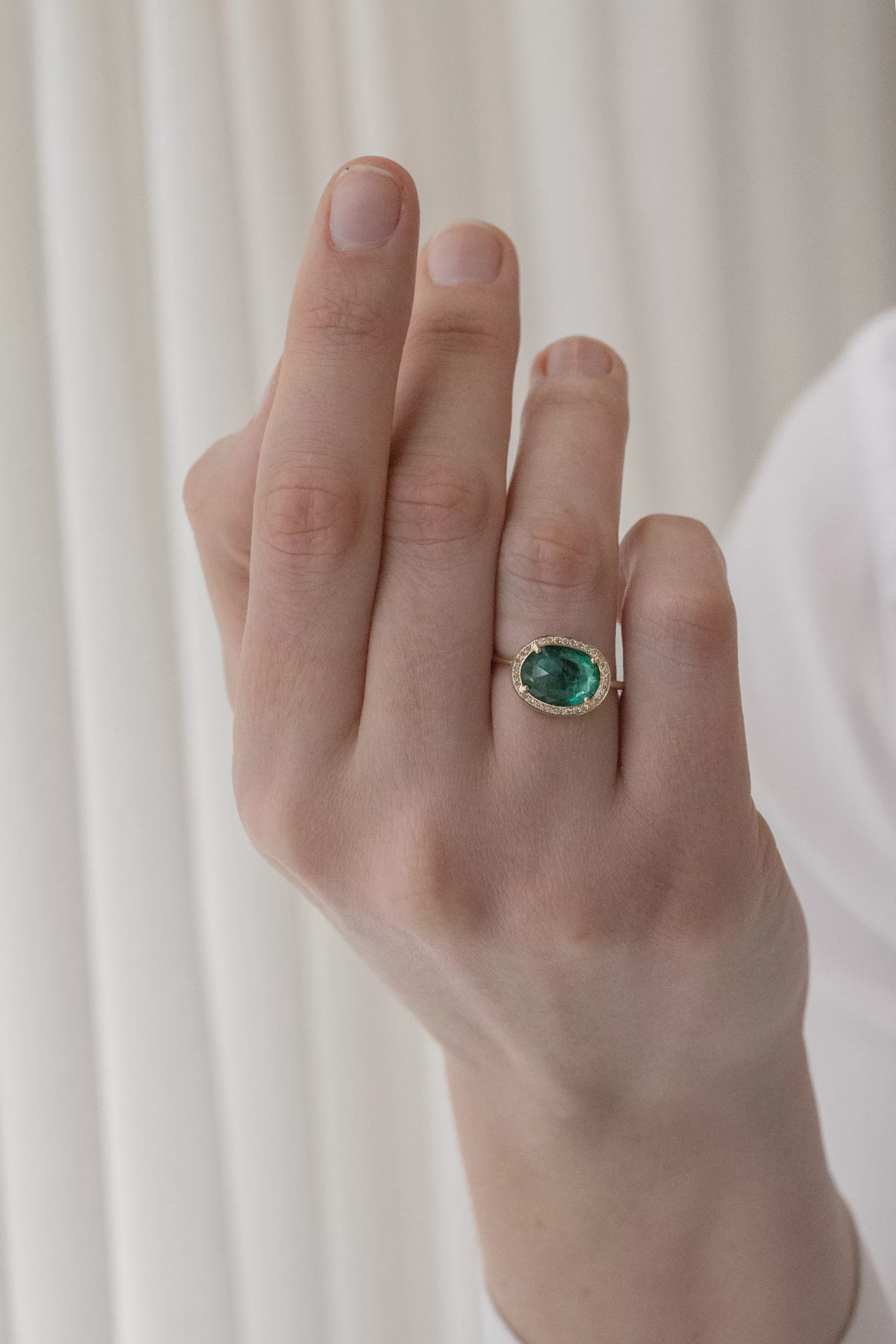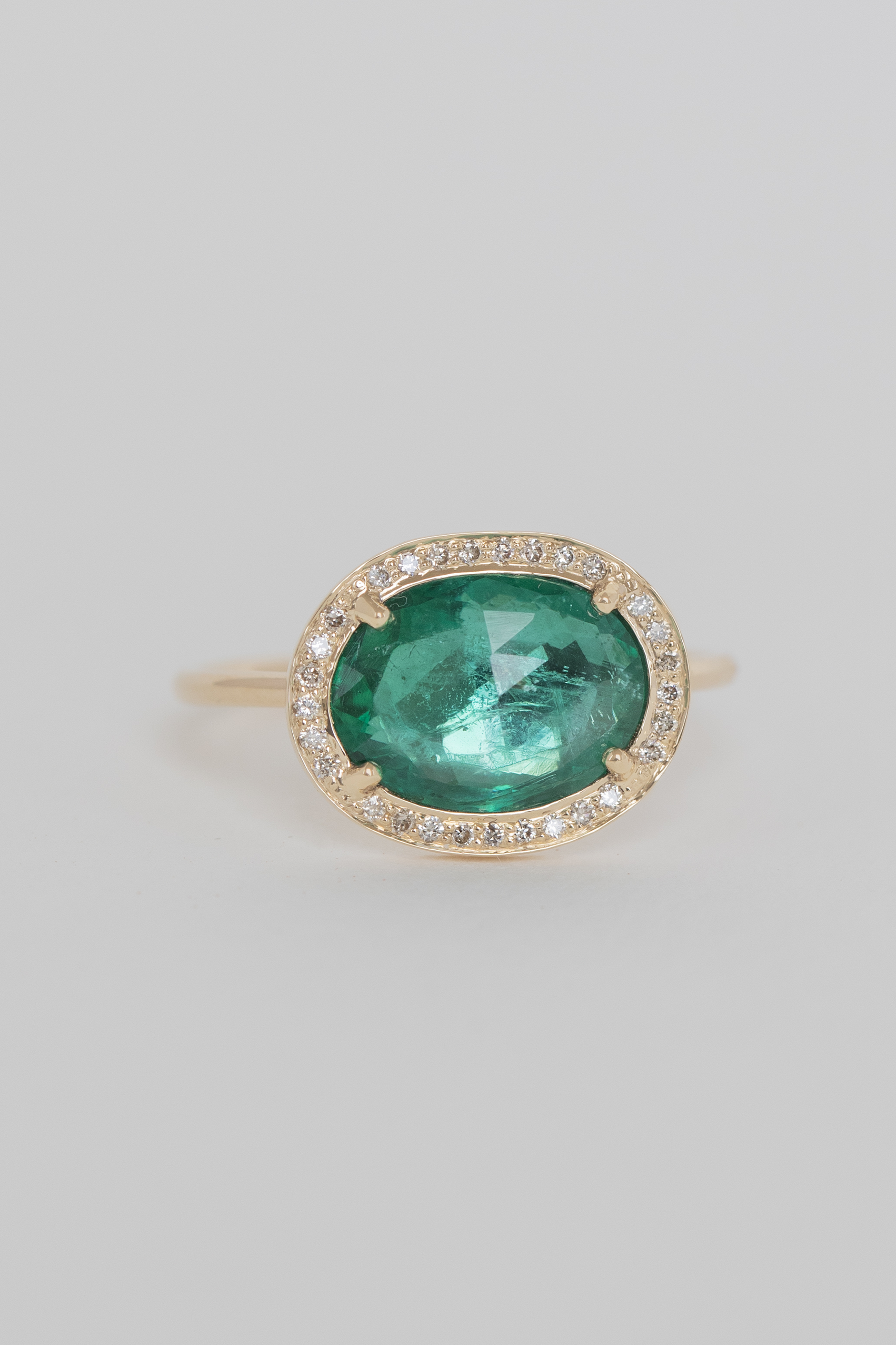 Celine Daoust 14k light yellow gold ring with one emerald surrounded by diamonds. The stone comes in a gradient of vivid green.