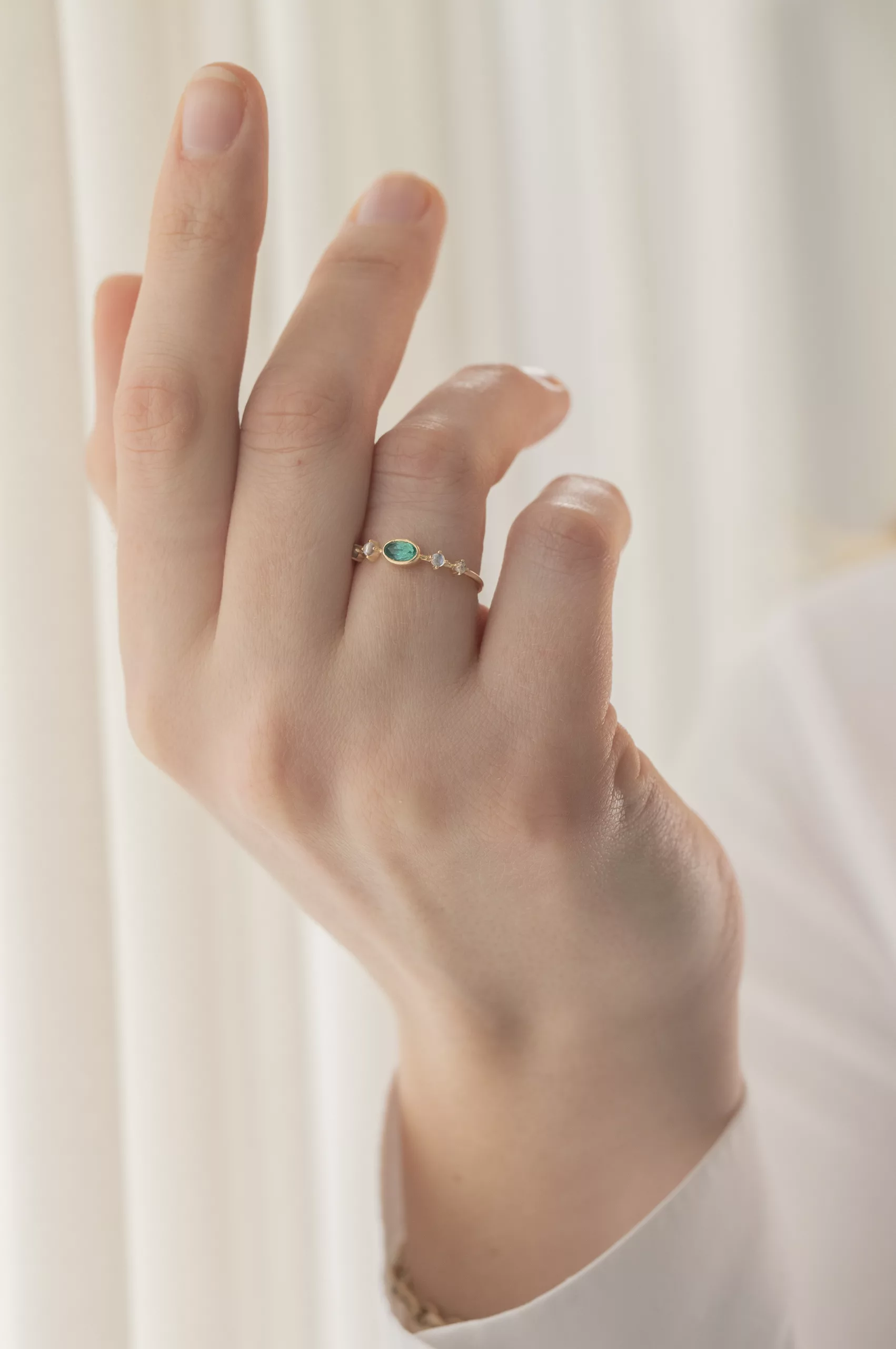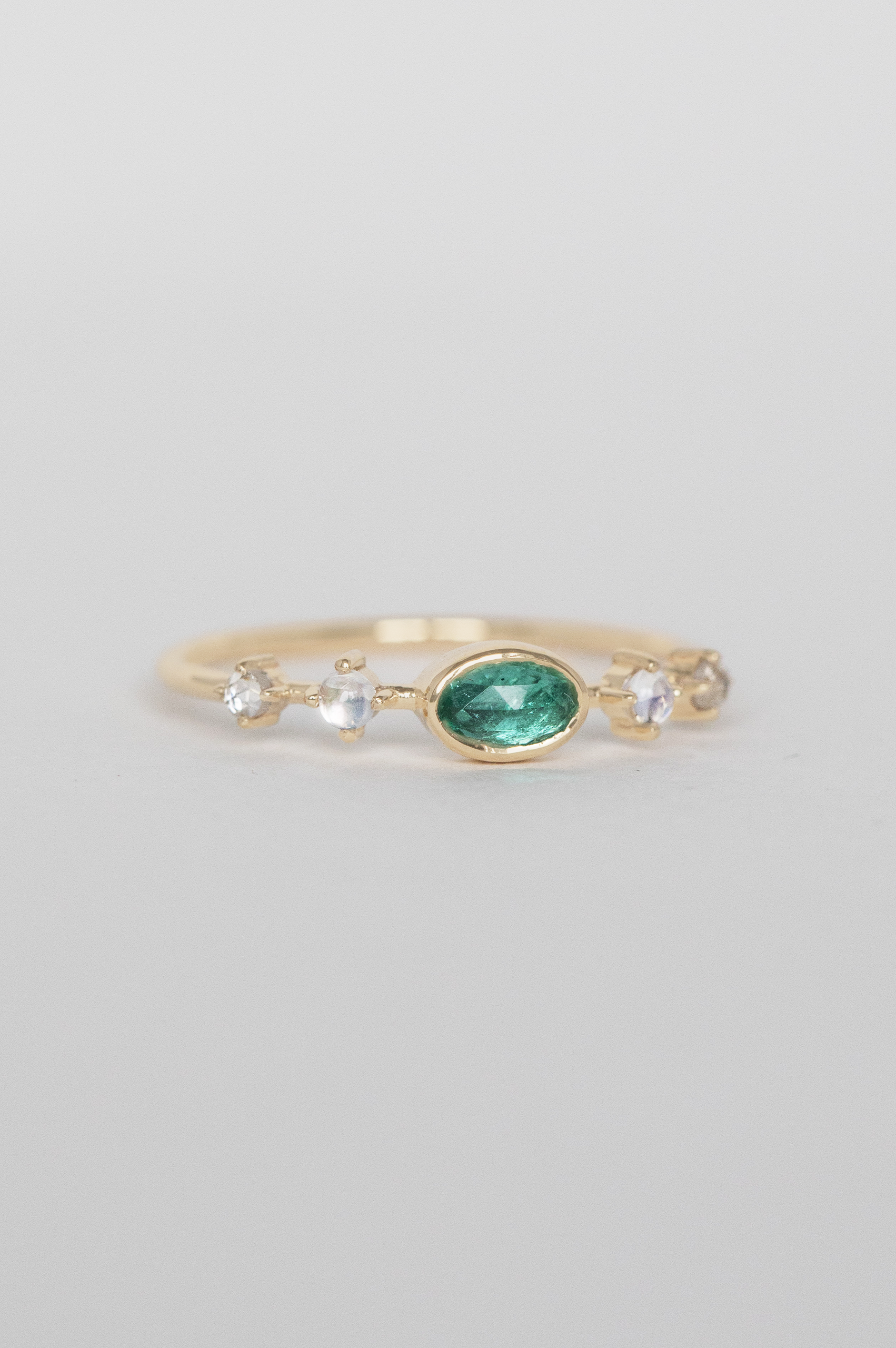 CELINE DAOUST 14K LIGHT YELLOW GOLD RING WITH ONE CENTRAL EMERALD, TWO MOONSTONES, AND TWO DIAMONDS. THE STONE COLOR IS AN INTENSE GREEN.