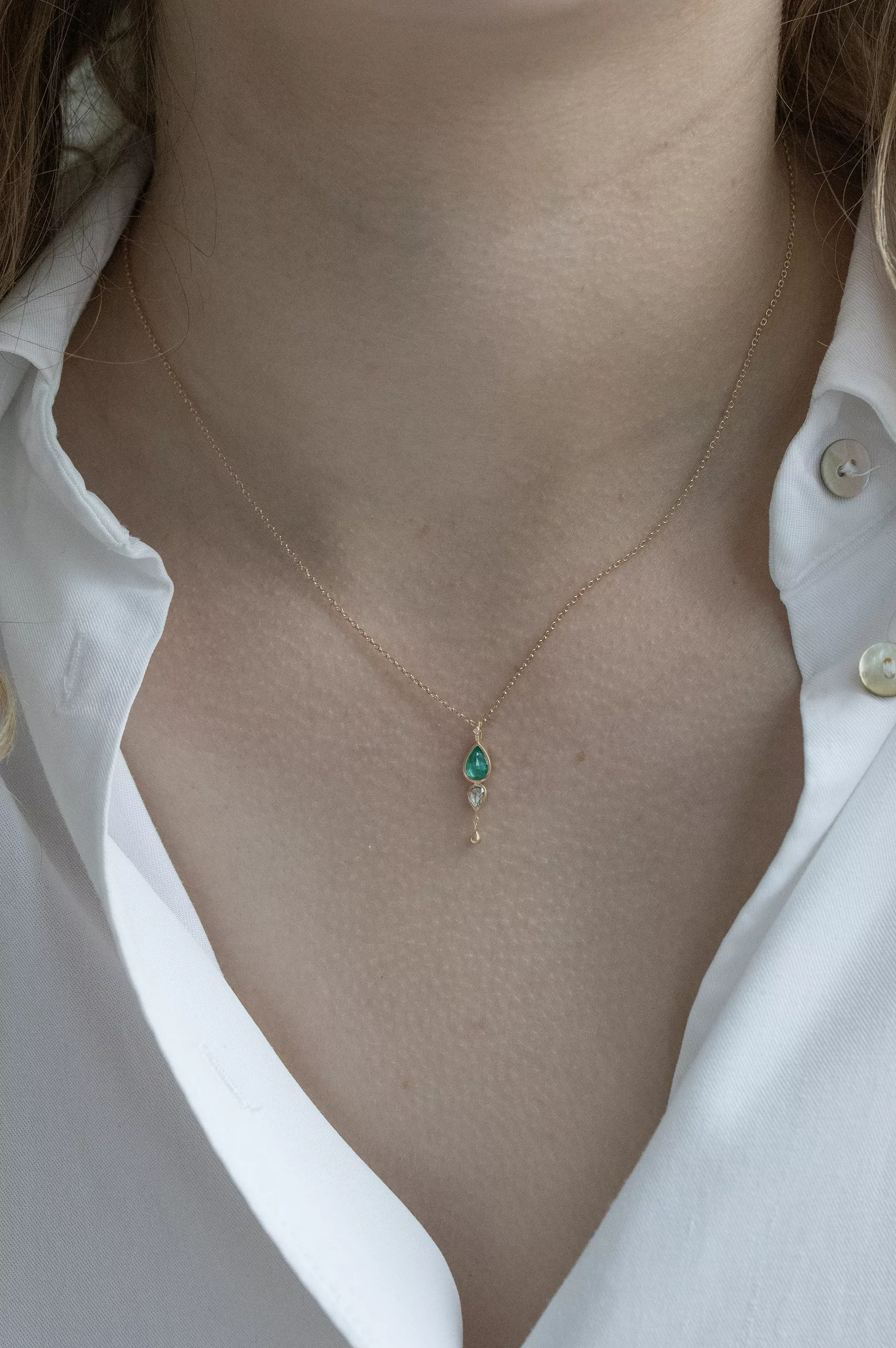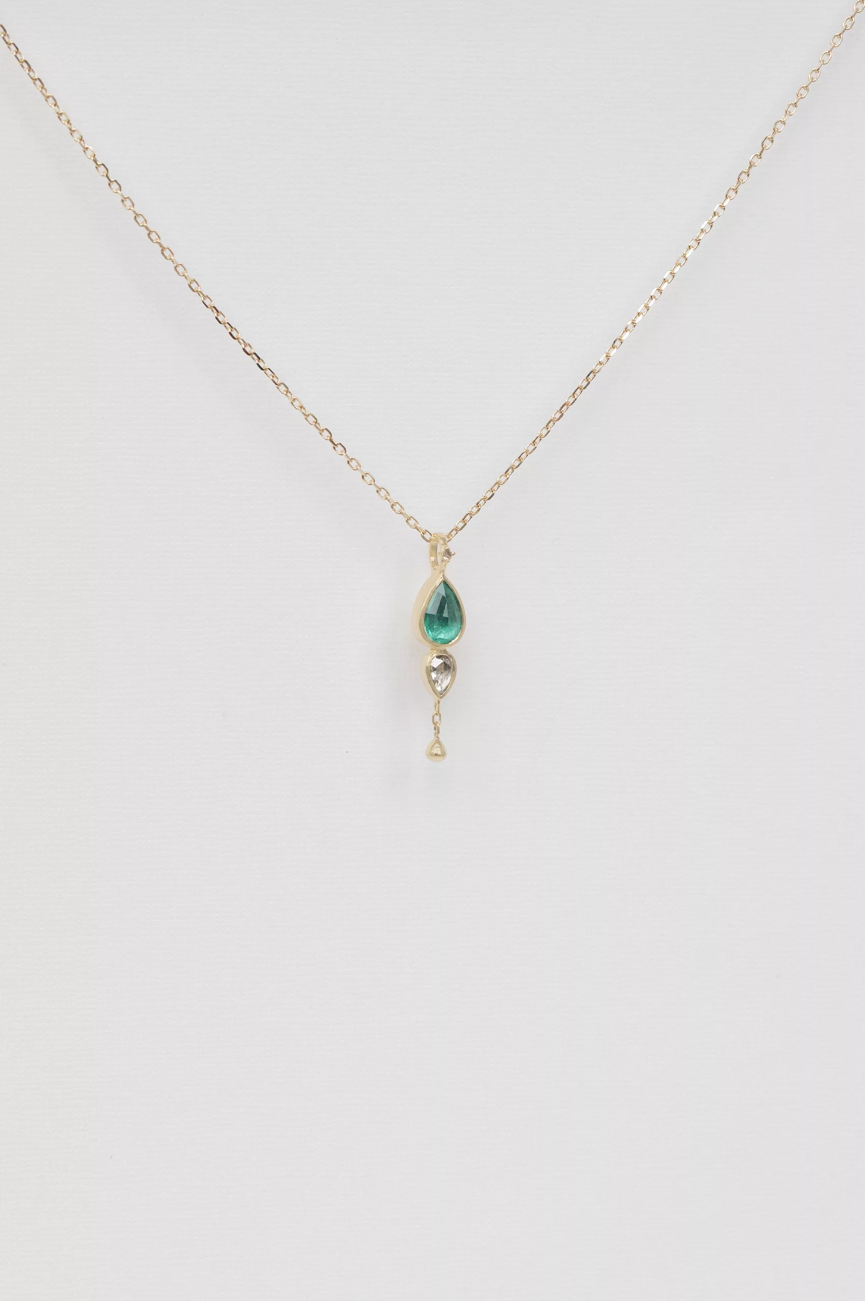 Celine Daoust 14k light yellow gold chain necklace with one emerald, one rose cut grey diamond, and dangling gold ball. The stone color is a vivid green.