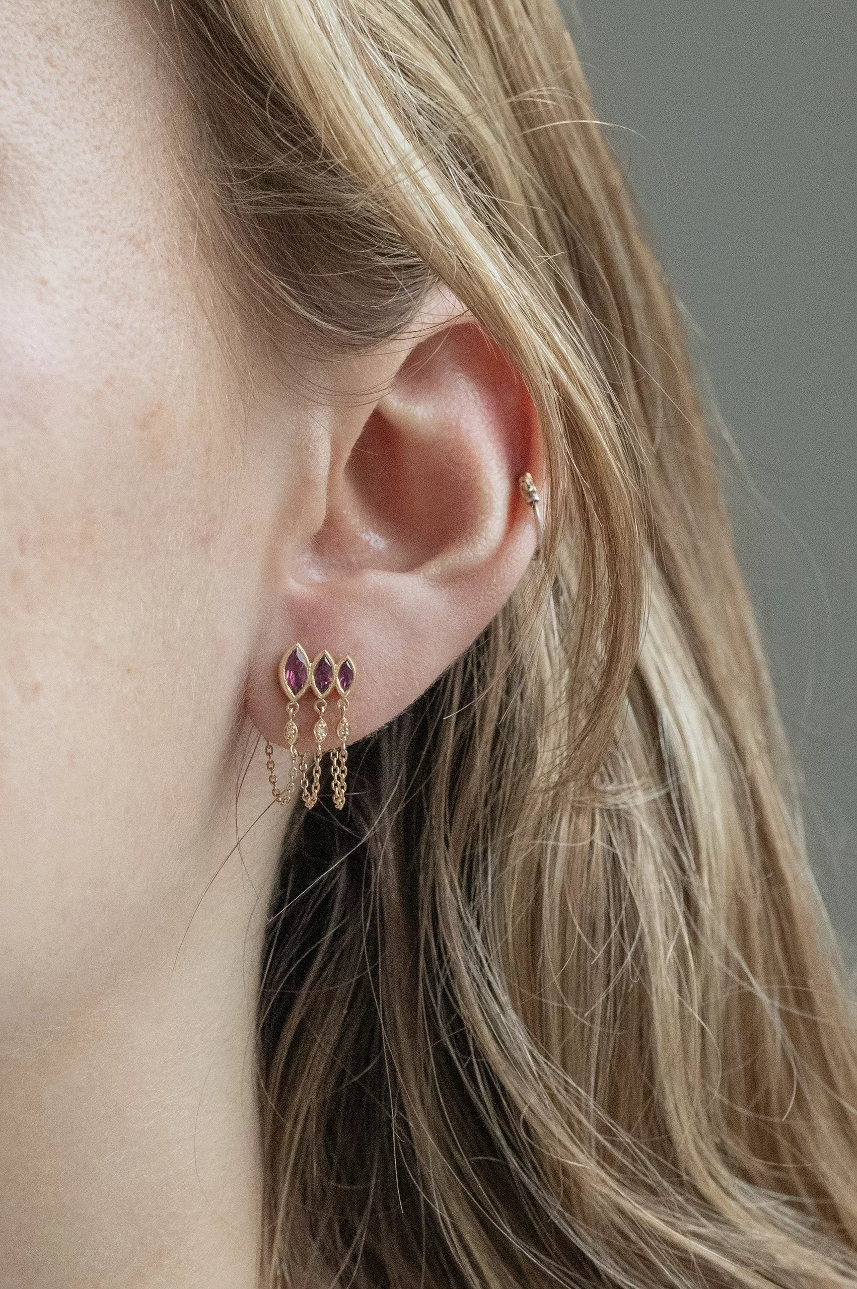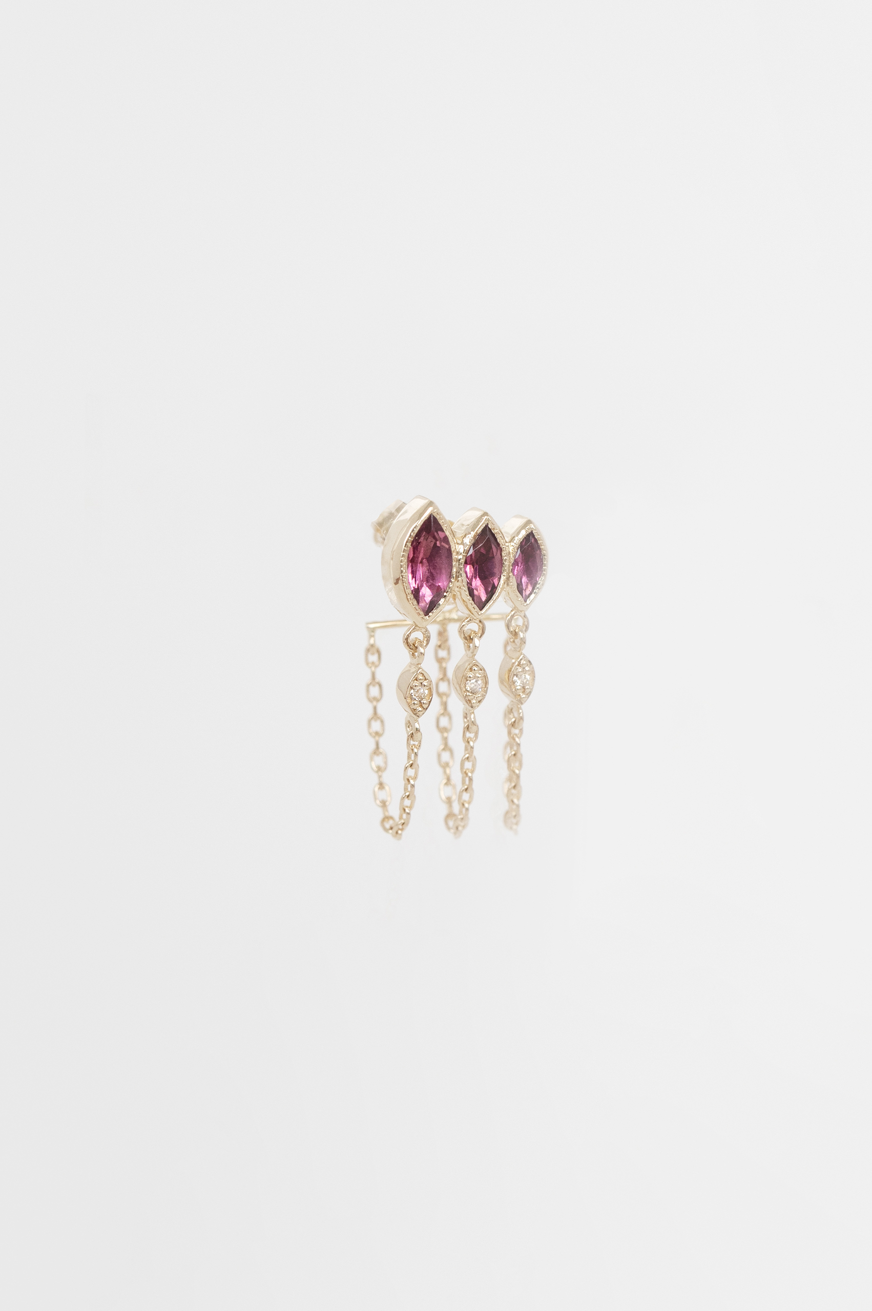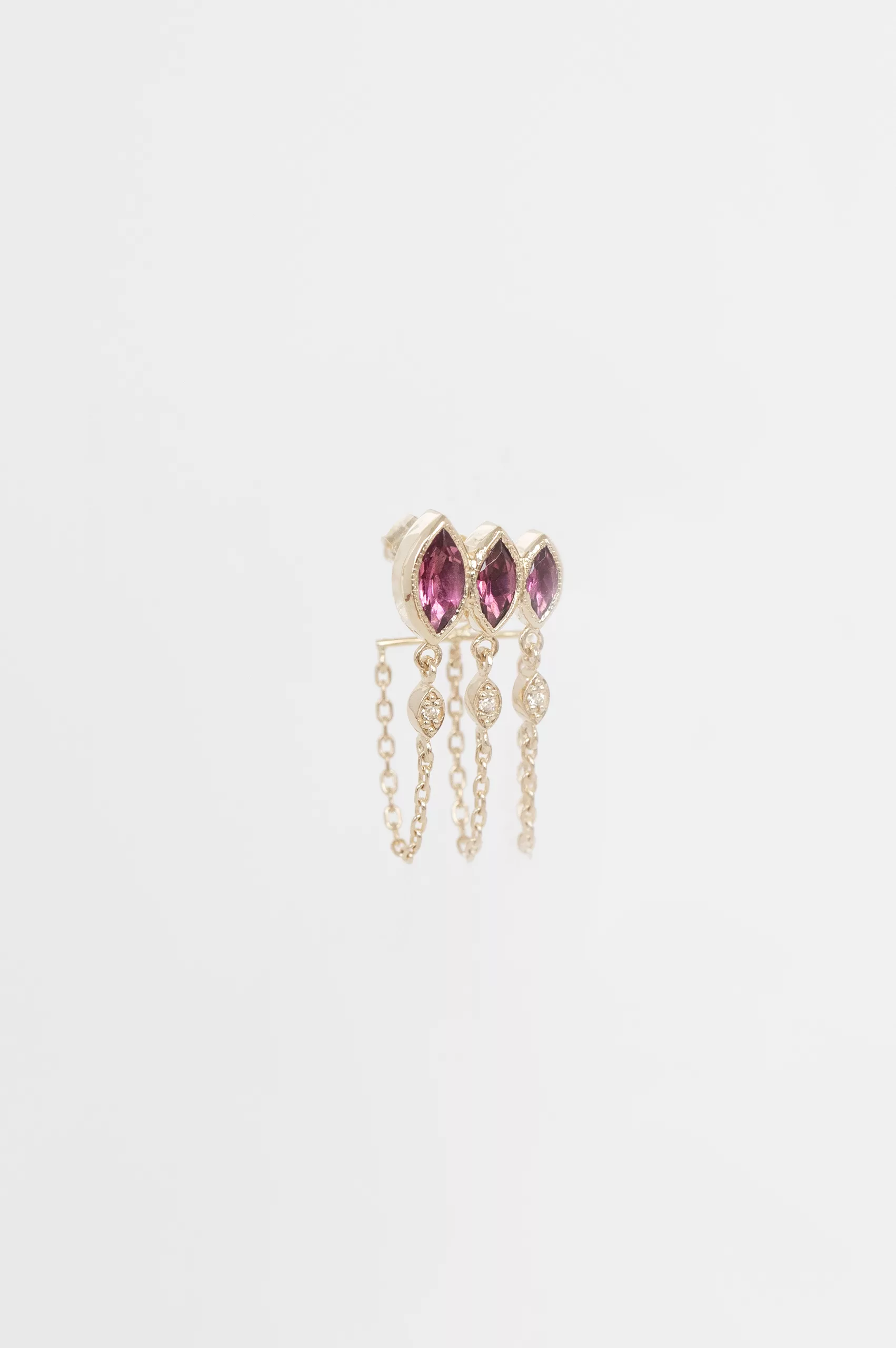 Céline Daoust 14k light yellow gold triple light pink marquise tourmaline single chain earring. The stone comes in a gradient of dark and fuchsia pink.