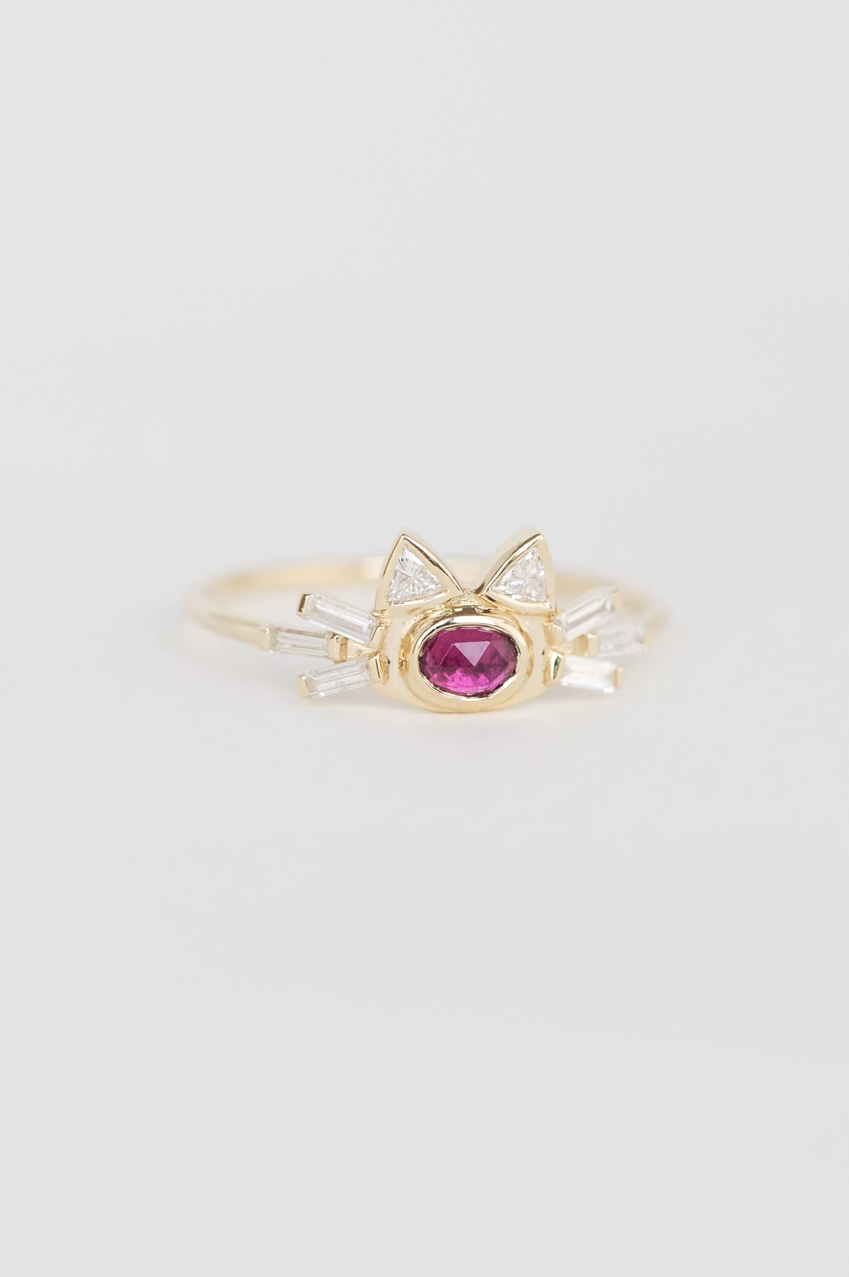 Céline Daoust 14k light yellow gold ring with one pink tourmaline, two trillian diamonds and baguettes diamonds. The stone comes in a gradient of dark and fuchsia pink.