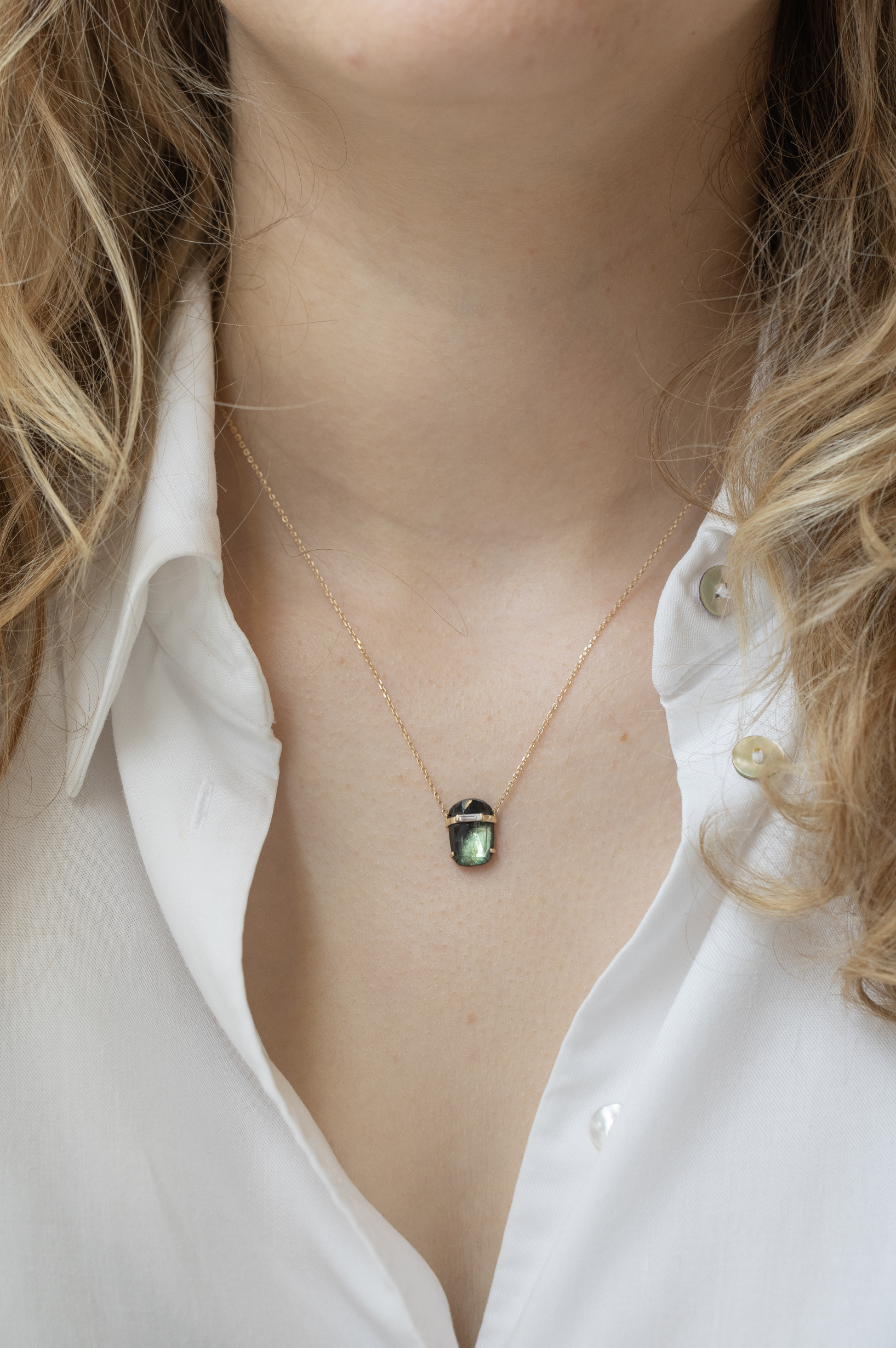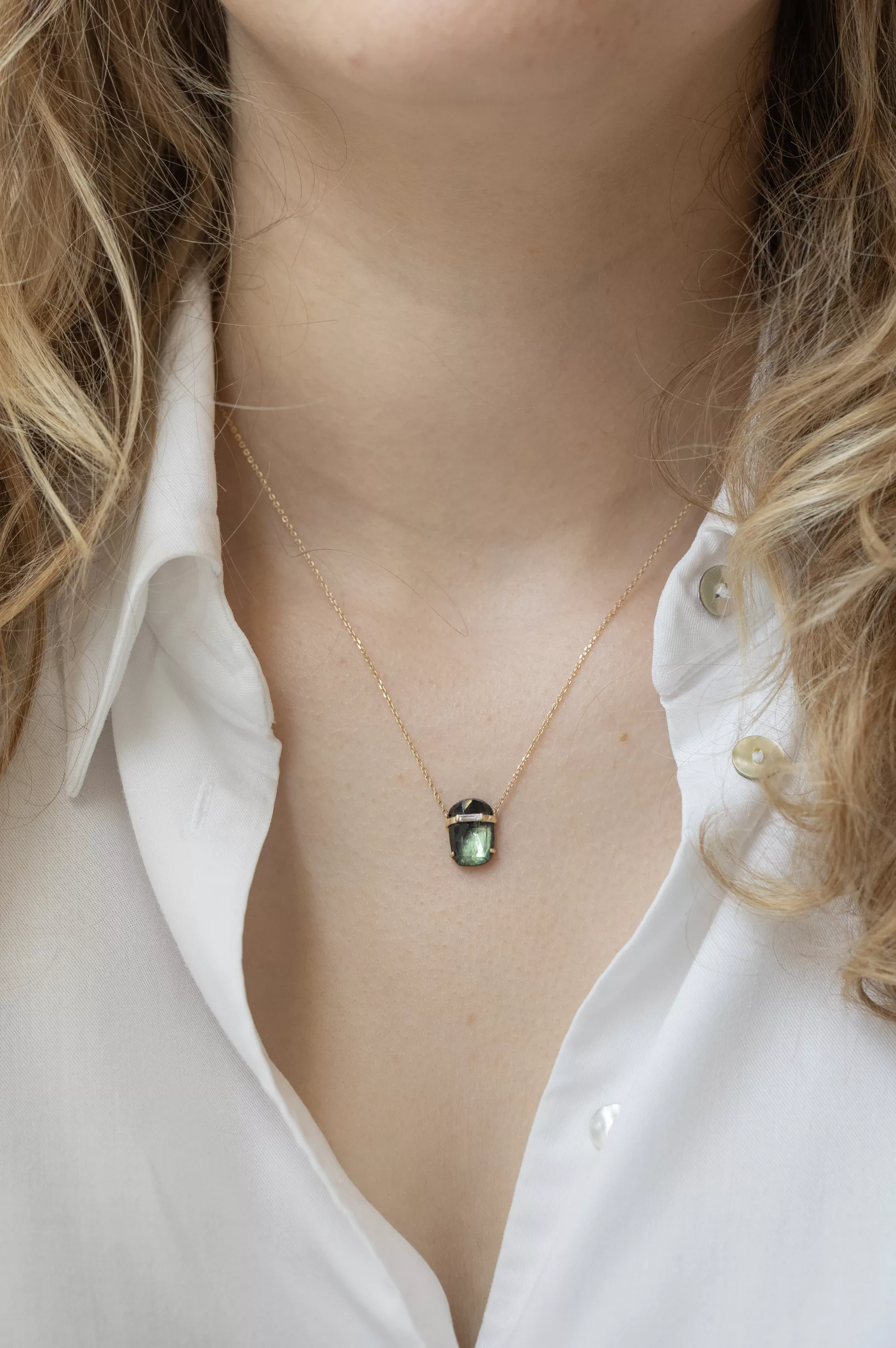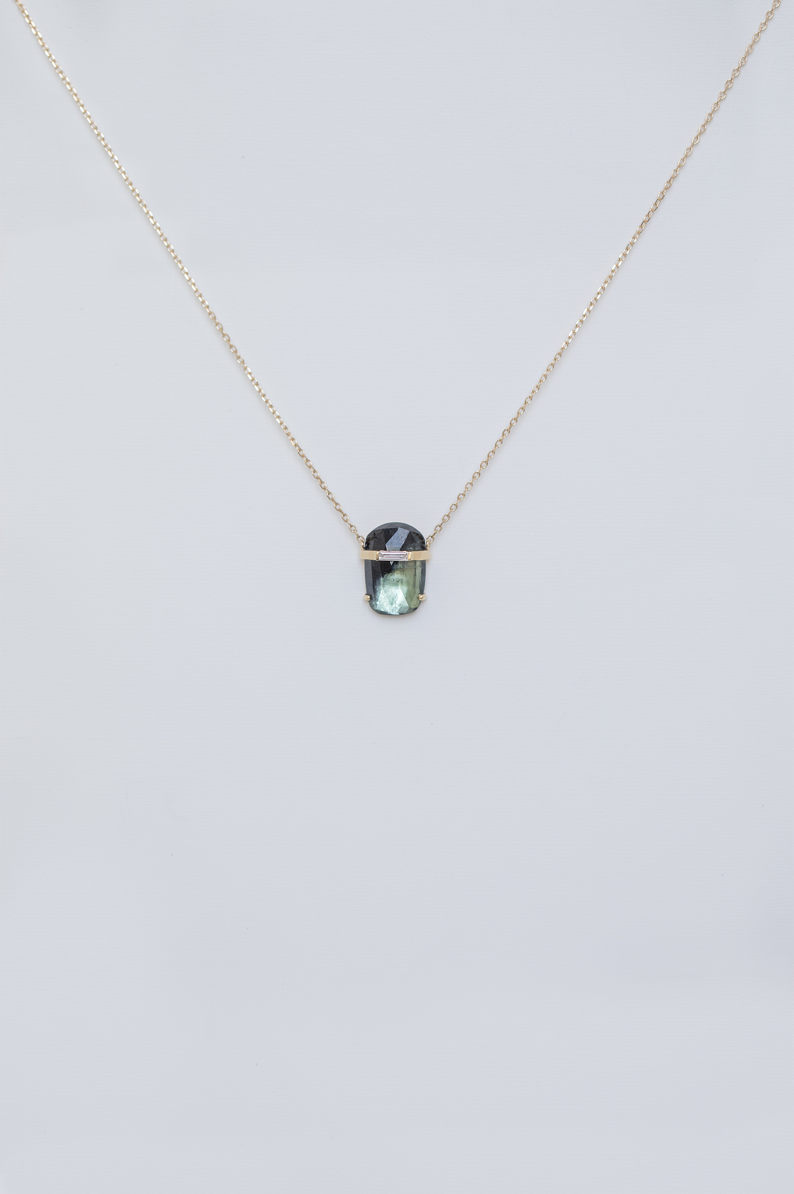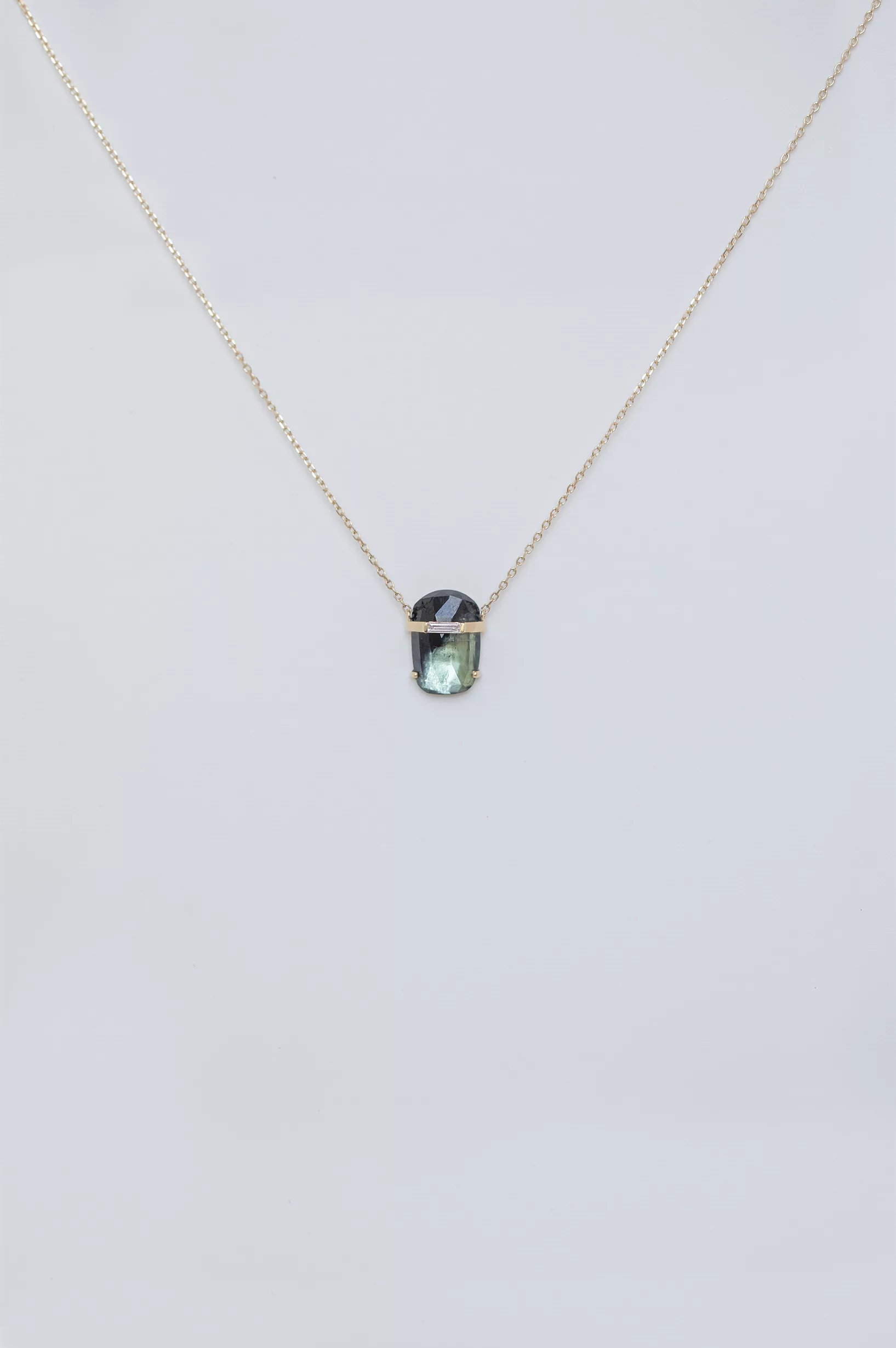 Céline Daoust 14kt light yellow gold necklace with one green baguet cut tourmaline with one baguet diamond. The stone comes in a gradient of light and dark green.
