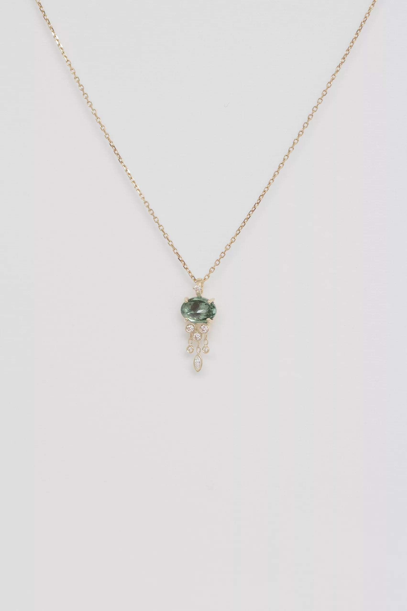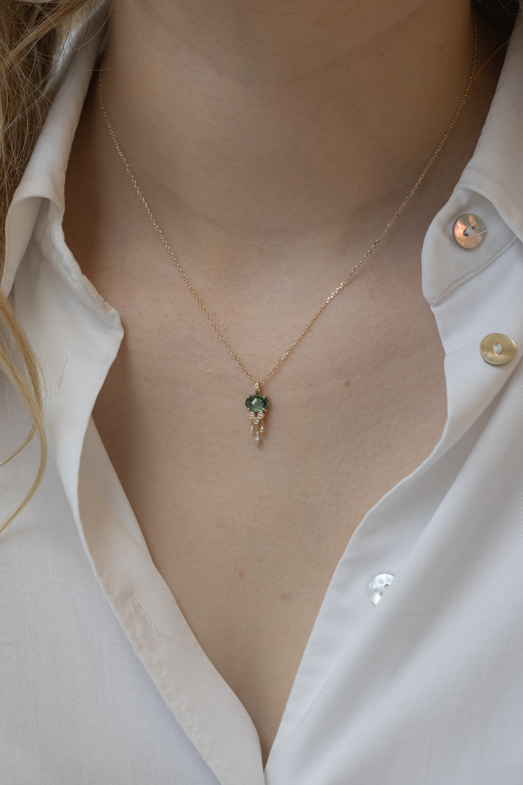 Celine Daoust 14k light yellow gold chain jellyfish necklace with one green tourmaline and dangling diamonds. The stone comes in shade of green and turquoise.