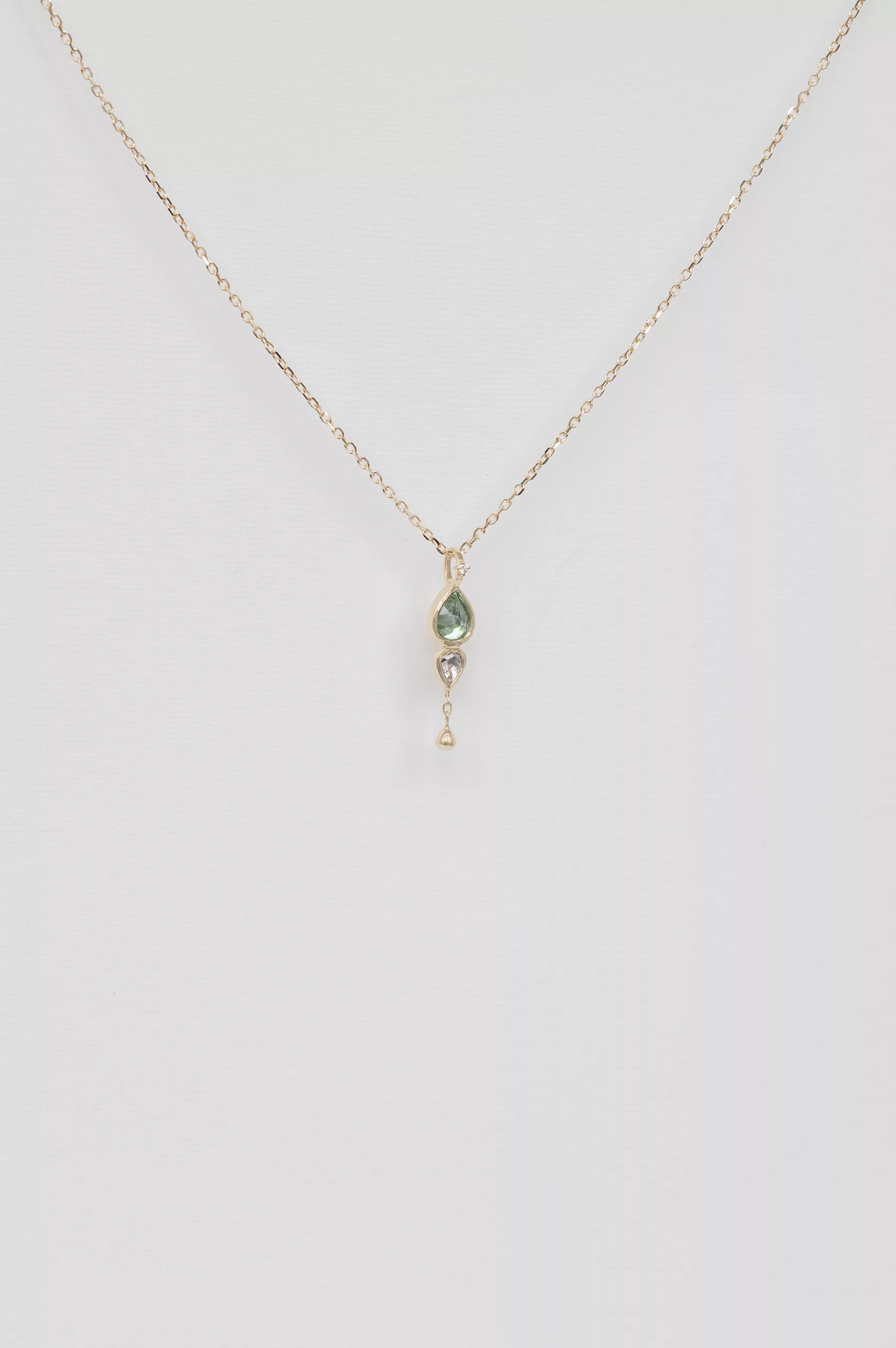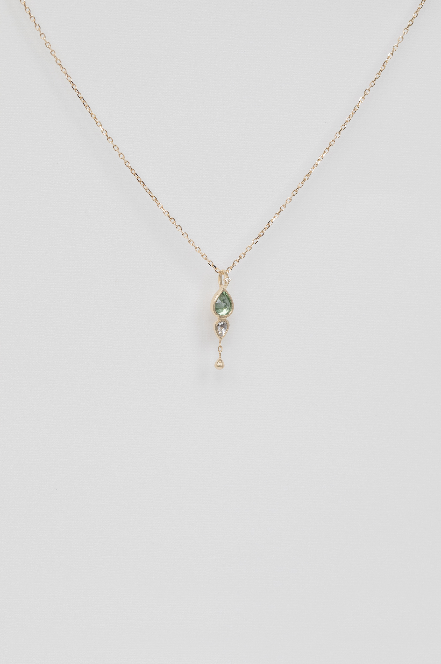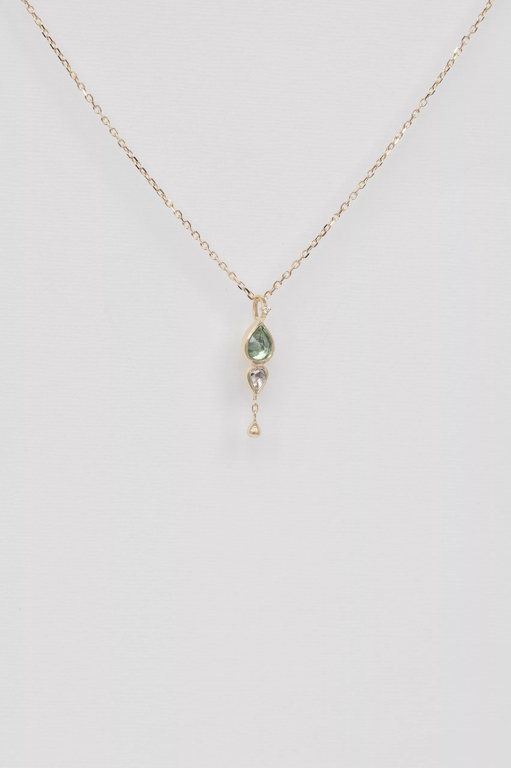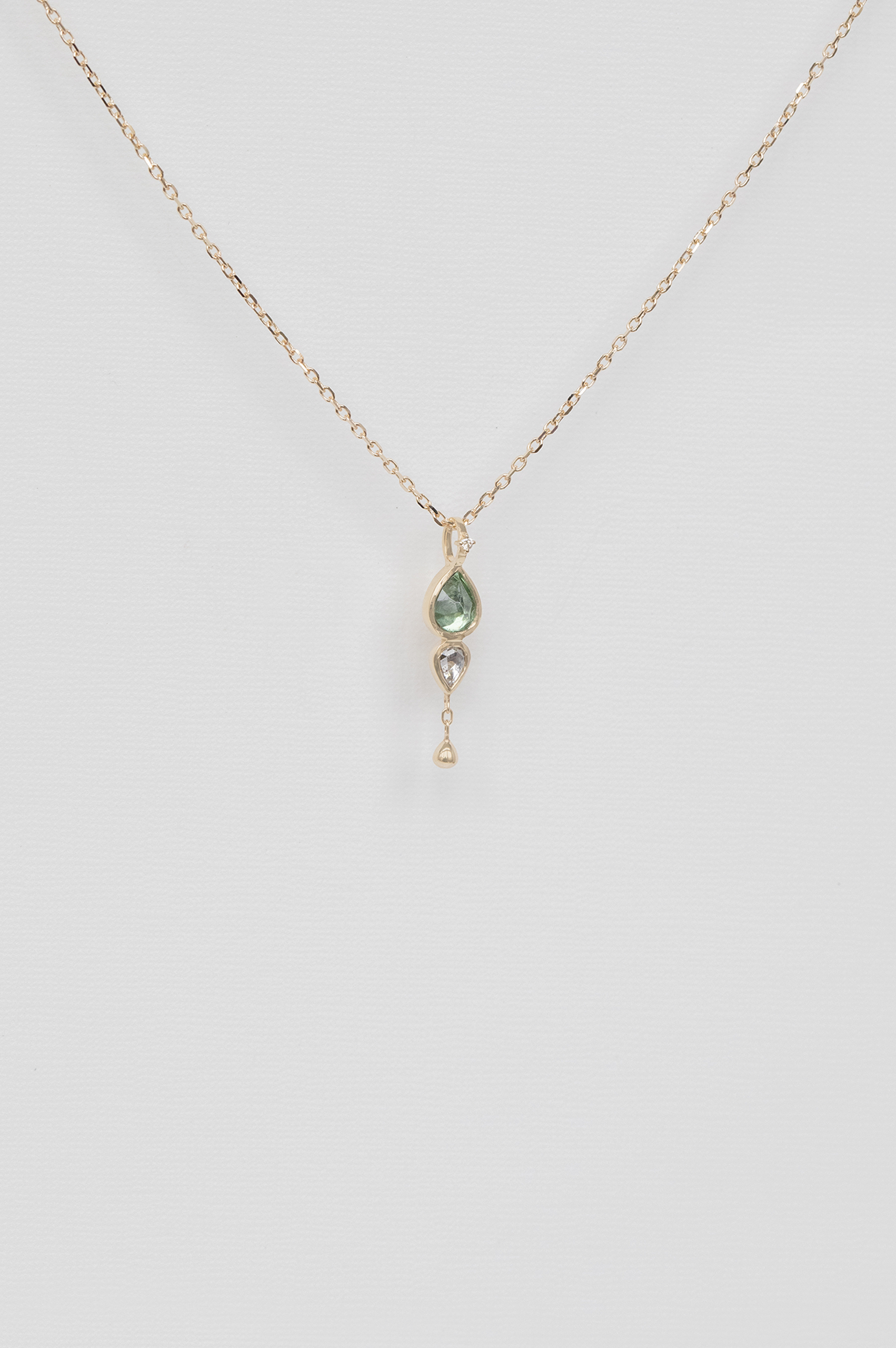 Celine Daoust 14k light yellow gold chain necklace with one blue tourmaline & dangling grey diamond. The stone comes in gradient of green.