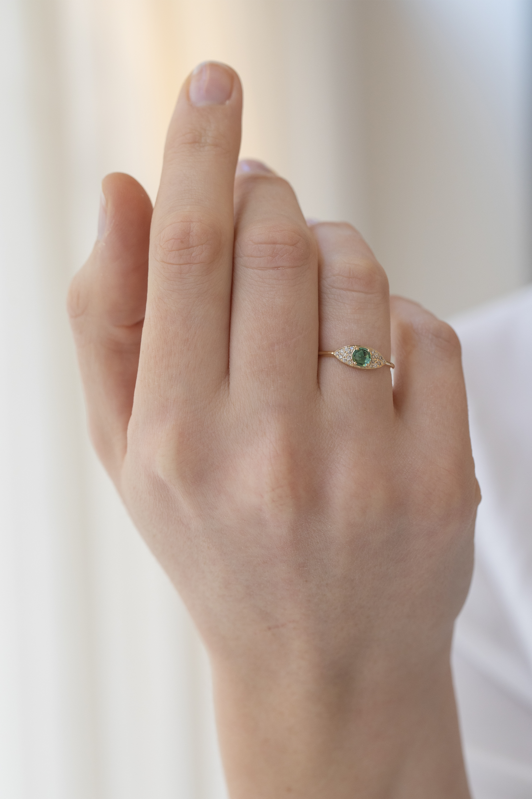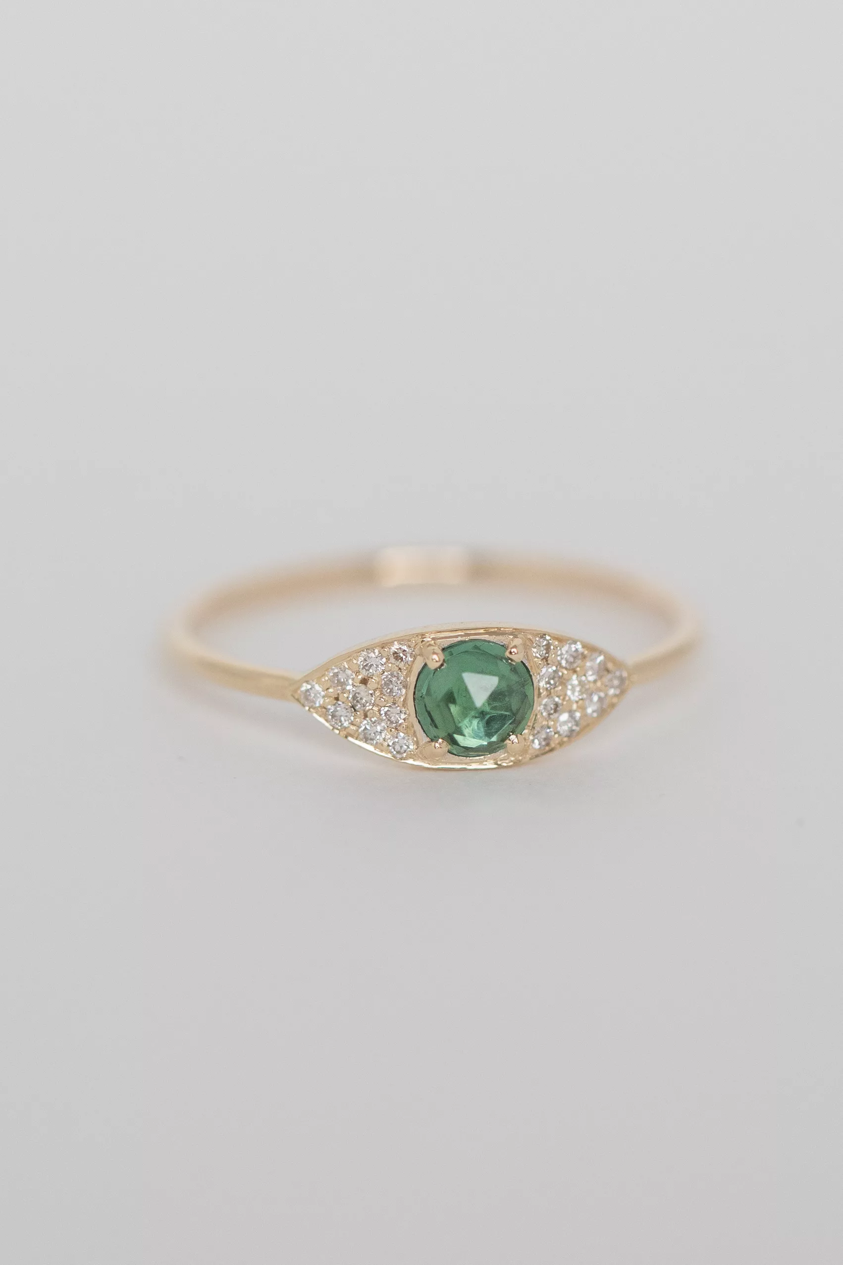 Céline daoust 14k yellow gold full eye ring with one green tourmaline and diamonds. The stone color is a gradient of green.