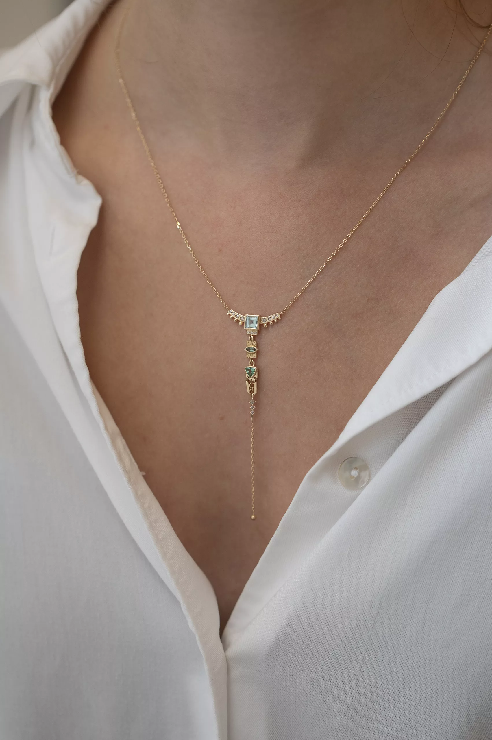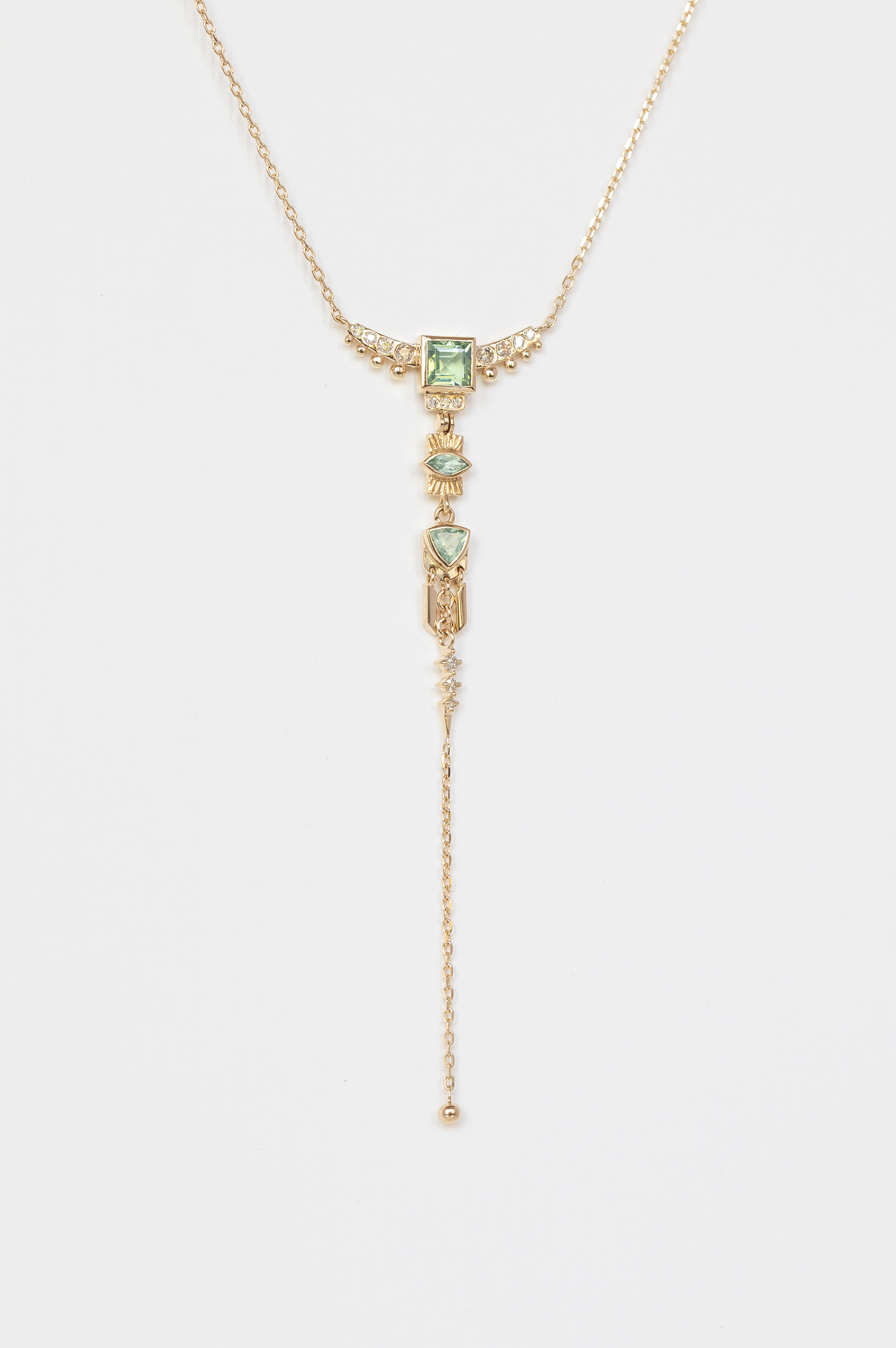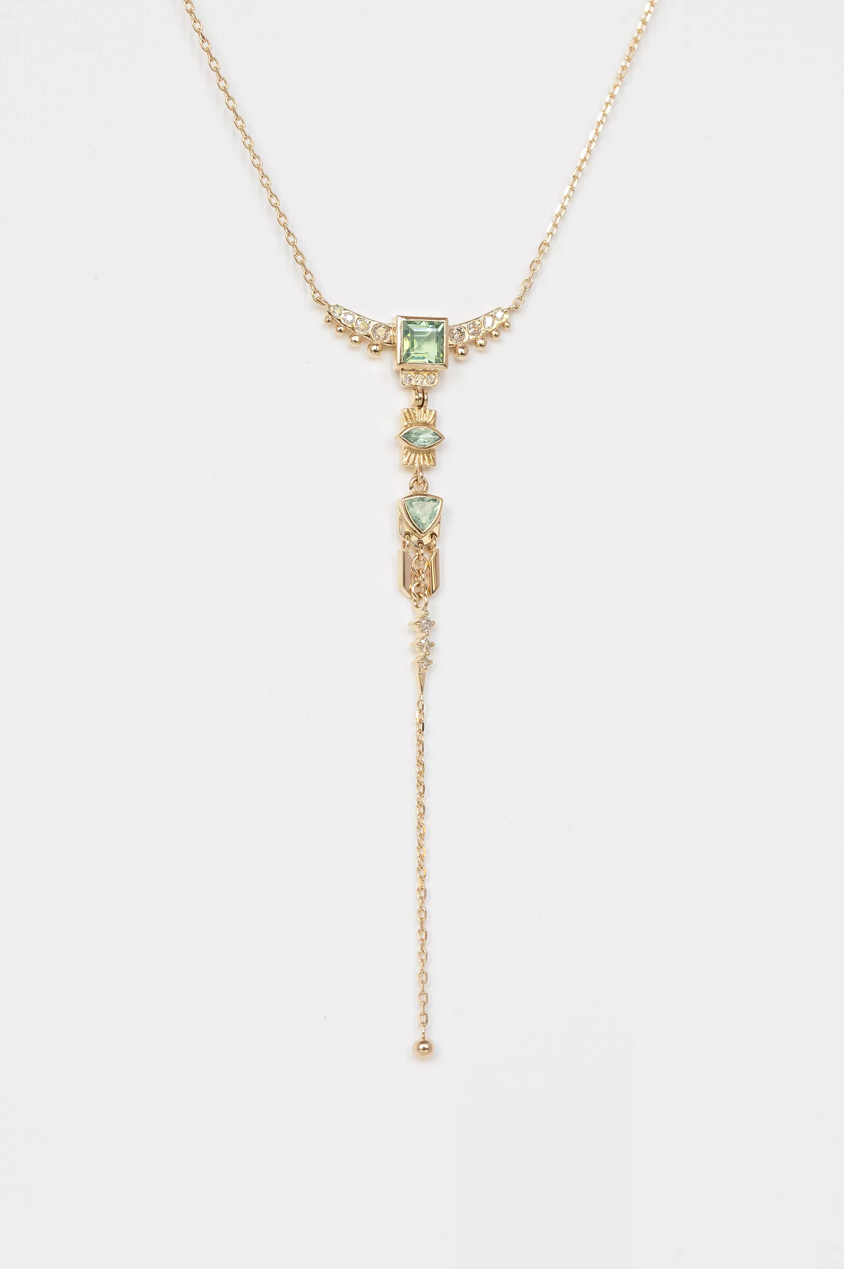 Celine Daoust 14k light yellow gold lariat pendant with 3 green tourmalines and diamonds with dangling details. The stone is a gradient of green and turquoise.