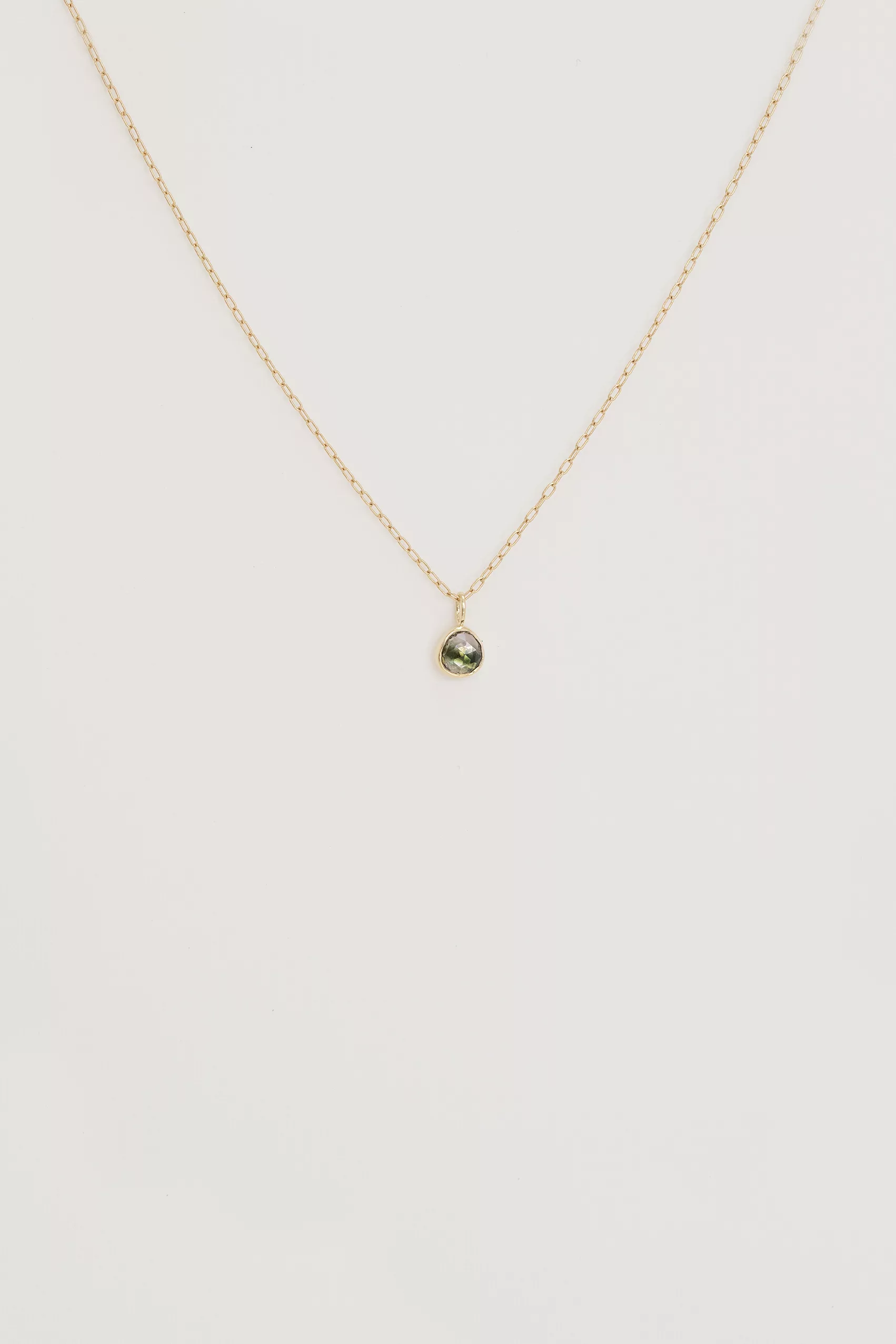 Celine Daoust 14k light yellow gold with one green tourmaline faye necklace. The stone comes in a gradient of green.