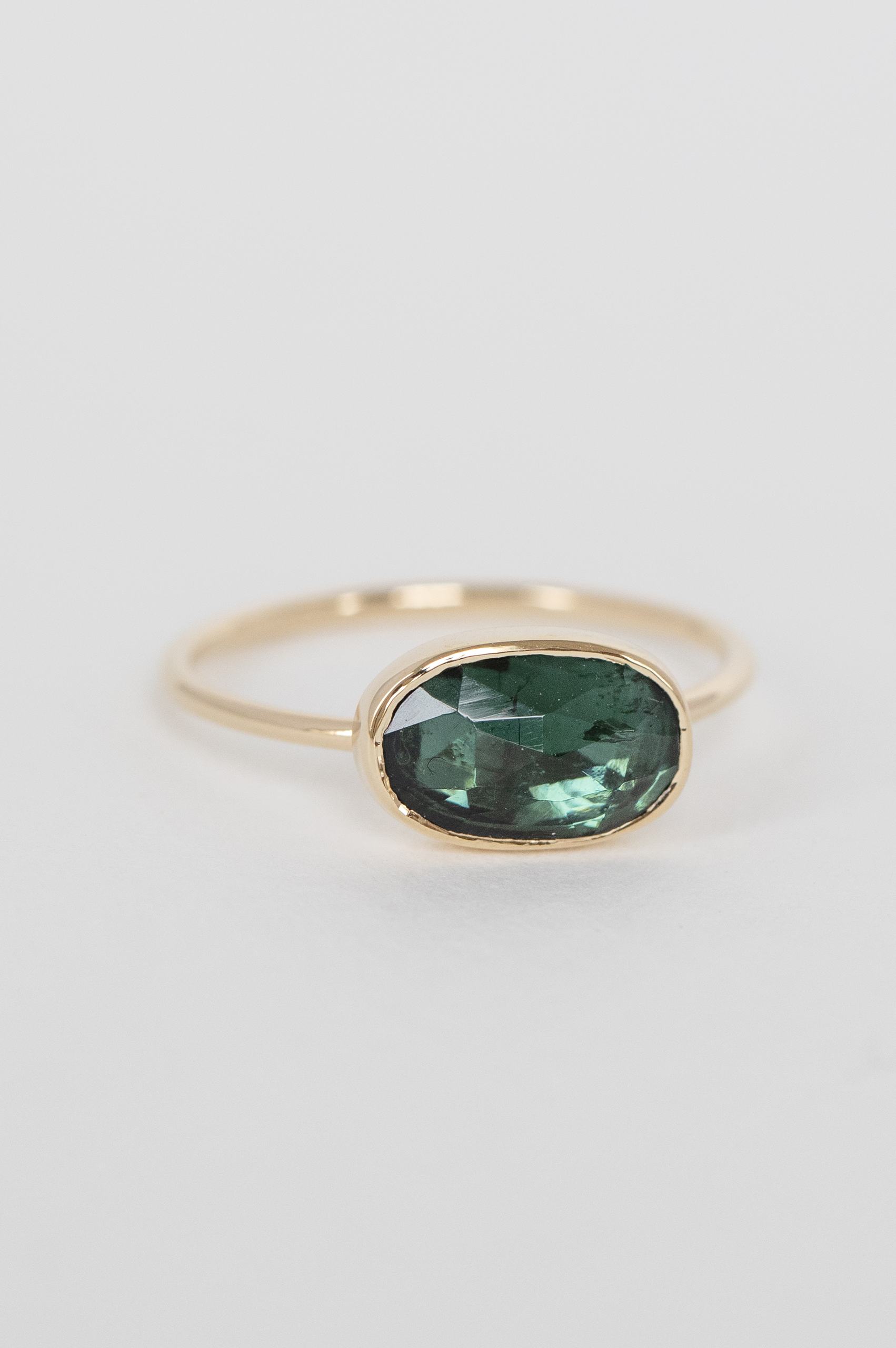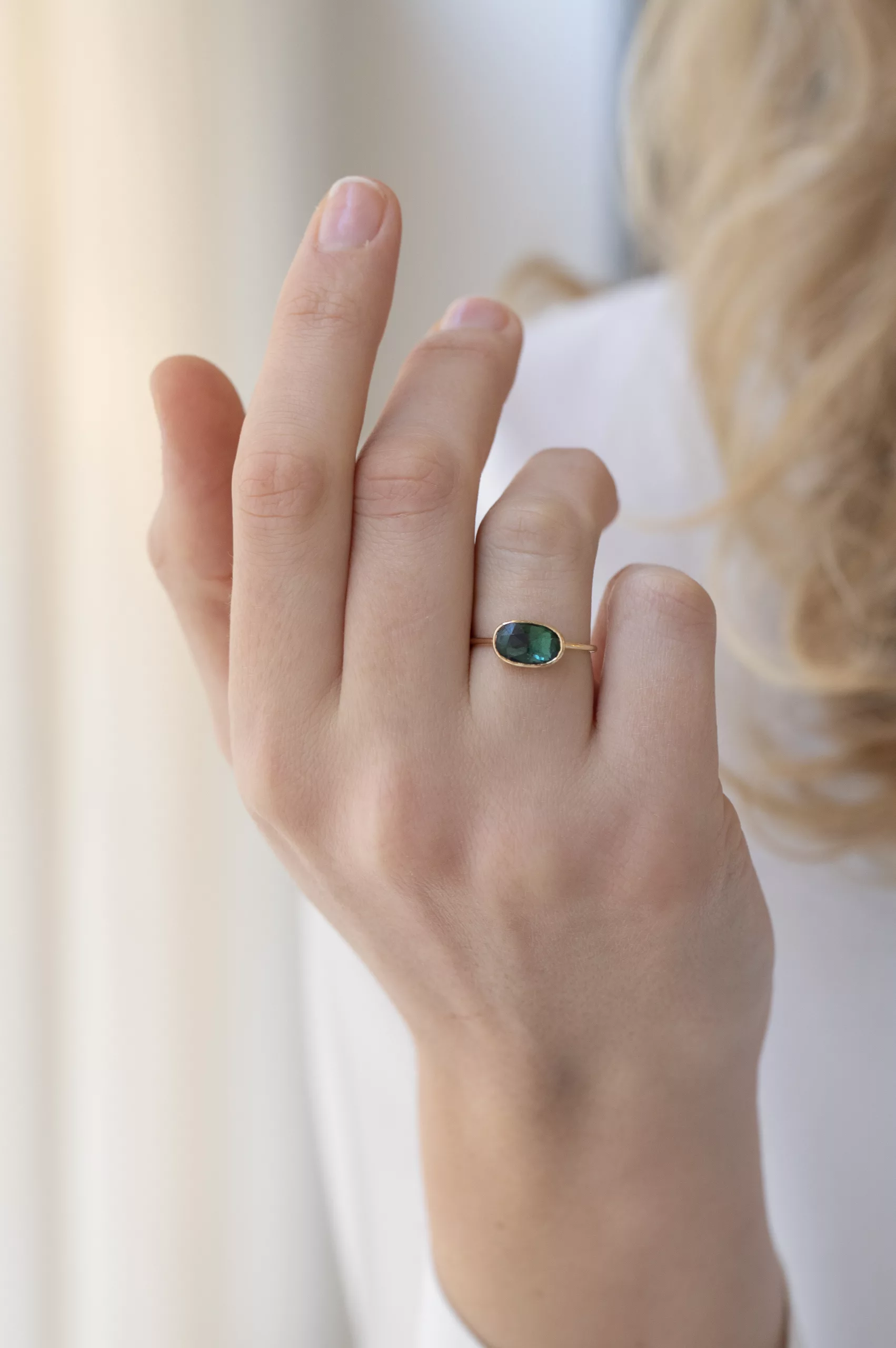 Celine Daoust 14k light yellow gold faye ring with one green tourmaline. The stone comes in a gradient of green.